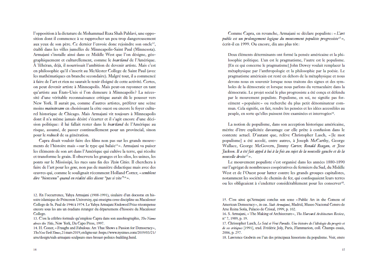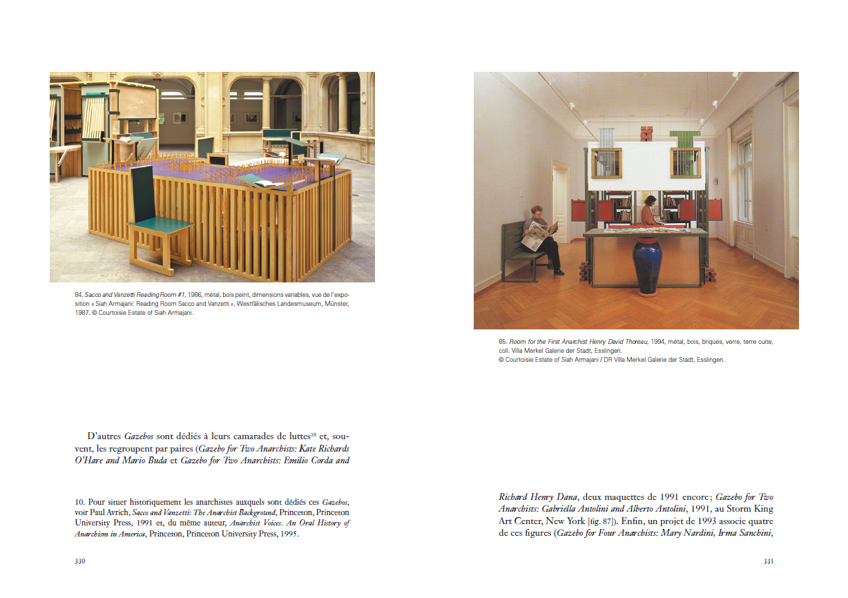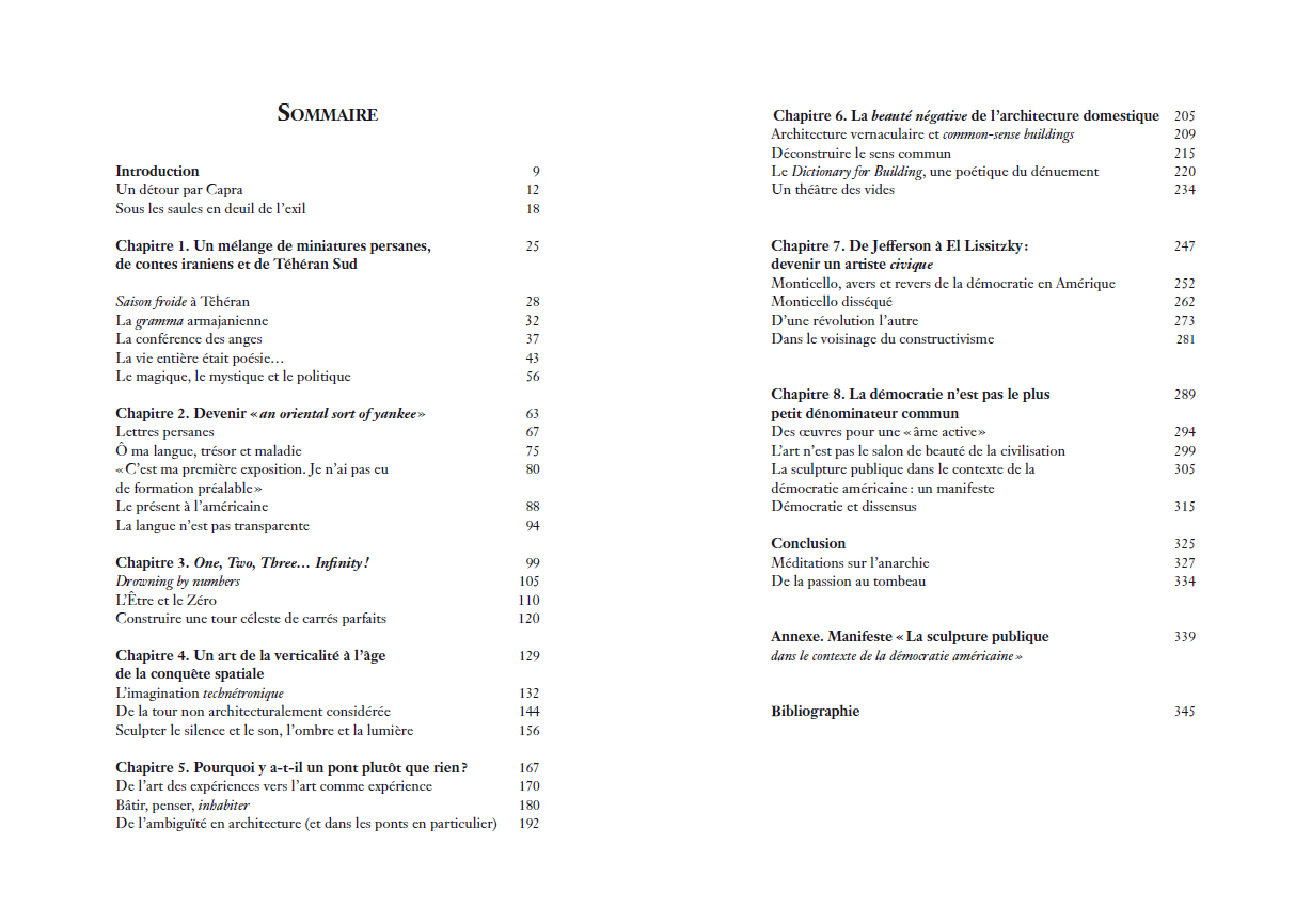 Une étude approfondie de l'élaboration des architectures-sculptures fonctionnelles de l'artiste américain d'origine iranienne, entre utopie et pragmatisme, allégorisant autant les idéaux que les contradictions de la démocratie américaine avant d'être dédiées à des figures de l'anarchie.