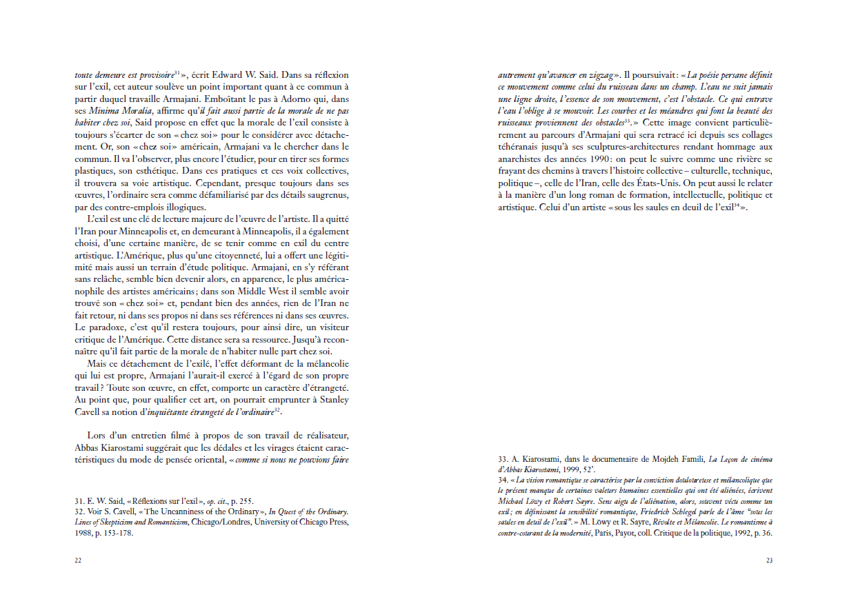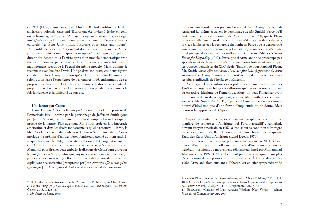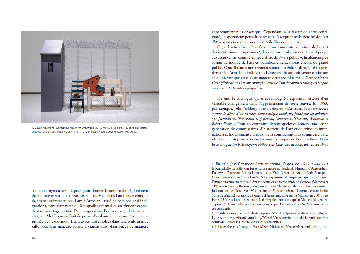 Une étude approfondie de l'élaboration des architectures-sculptures fonctionnelles de l'artiste américain d'origine iranienne, entre utopie et pragmatisme, allégorisant autant les idéaux que les contradictions de la démocratie américaine avant d'être dédiées à des figures de l'anarchie.