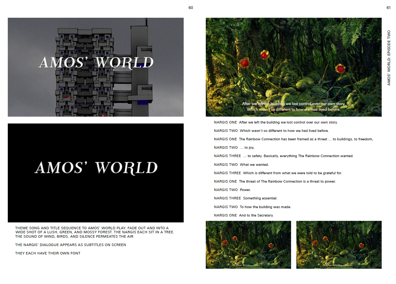 Amos' World (Le monde d'Amos) est une fiction sous forme de série télévisuelle qui raconte le destin d'un grand ensemble (bâtiment collectif à usage d'habitation) issu de la tradition architecturale de l'après-guerre à visée progressiste, de son architecte Amos, et des habitants de l'édifice. Forcés de constater que le bâtiment manque à ses promesses, les locataires vont se réapproprier la situation et retrouver leur capacité d'action, bousculant ainsi les ambitions de l'architecte qui s'imaginait avoir créé une structure articulant parfaitement espaces individuels et communs. Le monde construit par Amos commence à s'effondrer.