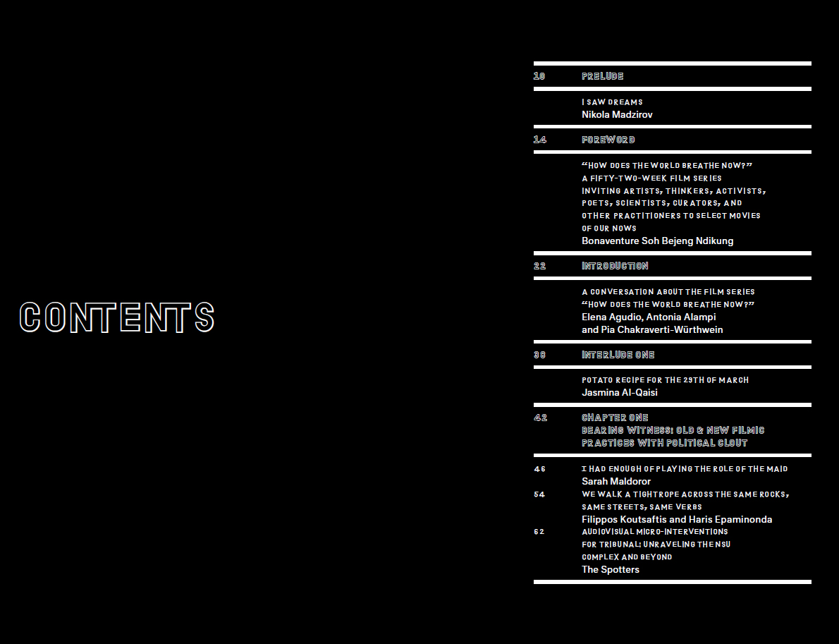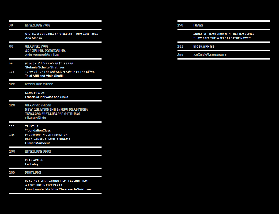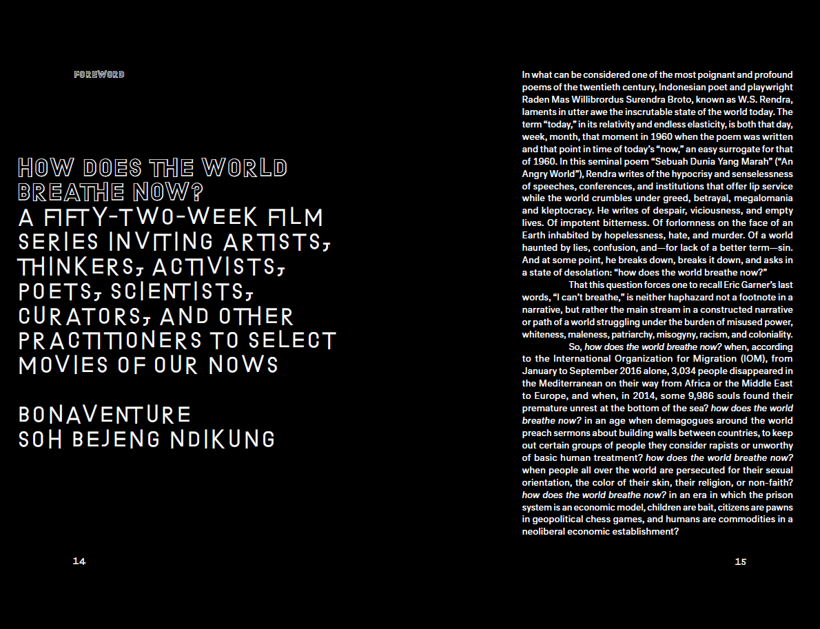 The film series conceived of by SAVVY Contemporary, which ran from September 2016 through March 2018, was a response to our own dismay at the continued injustices that the world faces. Each week SAVVY invited a different speaker who would choose a film that she or he felt answered, or asked more questions of, the question, "how does the world breathe now?" More than just a series of screenings, the film series became a kind of ciné-club where we also ate, drank, and danced together, and out of which new concepts, collaborations, and polemics emerged. With this publication we hope to offer readers another mode of thinking about films, and to pick up on some loose threads or unfinished conversations of the film series.