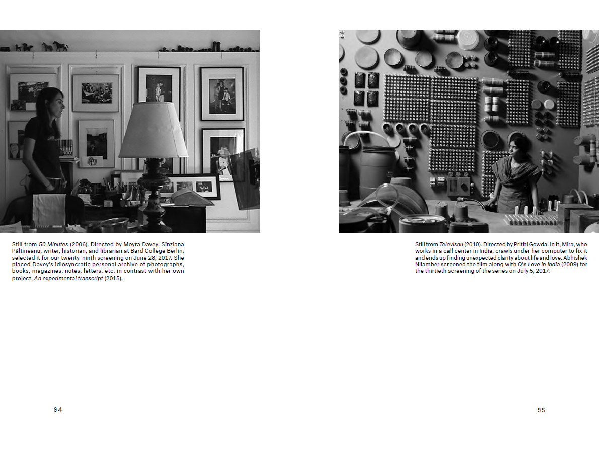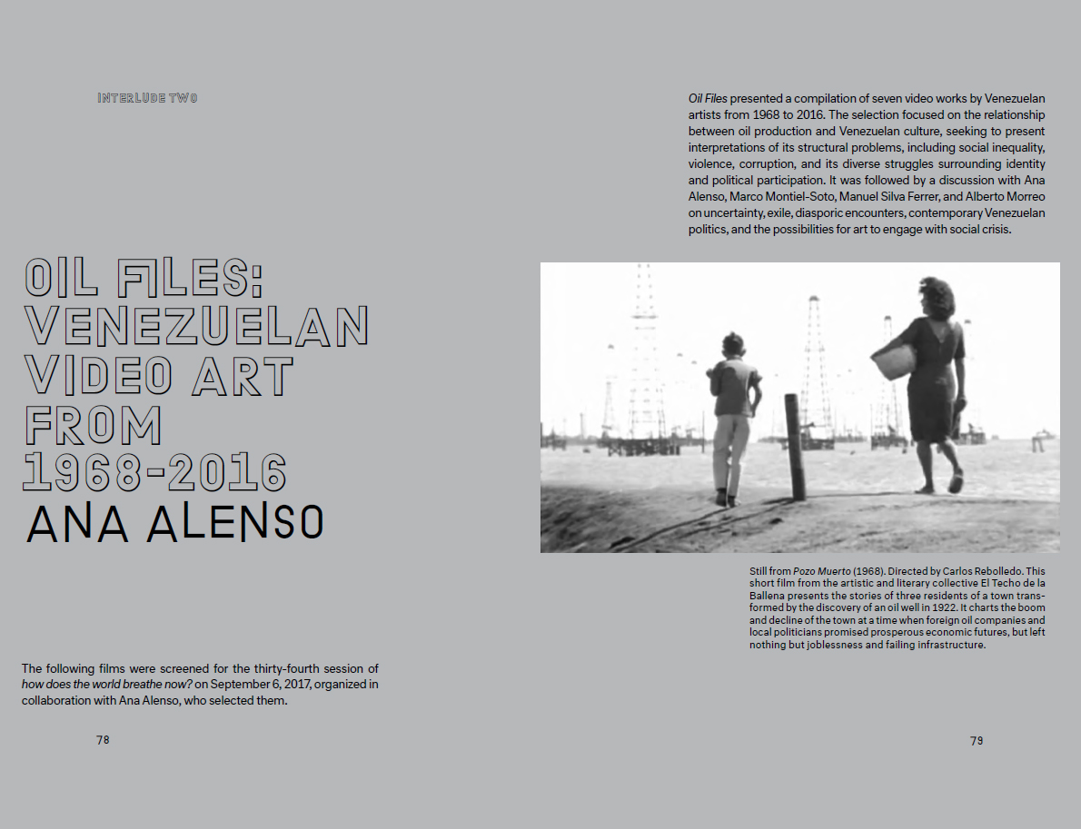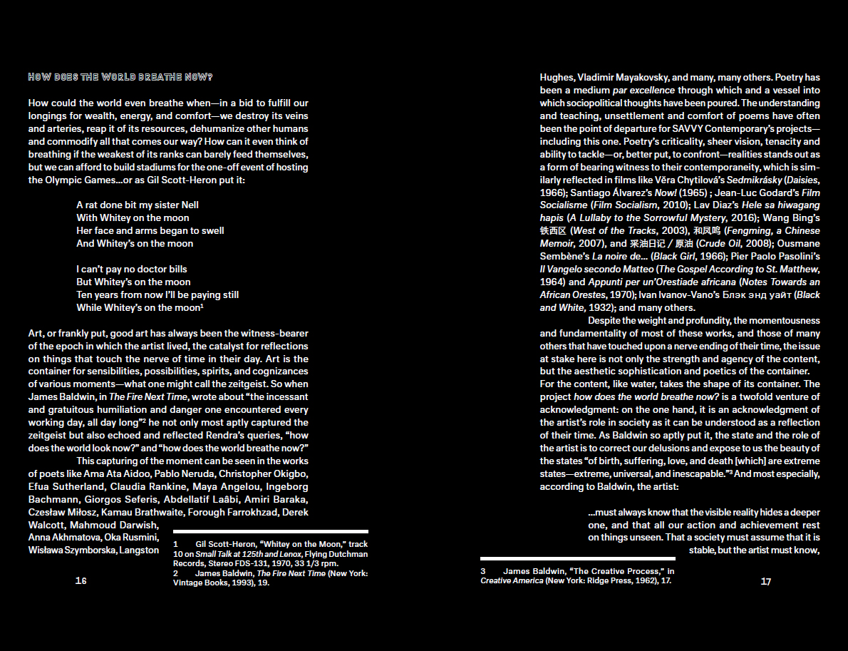 The film series conceived of by SAVVY Contemporary, which ran from September 2016 through March 2018, was a response to our own dismay at the continued injustices that the world faces. Each week SAVVY invited a different speaker who would choose a film that she or he felt answered, or asked more questions of, the question, "how does the world breathe now?" More than just a series of screenings, the film series became a kind of ciné-club where we also ate, drank, and danced together, and out of which new concepts, collaborations, and polemics emerged. With this publication we hope to offer readers another mode of thinking about films, and to pick up on some loose threads or unfinished conversations of the film series.