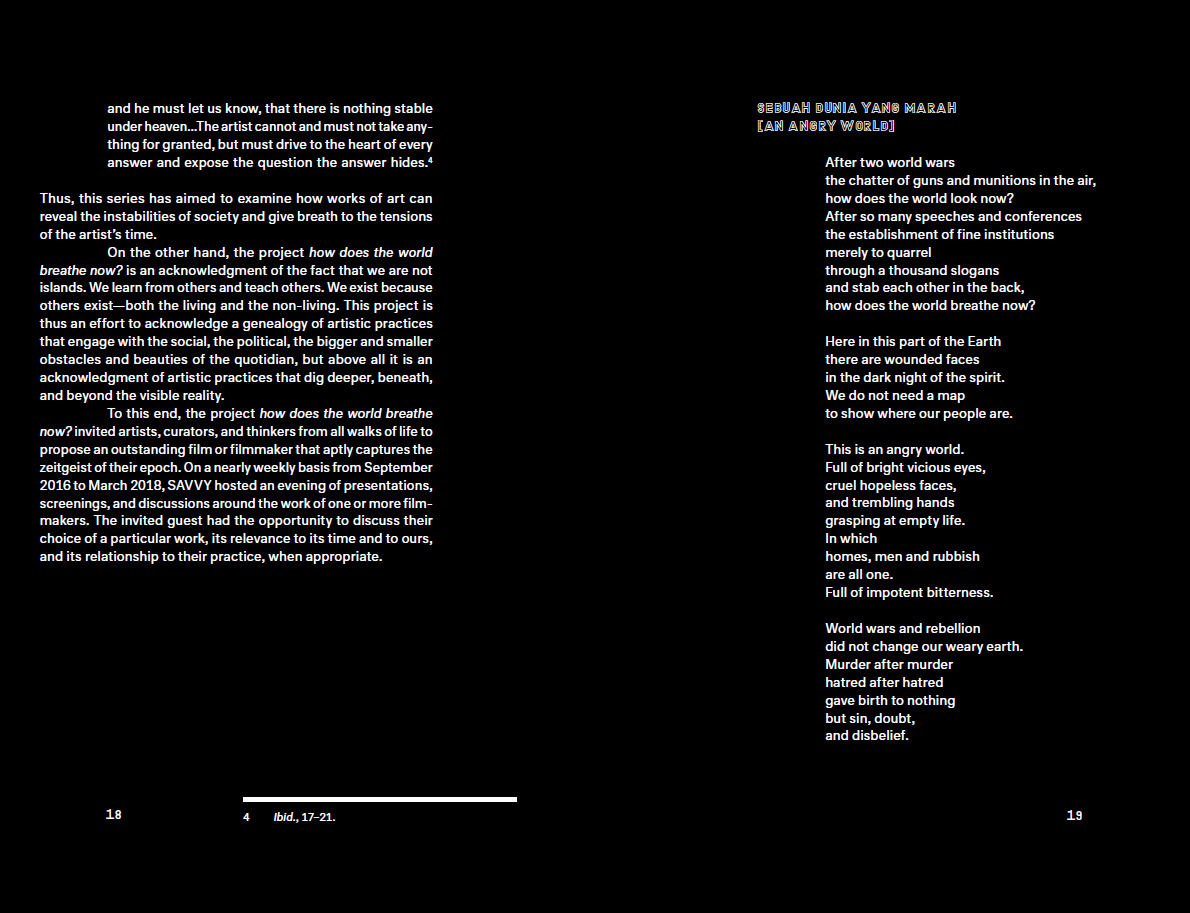 Ouvrage documentant le cycle de projection de films engagés organisé à Savvy Contemporary, Berlin, de 2016 à 2018, autour de la question « Comment le monde respire-t-il maintenant ? » (à la suite du poète indonésien Willibrordus Surendra Broto Rendra en 1960), examinant les potentialités du