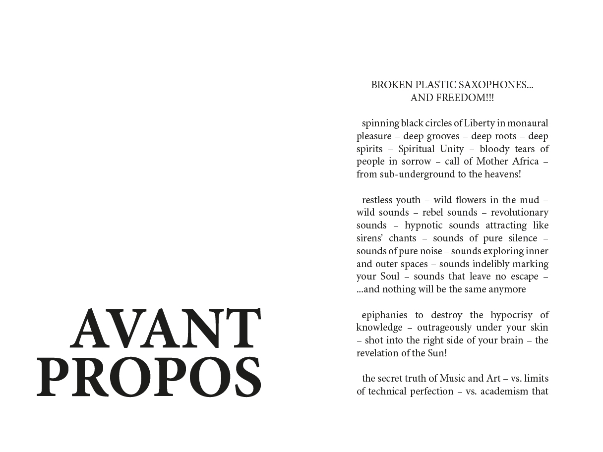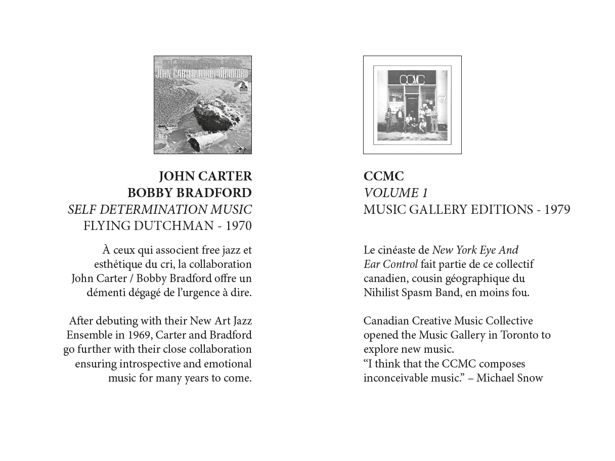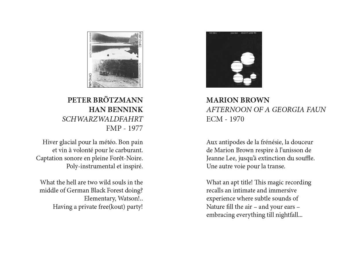 Soit une liste bilingue français / anglais, faite à trois, d'œuvres de free jazz. Peu importe combien, leur rareté ou pas. Oublier les seuls critères historiques objectifs. Ignorer les quotas, par exemple liés à la chronologie. S'autoriser les à-côtés. Ne pas oublier non plus que choisir est affaire de morale, et que nous ne sommes pas des collectionneurs ! Seules comptent la spiritualité et la créativité. Privilégier la sensibilité plutôt que l'expertise. Des commentaires brefs, sans rien brader ni trahir. Se faire écho d'un éblouissement...