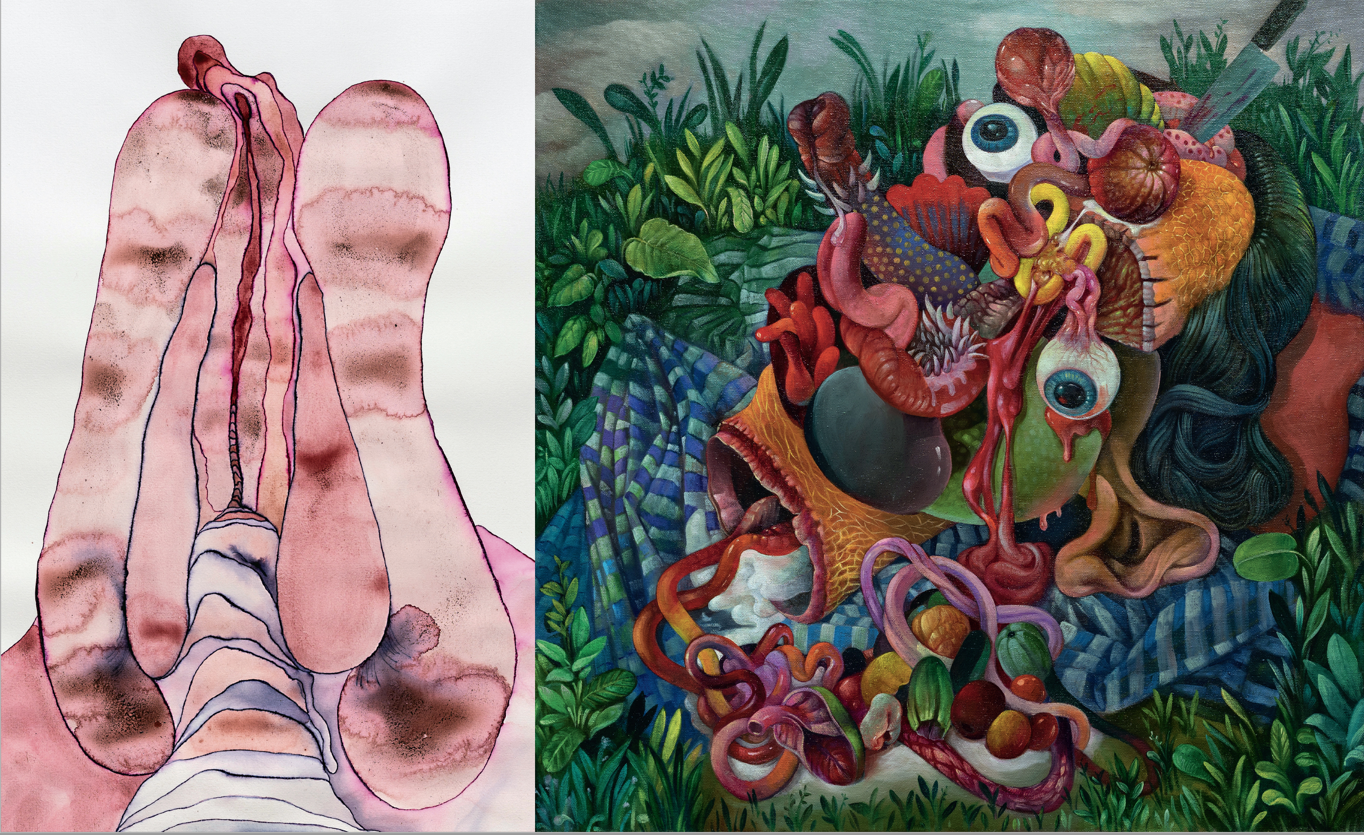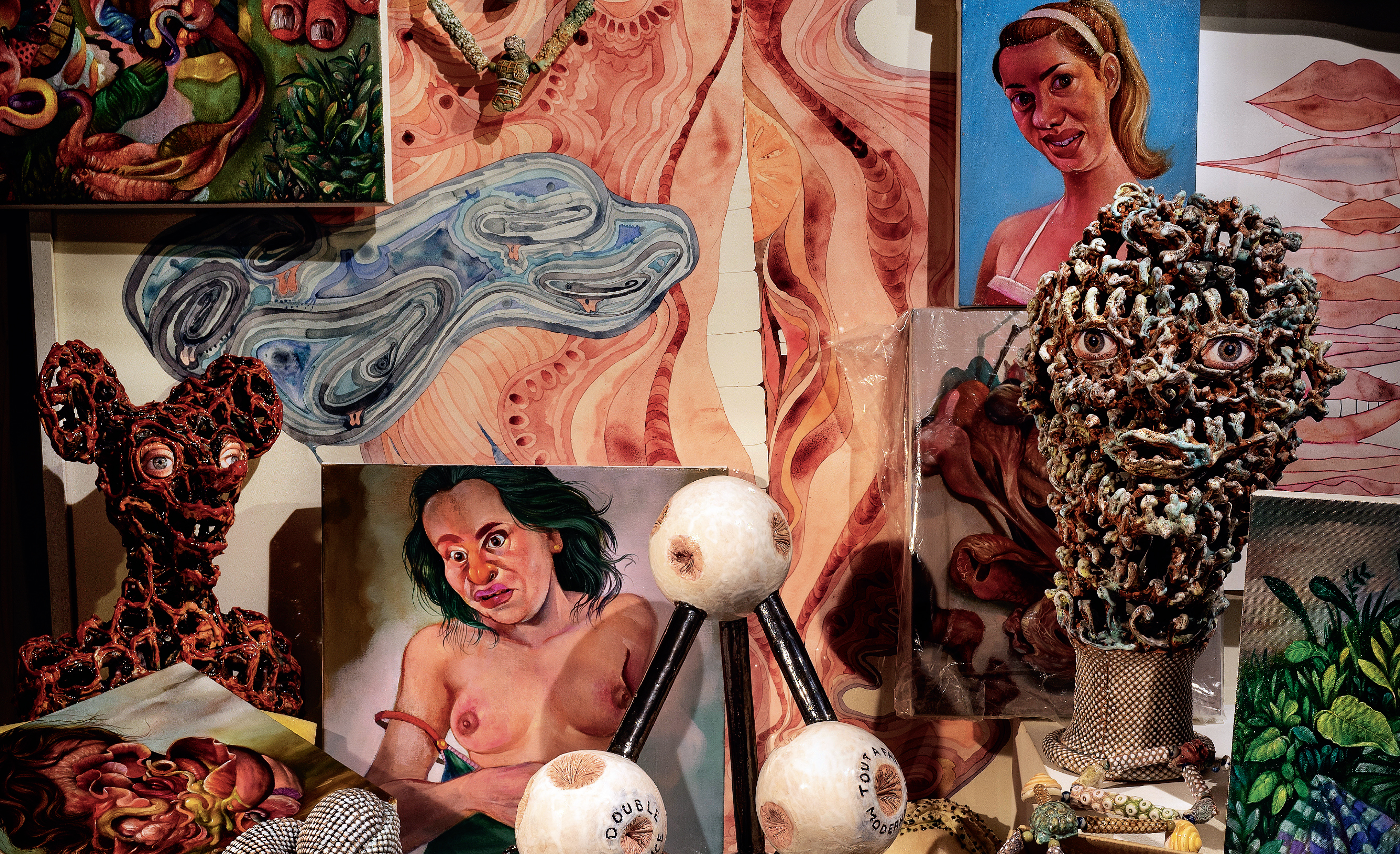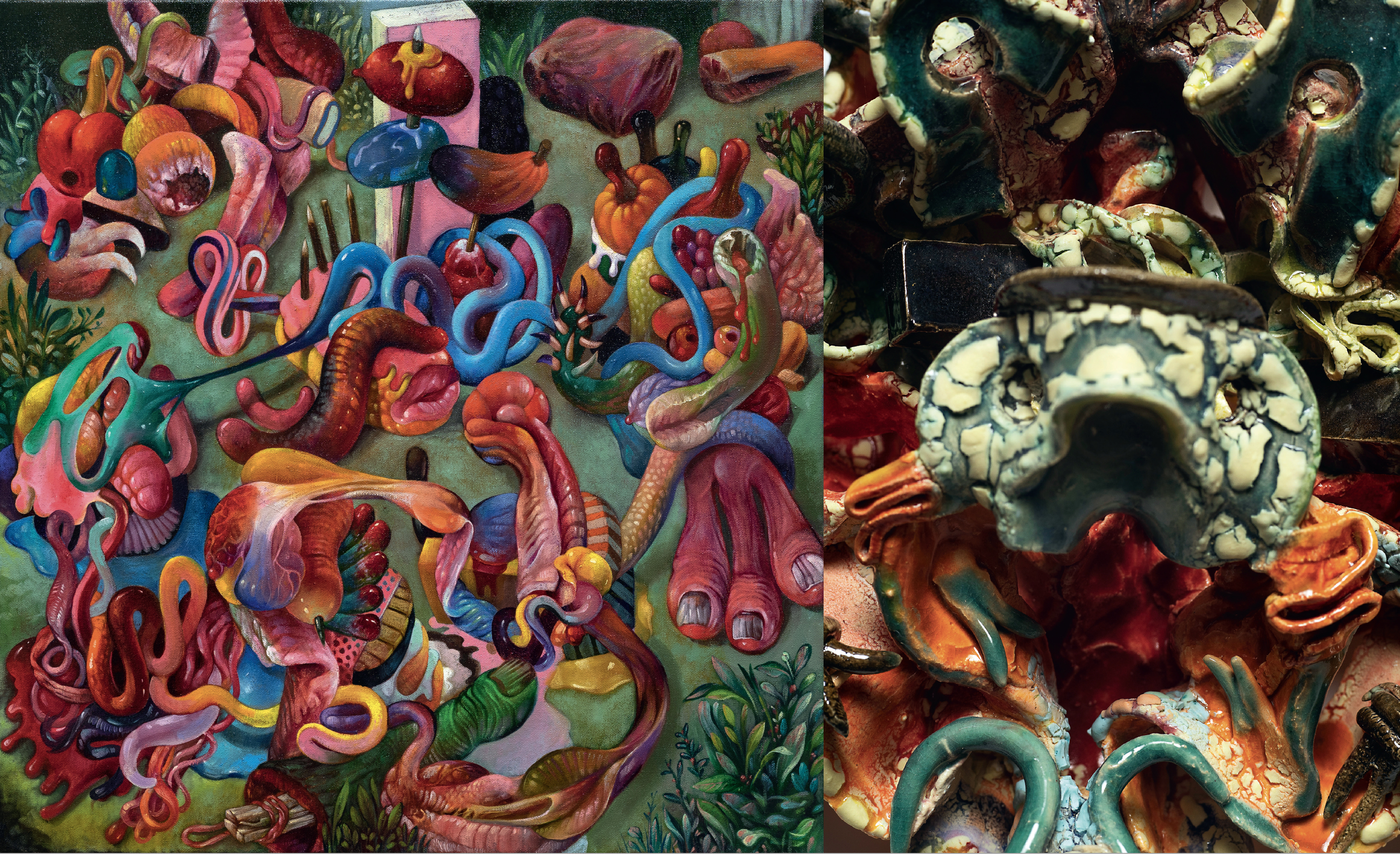 « Je peins des personnages, en me concentrant sur les petits détails qui m'obsèdent... un peu de graisse qui dépasse d'une ceinture, des chaussures mal ajustées, des occlusions, des nez, des dents et de la chair. Que ce soit par le biais du portrait ou de tableaux chargés, je crée un monde et un vocabulaire de personnages qui vivent et embrassent leurs soi-disant défauts. Au fil des ans, ce travail s'est transformé en accumulations qui sont des substituts corpulents et viscéraux des personnages. La viande, les déchets, les pâtés et les fruits et légumes ressemblant à des organes génitaux sont érigés en structures héroïques mais pathétiques. Ces accumulations agissent également comme une sorte de preuve médico-légale et de catalogage de relations sexuelles maladroites, de gloutonnerie grossière, de rituels de masturbation ridicules, d'humiliation et d'échec sans fin. L'œuvre est absurde, grotesque et un peu brutale, mais j'essaie d'attirer le spectateur avec des surfaces exubérantes et lumineuses, créant un équilibre instable et hilarant entre répulsion et d'attraction. »