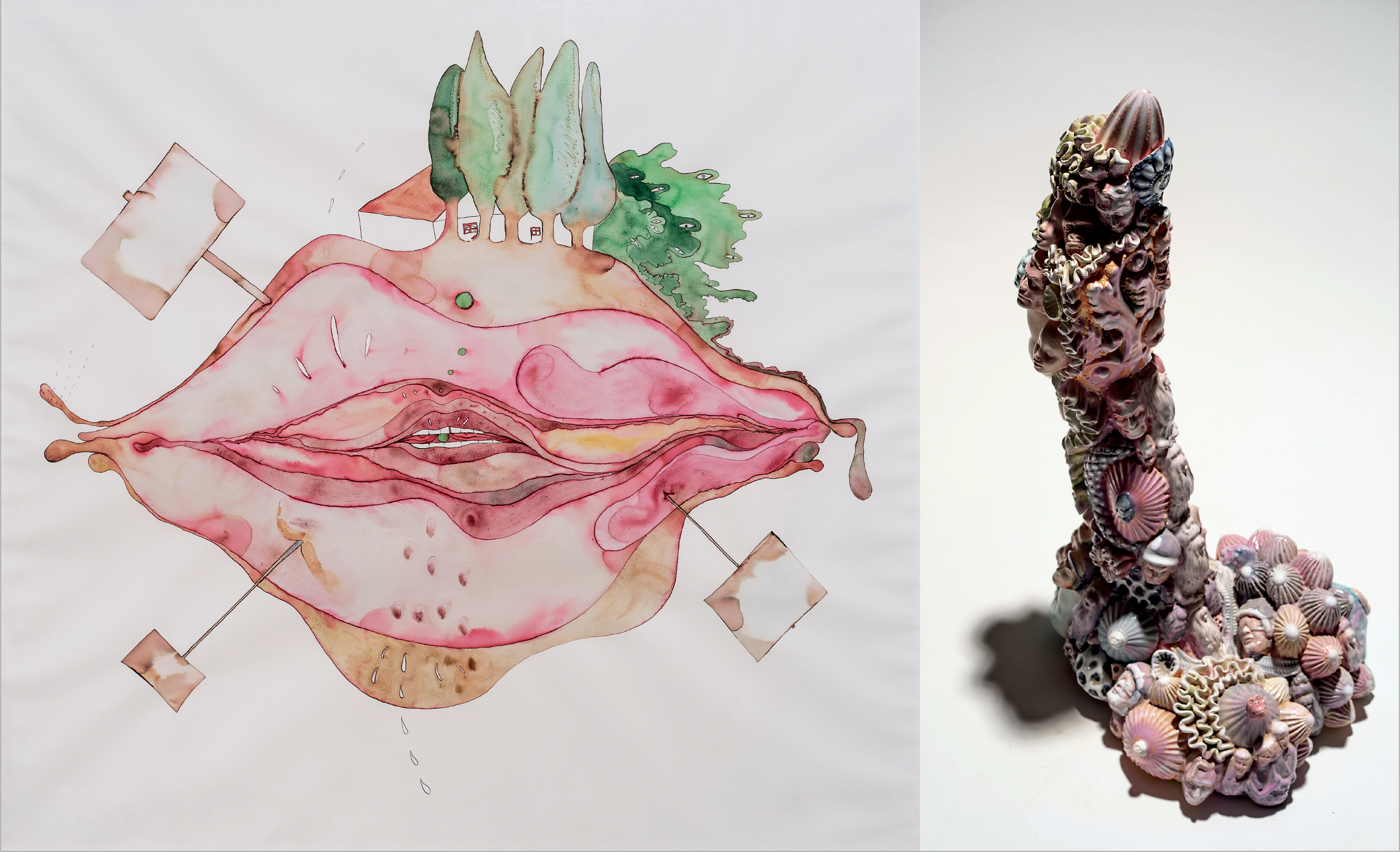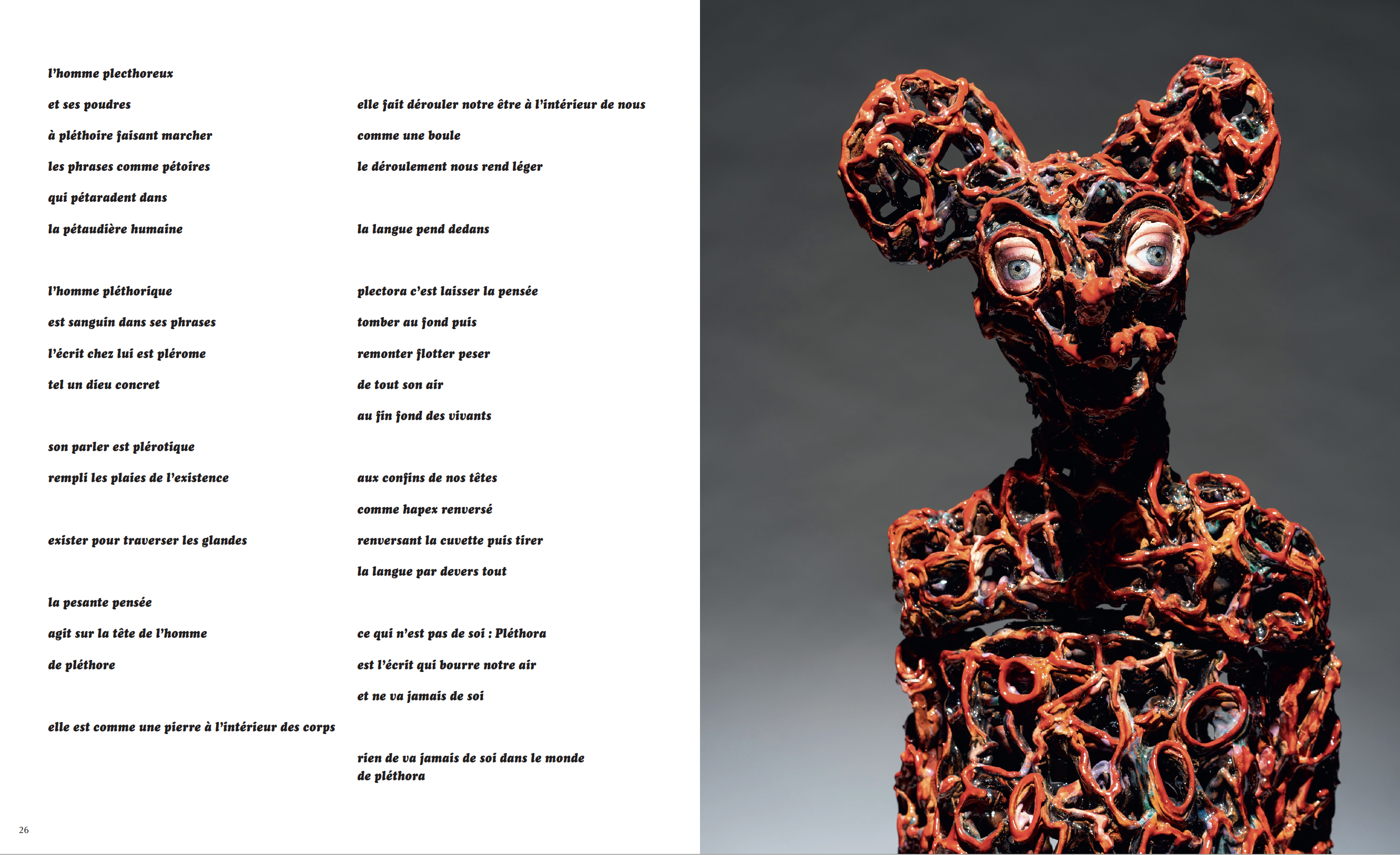 Dans ses sculptures virtuoses en céramique, désormais son matériau de prédilection, lisse ou granuleuse, parfois mat ou avec des effets moirés, on trouve des créatures plus ou moins humanoïdes avec des disproportions souvent curieuses, des guirlandes murales en relief où humain et végétal s'entremêlent. Certaines pièces font penser à des anémones de mer, des coraux ou des crustacés. L'artiste a longtemps collectionné les fossiles. Il y a aussi des totems qui sont à mi-chemin entre le bâton druidique et la crosse papale. Des visages émergent parfois de la matière comme prisonniers d'elle et tentant de s'extirper de cette géôle étouffante.