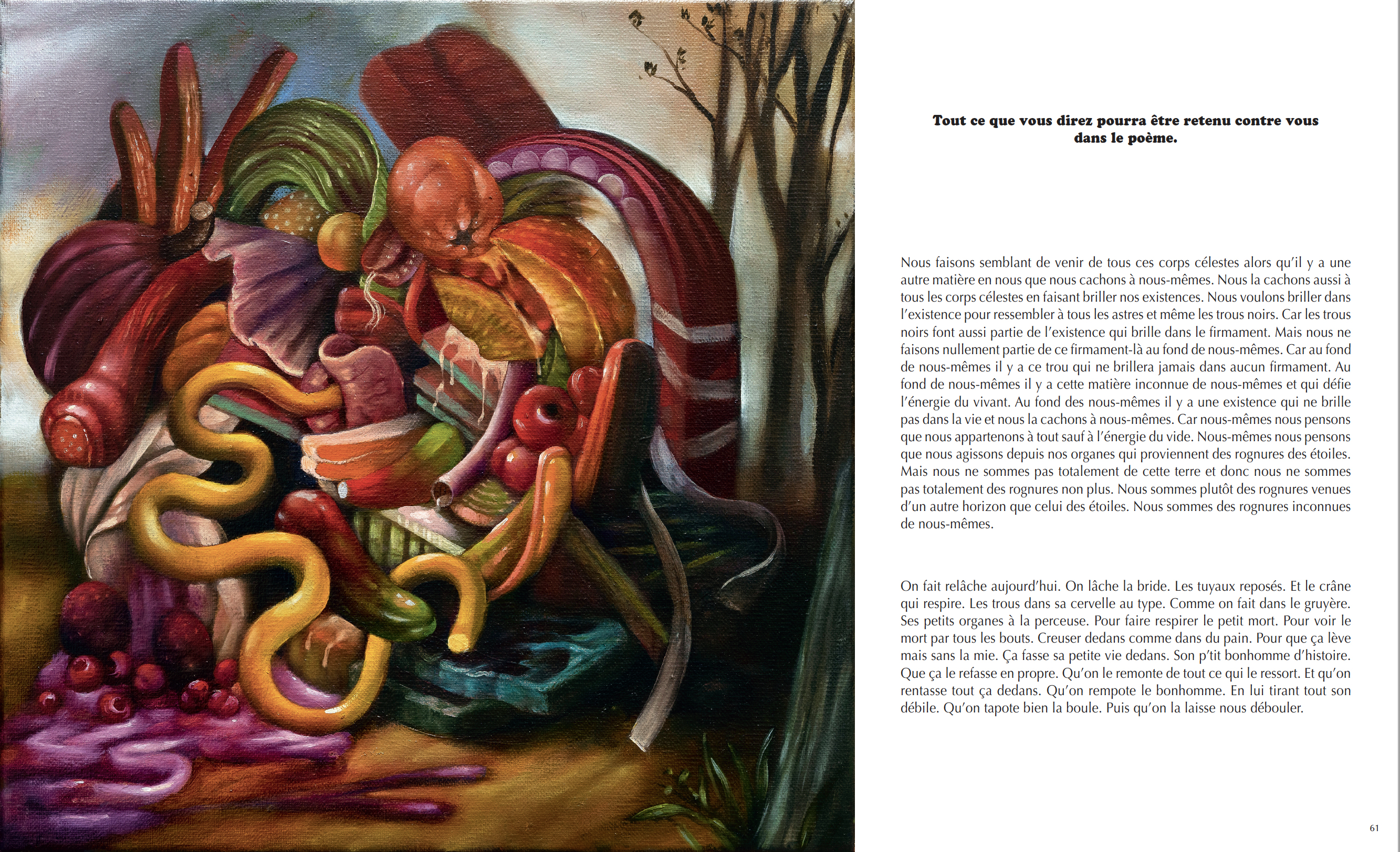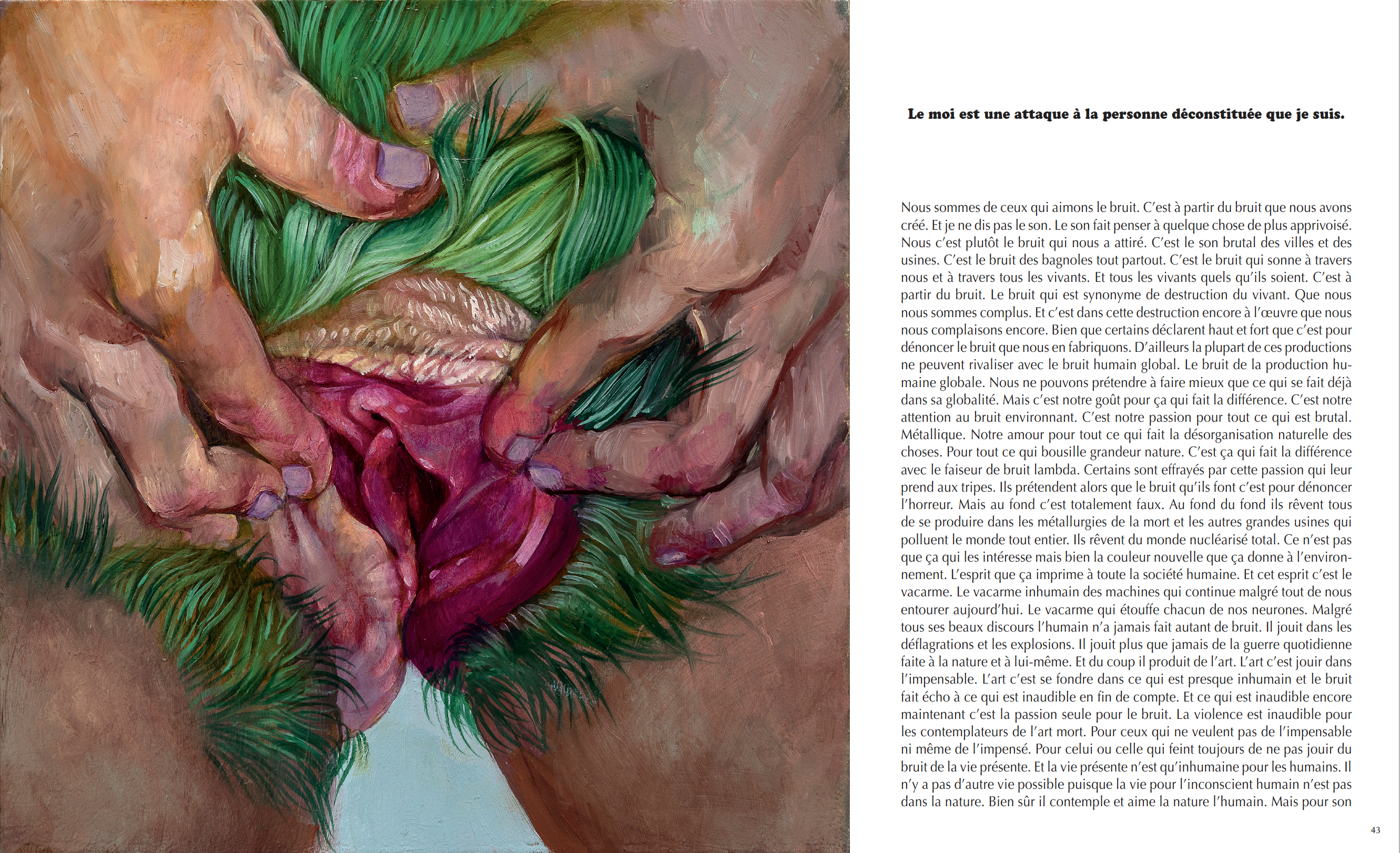 C'est bien dans l'excès et la débauche que cette réunion d'artistes virtuoses – Béatrice Cussol, Michel Gouéry, Gregory Jacobsen et Charles Pennequin – a été initiée. Excès dans la couleur, excès dans la truculence, excès dans la prolifération des formes, dans les sujets mêmes, dans le mauvais goût, dans le verbe, dans l'inconvenance, excès dans l'excès.