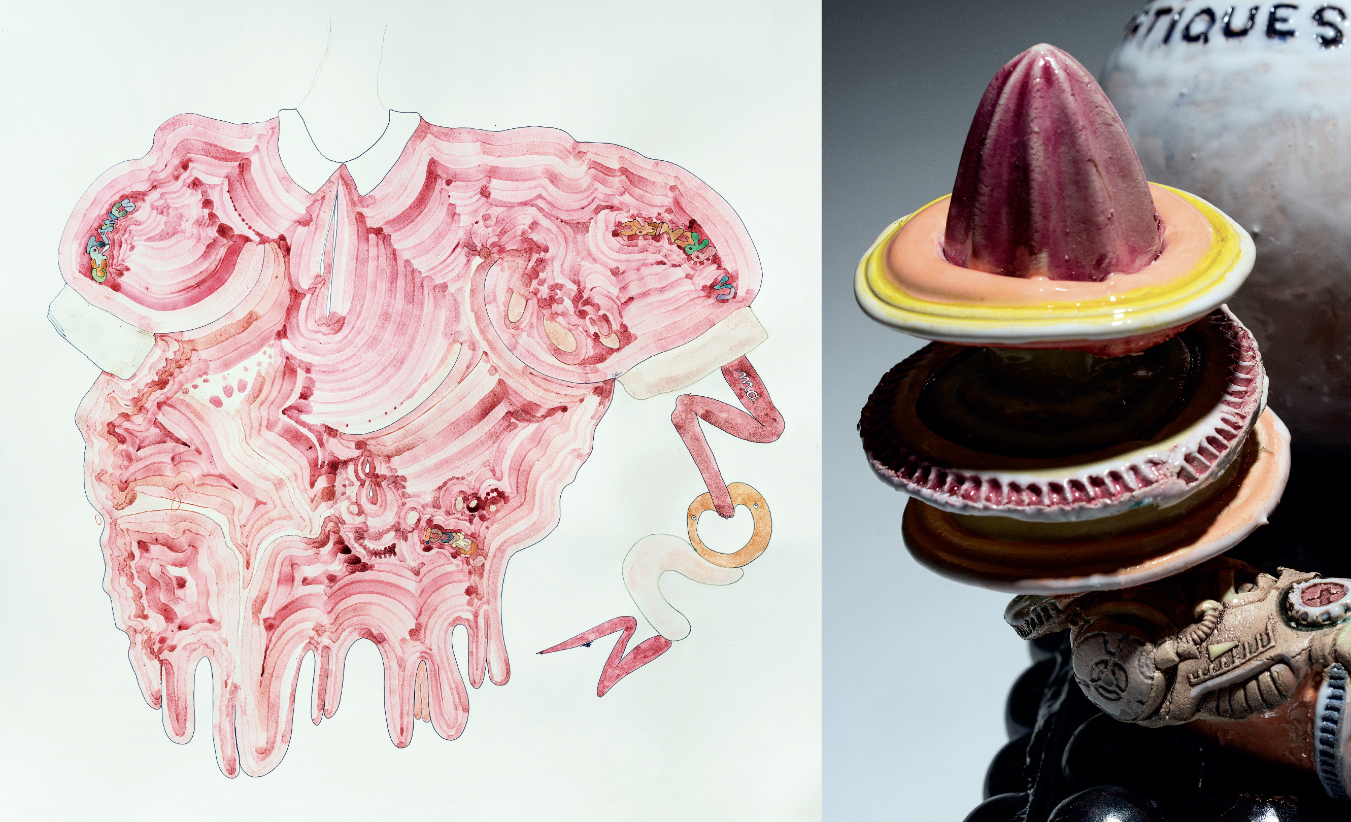 Peintre d'abord, jusqu'au milieu des années 1990, puis sculpteur, Michel Gouéry (né en 1959 à Rennes, vit et travaille à Paris) pratique la céramique avec maestria, employant un registre pour le moins singulier. Définitivement bizarres, télescopant des références aux artistes du passé, à Dada, au Surréalisme, aux grands écrivains, aussi bien qu'aux registres mineurs du cinéma et de la bande dessinée de science-fiction, ses pièces cultivent l'anticonformisme, l'incongru et le pervers, sans rien négliger d'une parfaite qualité de la matière.