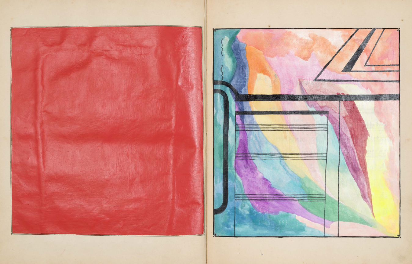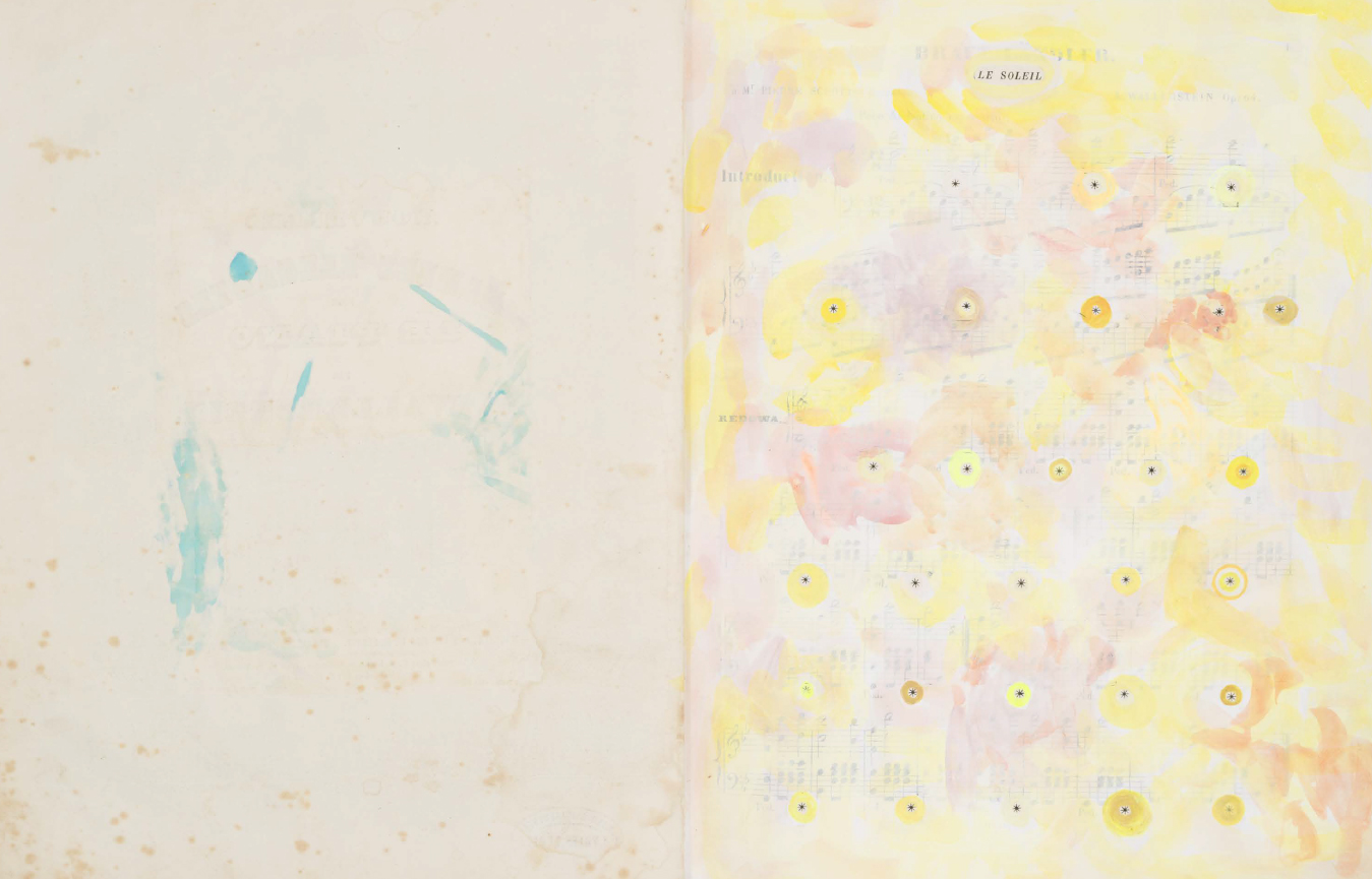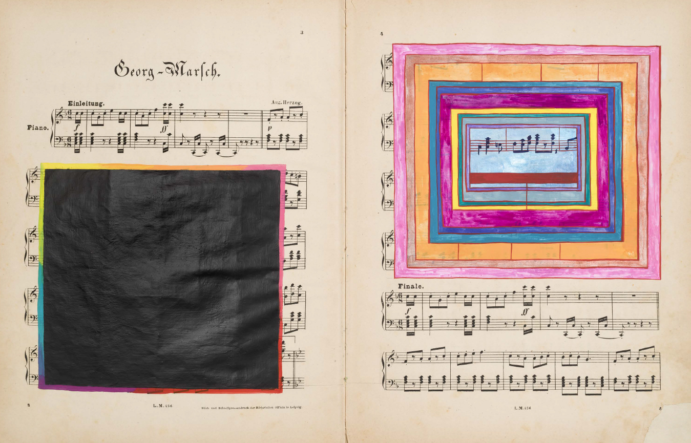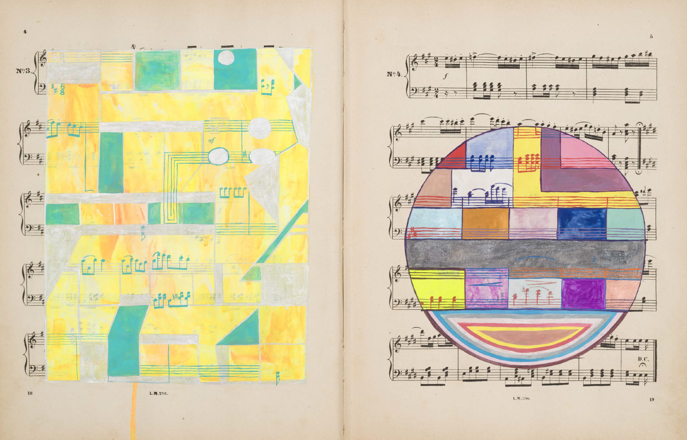 Le fac-similé d'un livre d'artiste de Sarah Cain, comprenant une série d'abstractions colorées peintes en palimpseste directement sur une collection de partitions musicales anciennes.