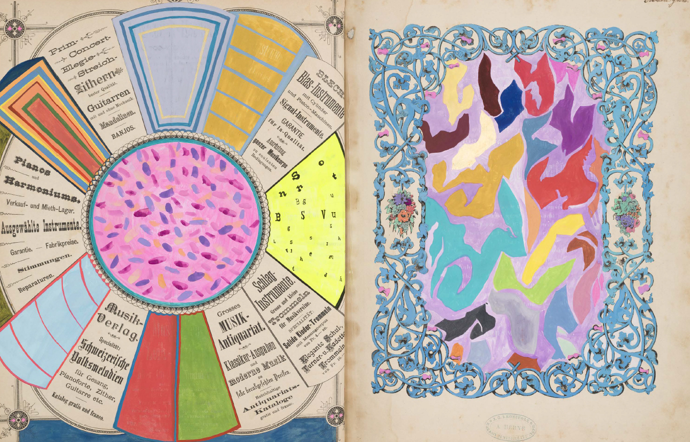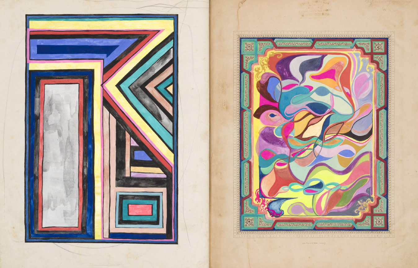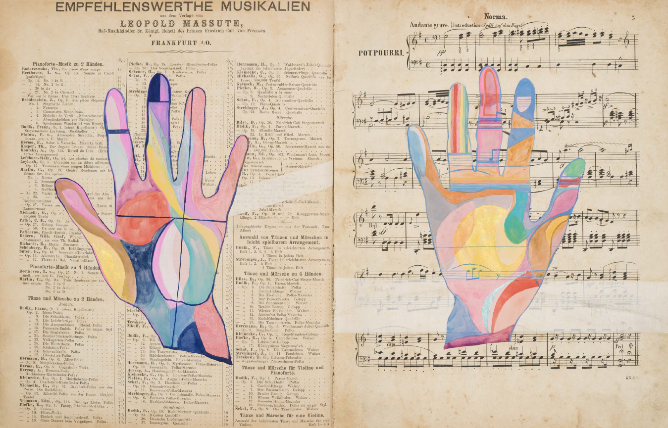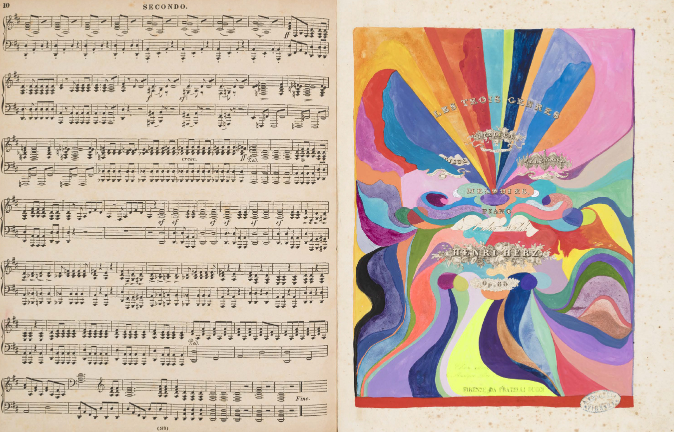 Le fac-similé d'un livre d'artiste de Sarah Cain, comprenant une série d'abstractions colorées peintes en palimpseste directement sur une collection de partitions musicales anciennes.