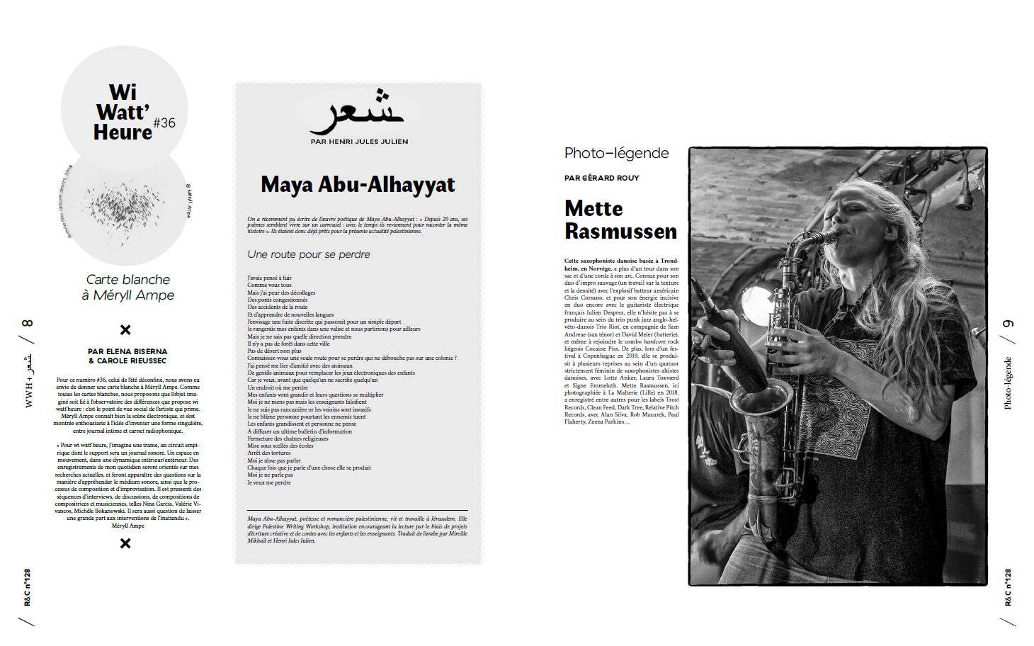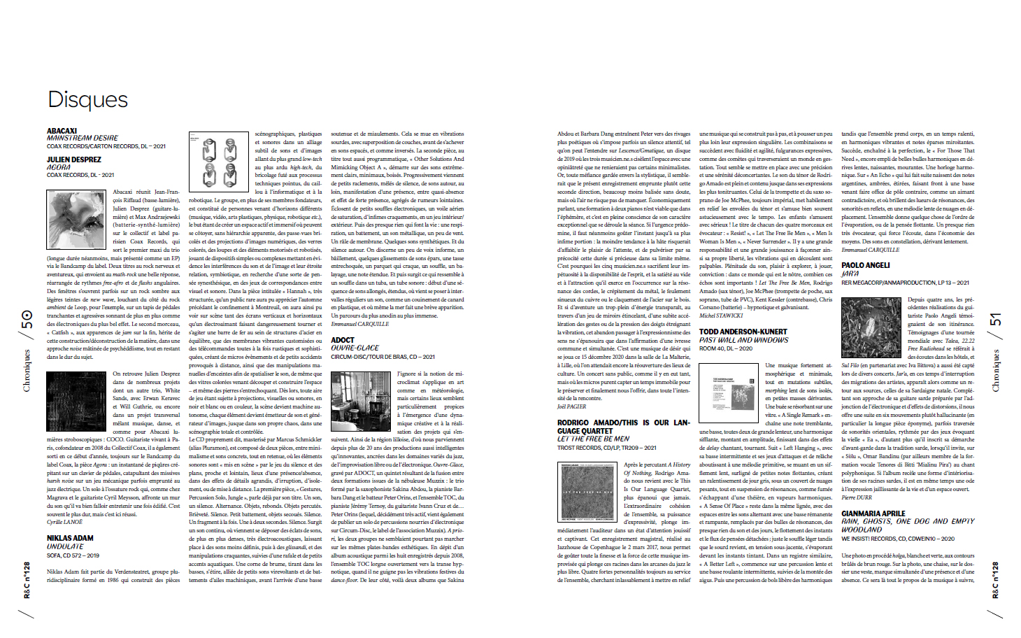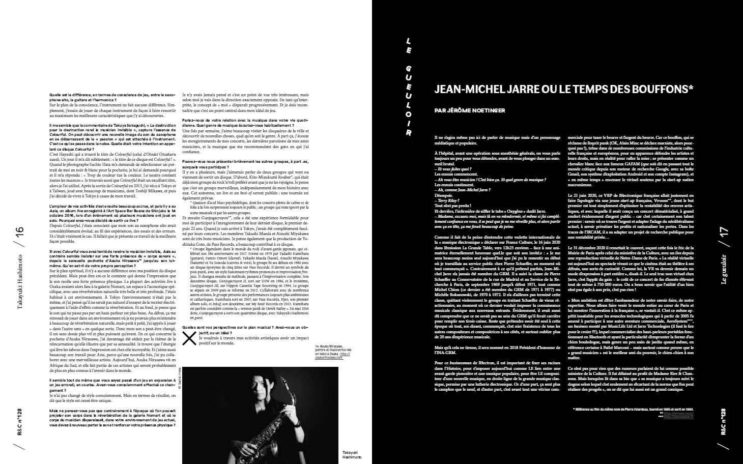 Carte blanche visuelle : Pole Ka #2 / Poésie contemporaine de langue arabe : Maya Abu-Alhayyat / Photo-Légende : Mette Rasmussen / « Jean-Michel Jarre ou le temps des bouffons », par Jérôme Noetinger / « Takayuki Hashimoto, éclosion du cœur, disparition du moi et au-delà », une interview de Takeshi Goda, introduction Michel Henritzi / « Louis Moholo-Moholo, une passion sud-africaine », une interview de Gérard Rouy / Dossier Simon H. Fell, avec : « Simon H. Fell, a lush life continuum », par Richard Comte ; « Simon H. Fell, a more attractive way of getting things done », par Bertrand Gauguet ; « Simon H. Fell, un parcours discographique commenté », par Jean-Michel Van Schouwburg / Ring-Modulation #36, « Écoutes confinées a prima vista », par Kasper T. Toeplitz / Focus Titania Tapes, « L'architecture de l'indicible », par Laurent Nerzic / Chroniques : 60 disques.