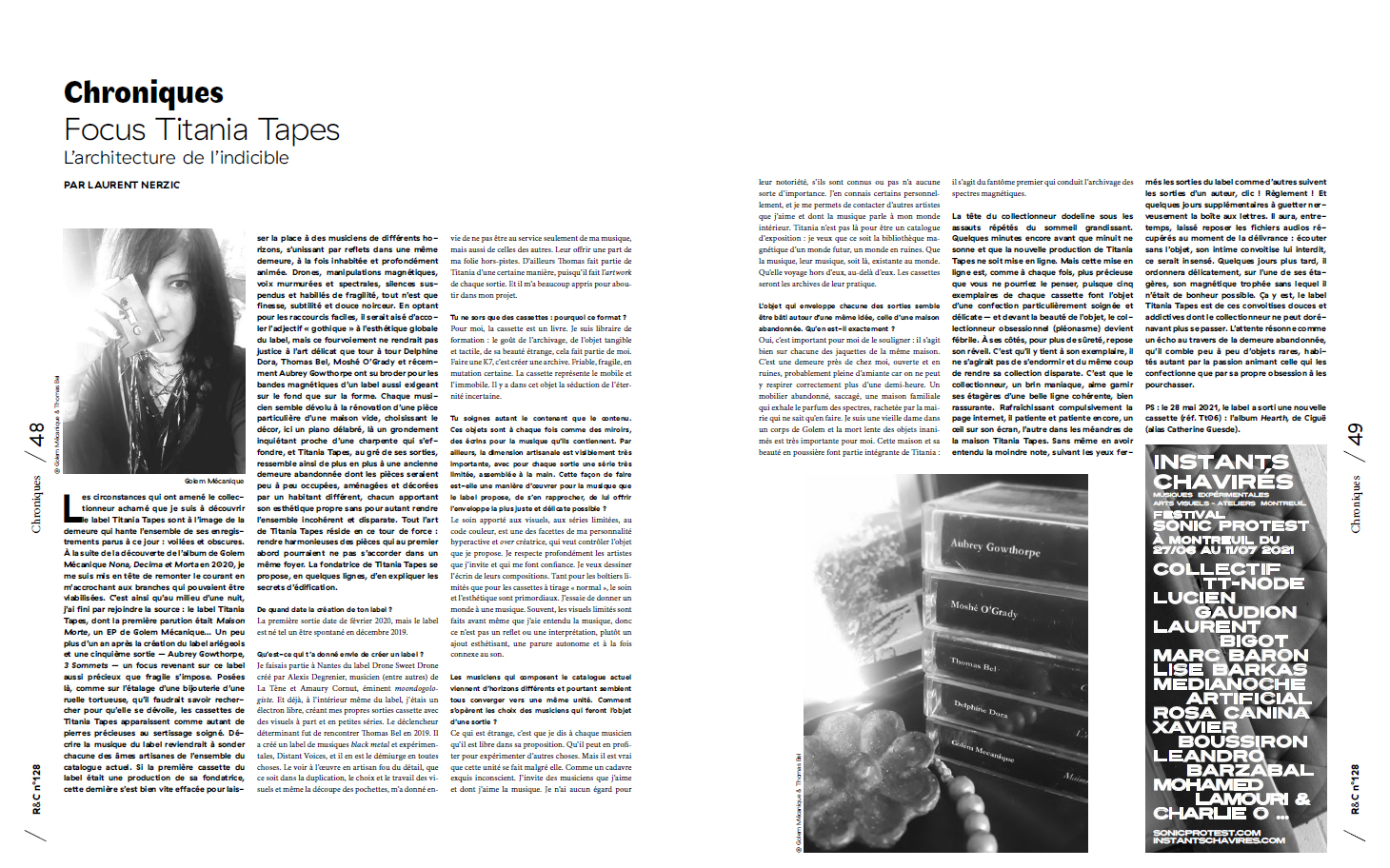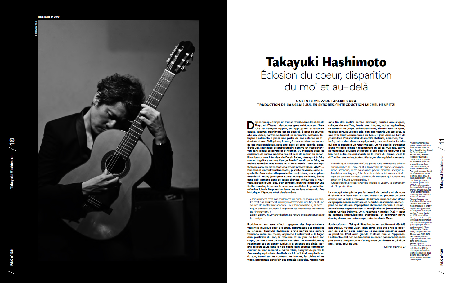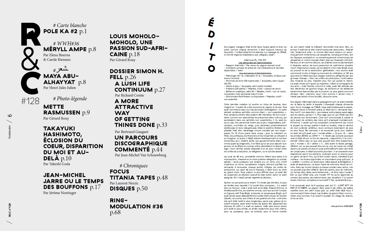 Carte blanche visuelle : Pole Ka #2 / Poésie contemporaine de langue arabe : Maya Abu-Alhayyat / Photo-Légende : Mette Rasmussen / « Jean-Michel Jarre ou le temps des bouffons », par Jérôme Noetinger / « Takayuki Hashimoto, éclosion du cœur, disparition du moi et au-delà », une interview de Takeshi Goda, introduction Michel Henritzi / « Louis Moholo-Moholo, une passion sud-africaine », une interview de Gérard Rouy / Dossier Simon H. Fell, avec : « Simon H. Fell, a lush life continuum », par Richard Comte ; « Simon H. Fell, a more attractive way of getting things done », par Bertrand Gauguet ; « Simon H. Fell, un parcours discographique commenté », par Jean-Michel Van Schouwburg / Ring-Modulation #36, « Écoutes confinées a prima vista », par Kasper T. Toeplitz / Focus Titania Tapes, « L'architecture de l'indicible », par Laurent Nerzic / Chroniques : 60 disques.