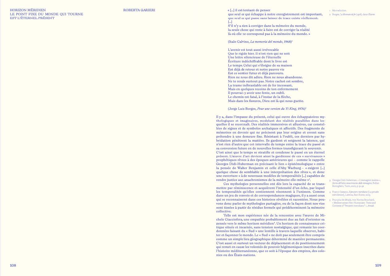 Des signes distillés sur un chemin multipistes, dérivant entre les ports de Sicile, les montagnes du Rif et les vestiges de Tyr. Au cours de sa vie Michele Ciacciofera a sillonné la terre entière, guidé par le tropisme « des » Sud et cultivant l'esprit du cosmopolitisme. Ses pérégrinations paradoxalement « habitées » sont autant d'occasions de s'immerger dans un écosystème et de laisser son processus de création s'hybrider à son contact. Elles résonnent anachroniquement avec les multiples invasions qui ont façonné la terre natale de l'artiste, celle qui est au carrefour de toutes ses dérives, la Sardaigne : grecque, romaine, arabe, carthaginoise, espagnole… Tous les voyages de Ciacciofera reflètent le rite initiatique permanent des multiples sites archéologiques visités, pierres sondées, alphabets déchiffrés, qui émaillent de leur présence fantomatique les œuvres de l'artiste. Il crée à la manière d'un archéologue qui ayant examiné une infinité d'objets en toute matérialité, se résout finalement à la recherche de leur aura perdue, plutôt que leur existence purement tangible.