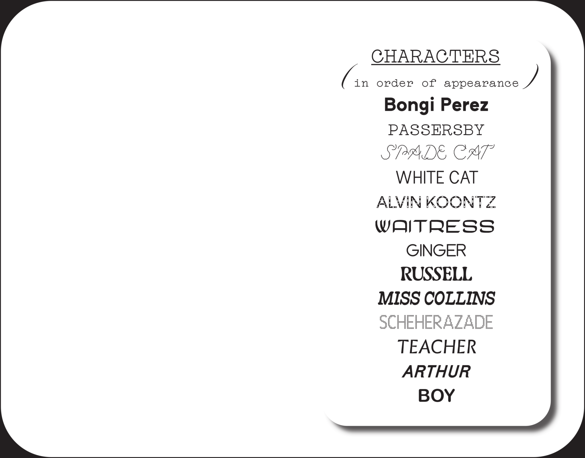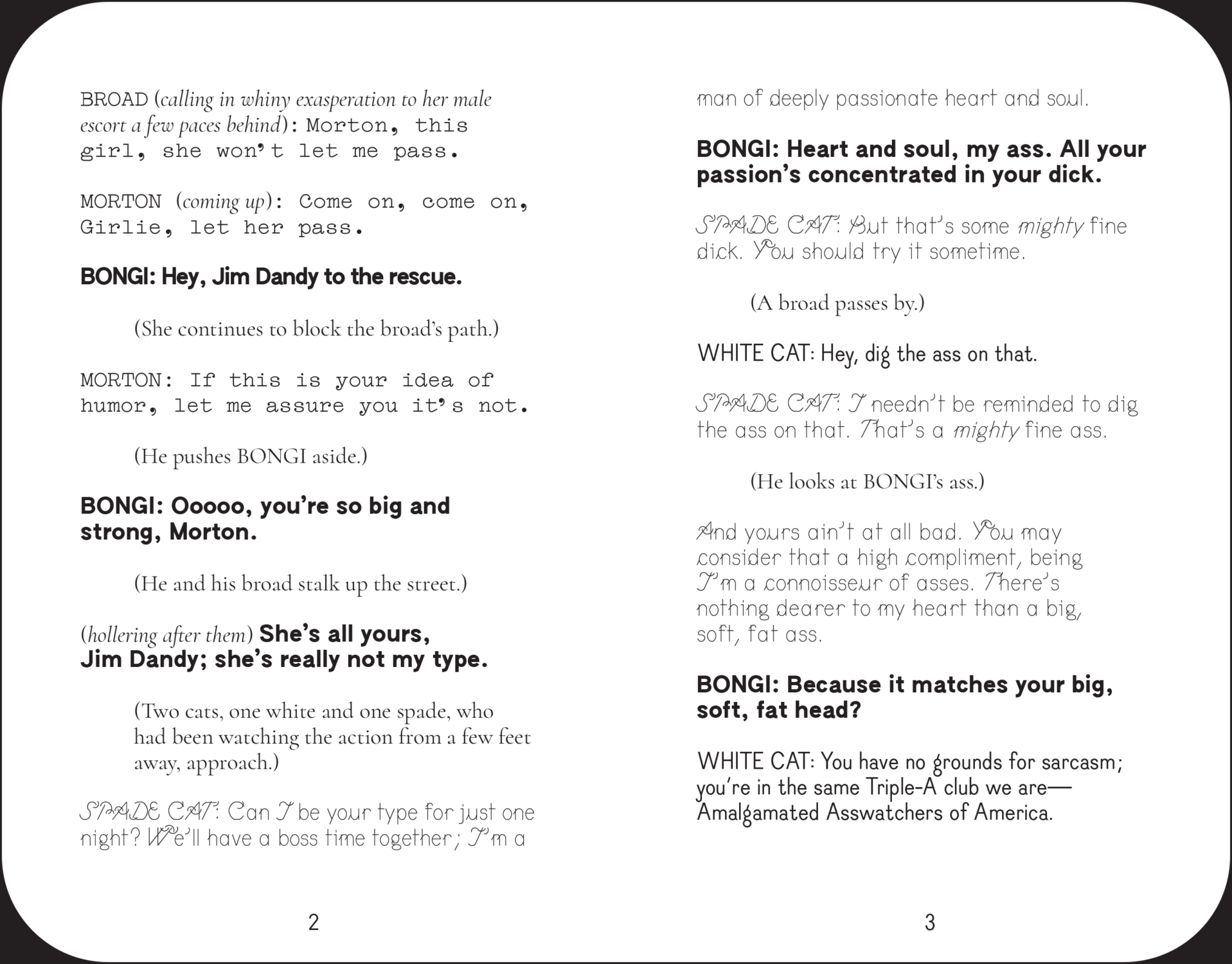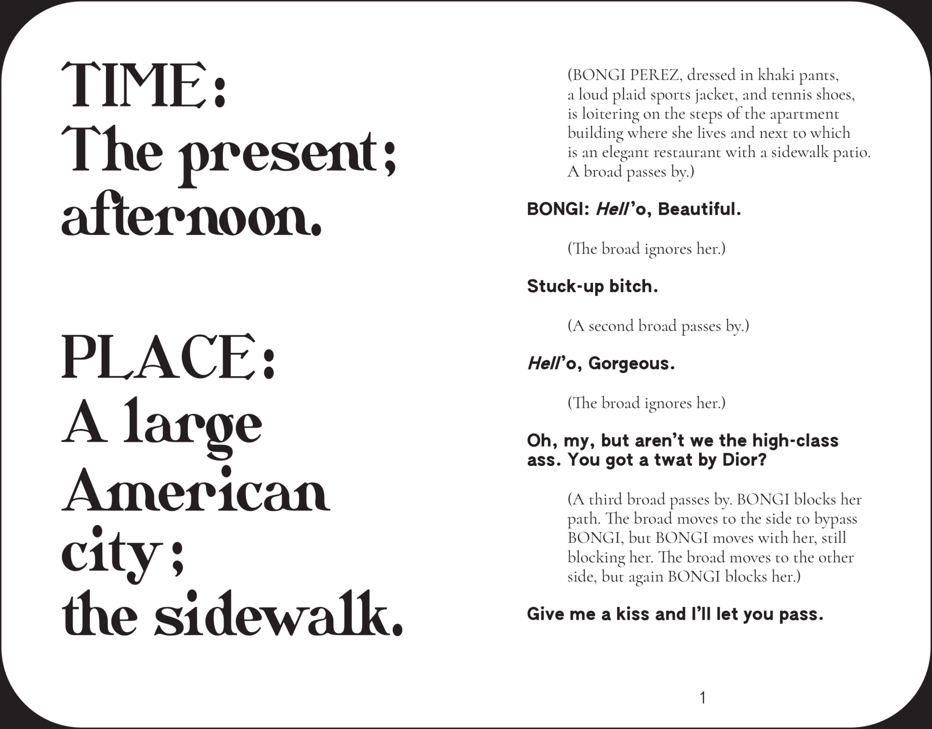 La pièce, dont le titre complet est Up Your Ass Or From the Cradle to the Boat Or The Big Suck Or Up from the Slime, fait défiler un ensemble de stéréotypes loufoques : le client ignorant, la carriériste exubérante, l'homme narcissique ennuyeux, deux drag queens acariâtres, la femme au foyer dépravée par le sexe, et une paire de dragueurs racisés, entre autres. Au centre se trouve la protagoniste Bongi Perez – une Solanas à peine voilée », une arnaqueuse sardonique qui change de sexe et nous escorte dans les ruelles de sa vie de rue. Prédécesseur romancé de SCUM Manifesto, la pièce partage le même langage grandiose, subversif et suggestif, embrassant les marges, la racaille, et vendant une entourloupe en cours de route.