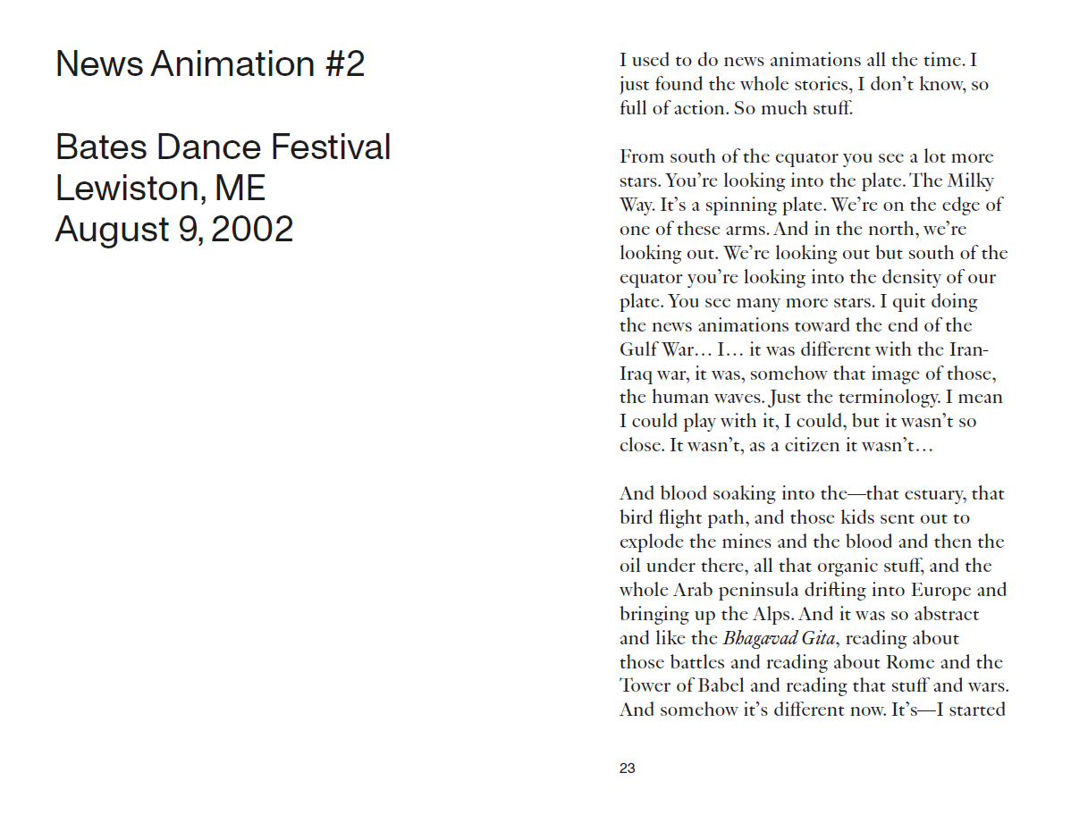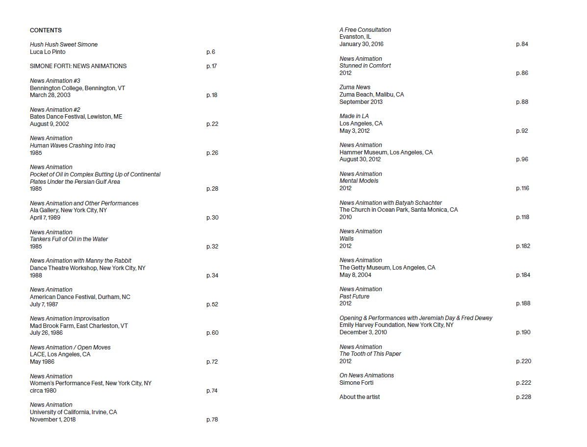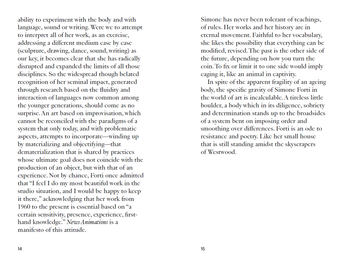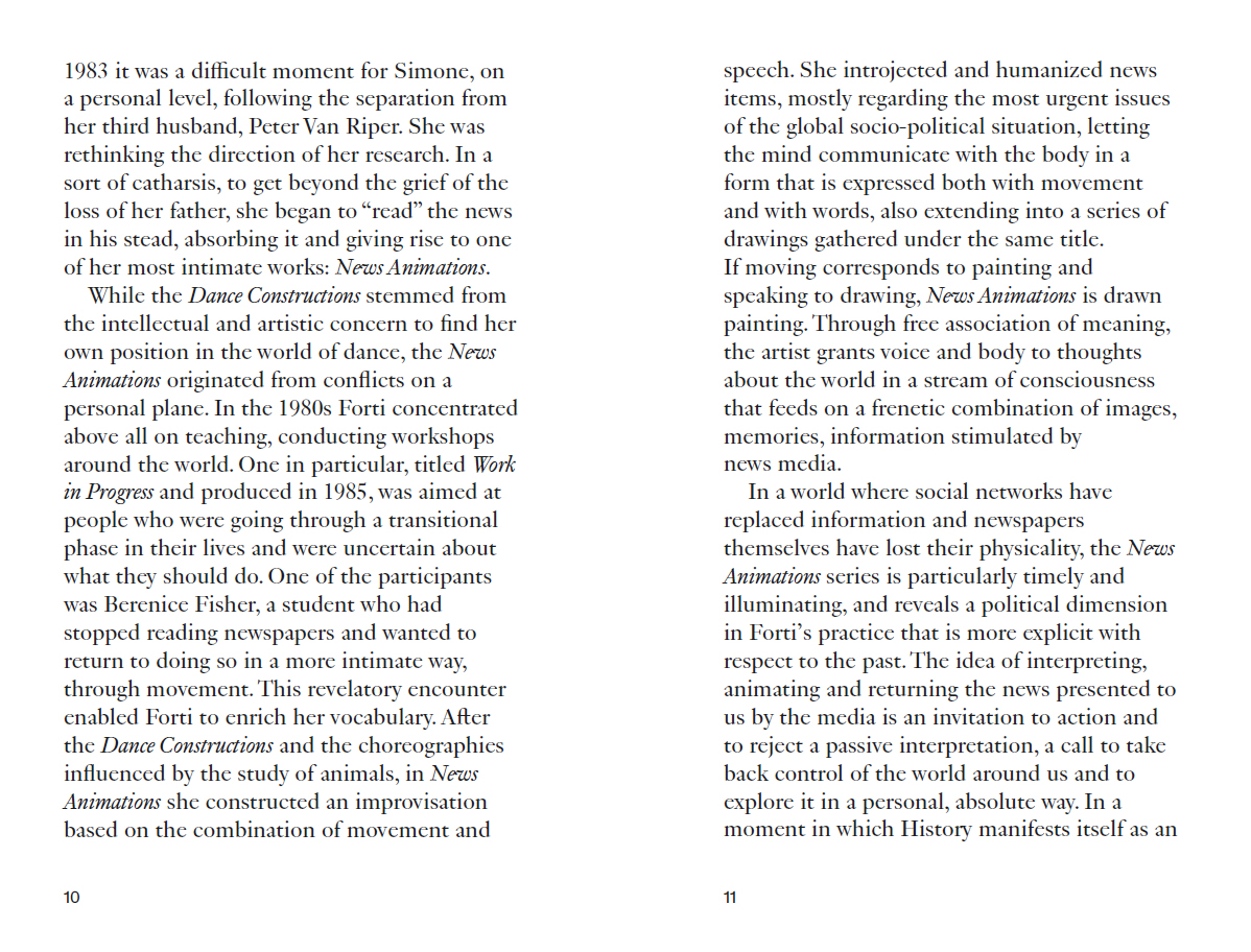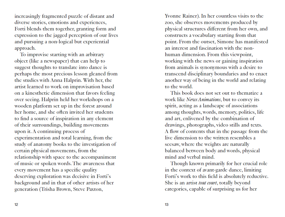 Ouvrage de référence rassemblant l'intégralité des transcriptions des News Animations de Simone Forti, une série de performances aux itérations infinies initiée au milieu des années 1980, traduisant le langage et les images des articles de journal et des journaux télévisés en compositions de mouvements improvisés, comme tentative de comprendre l'actualité (et ses représentations médiatiques) par le biais du geste dansé.