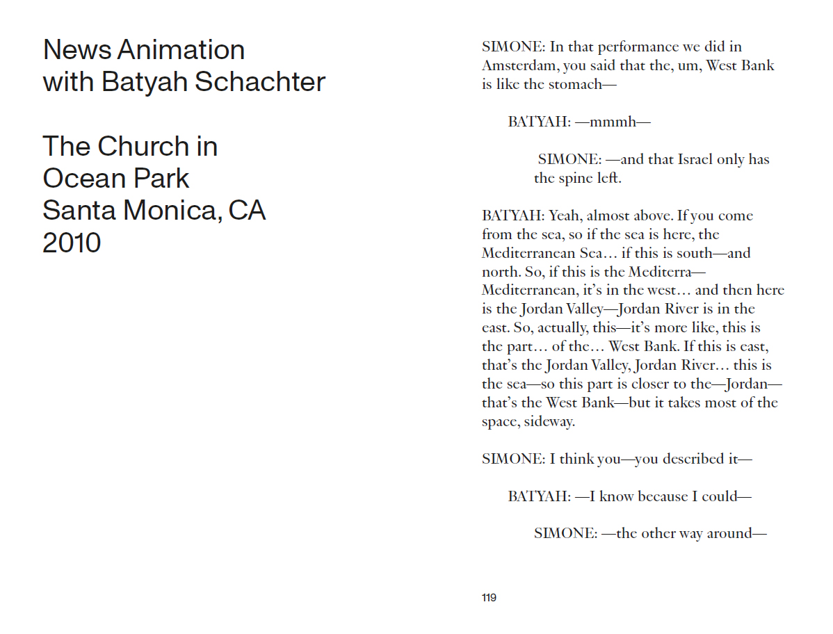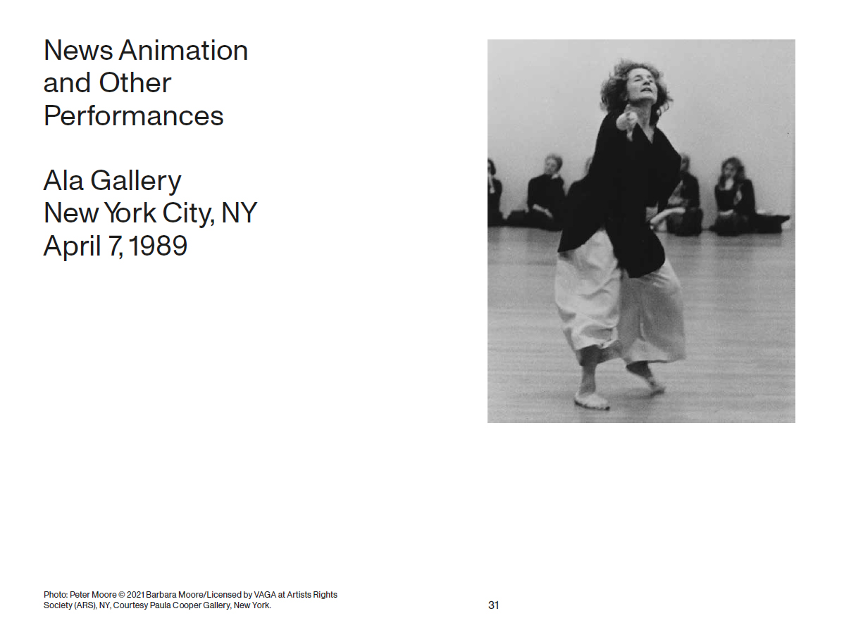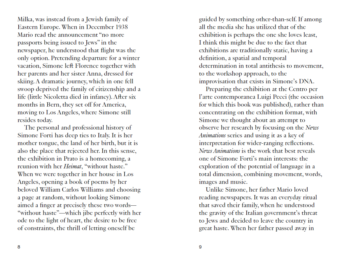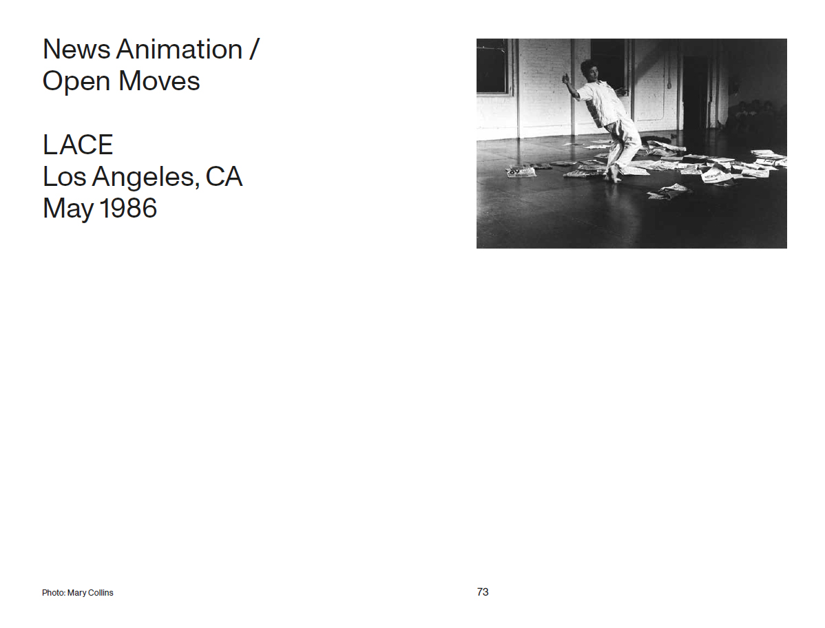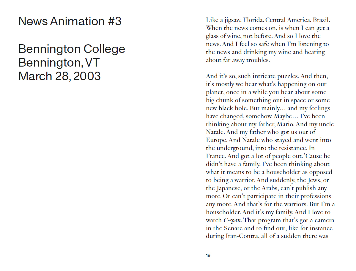 Ouvrage de référence rassemblant l'intégralité des transcriptions des News Animations de Simone Forti, une série de performances aux itérations infinies initiée au milieu des années 1980, traduisant le langage et les images des articles de journal et des journaux télévisés en compositions de mouvements improvisés, comme tentative de comprendre l'actualité (et ses représentations médiatiques) par le biais du geste dansé.