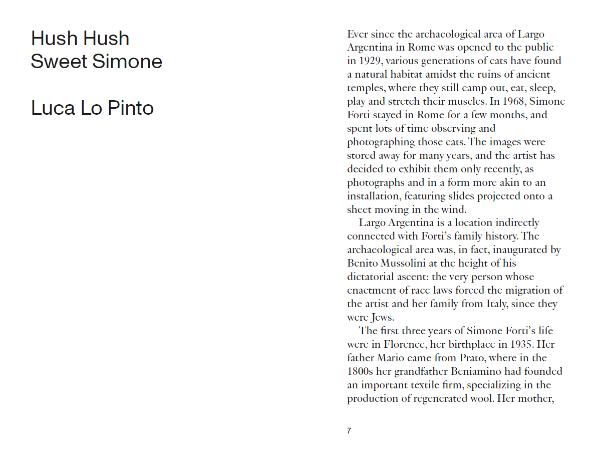 La danseuse, chorégraphe, artiste et écrivaine américaine Simone Forti (née en 1935 à Florence) est une figure de proue du développement de la performance contemporaine. Forti s'est consacrée à la recherche d'une conscience kinesthésique, constamment engagée dans l'expérimentation et l'improvisation, qui a reconfiguré le concept de performance et de danse.