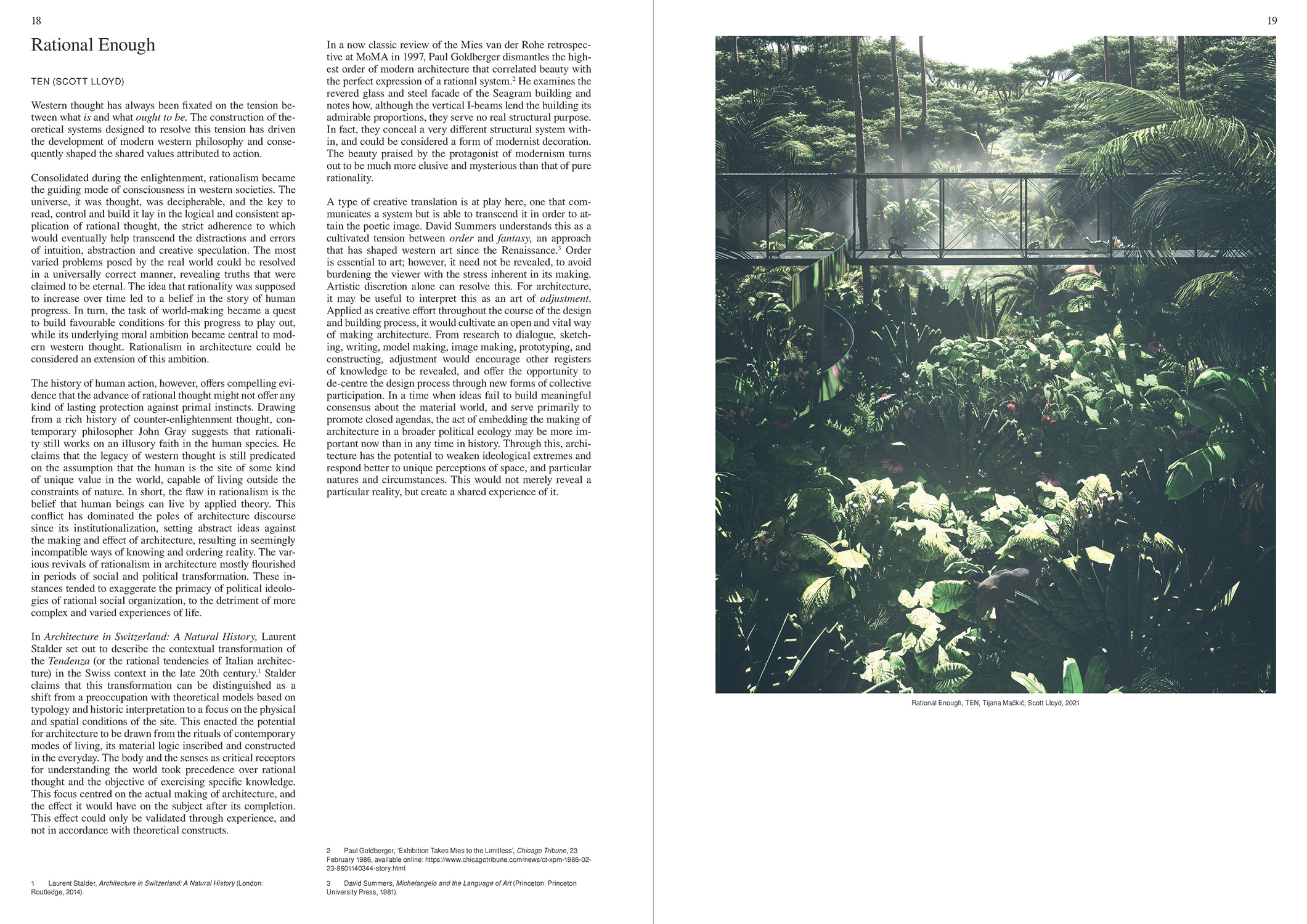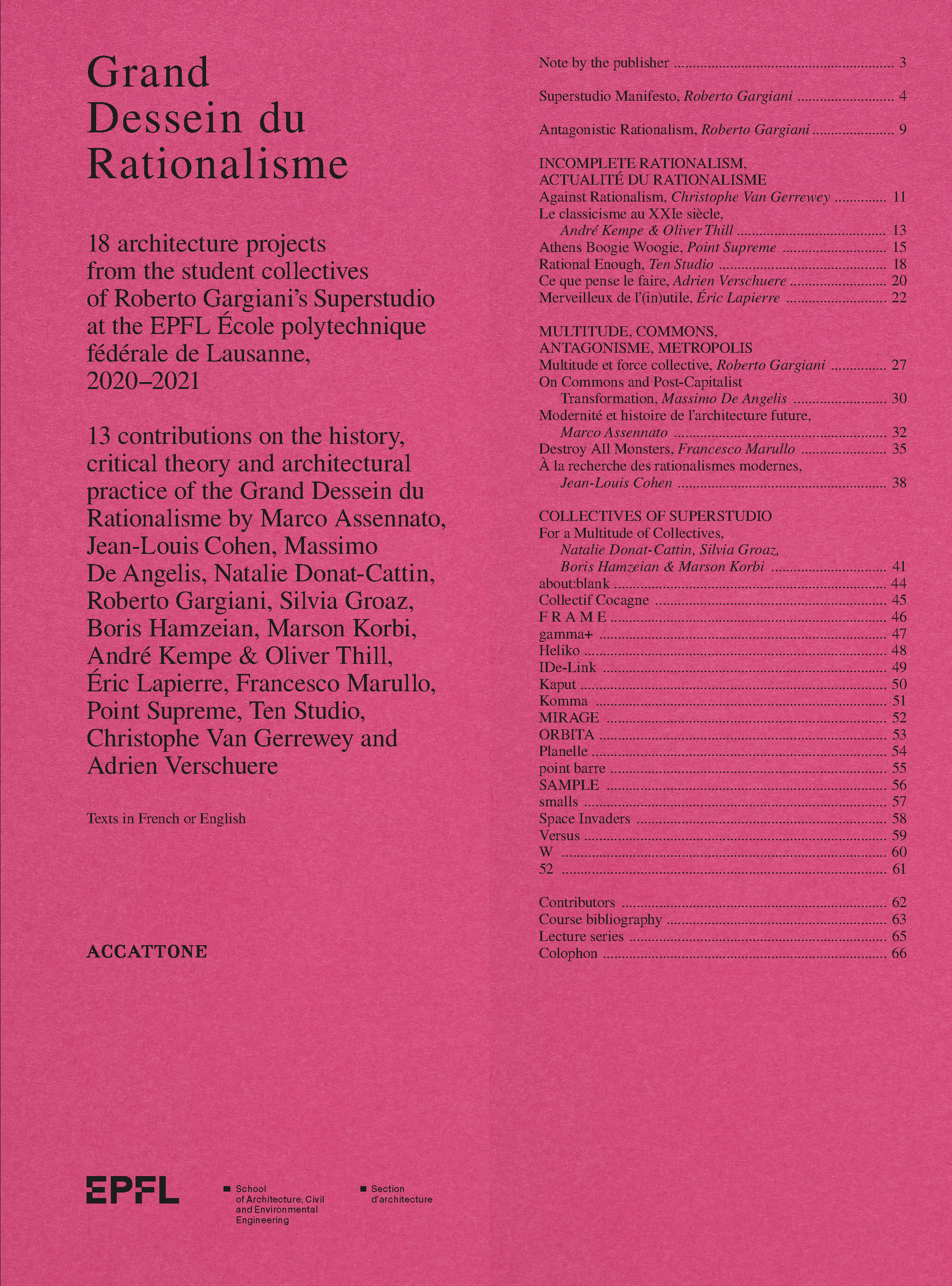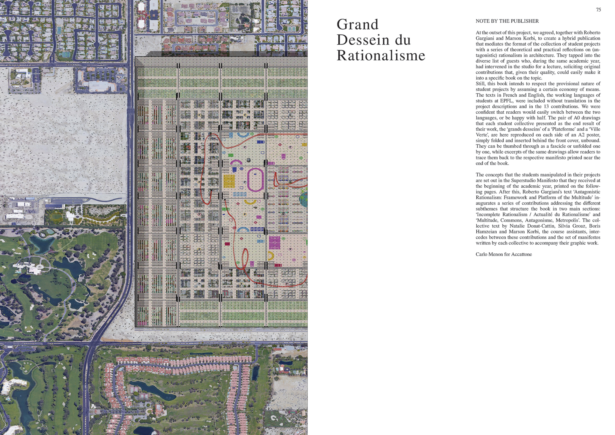 Grand Dessein du Rationalisme est une publication hybride qui rassemble dix-huit projets d'architecture des collectifs d'étudiants du Superstudio de Roberto Gargiani à l'École polytechnique fédérale de Lausanne, 2020-2021, et une série de treize réflexions théoriques, pratiques et historiques sur le rationalisme (antagoniste) en architecture.