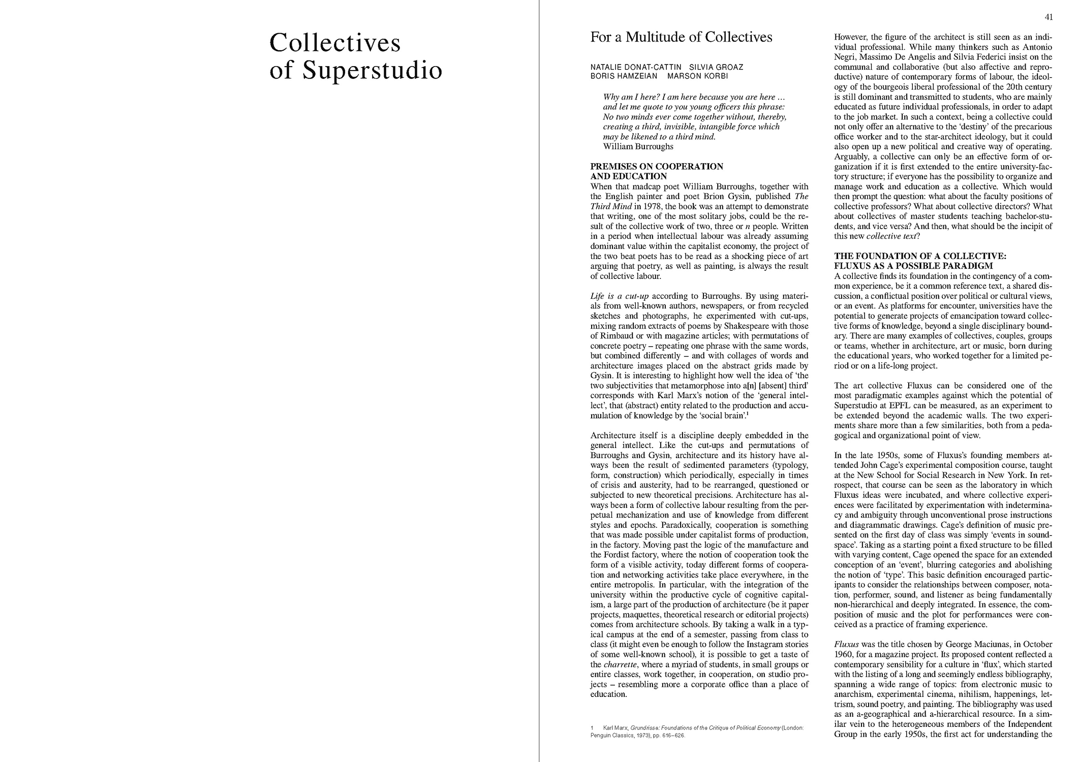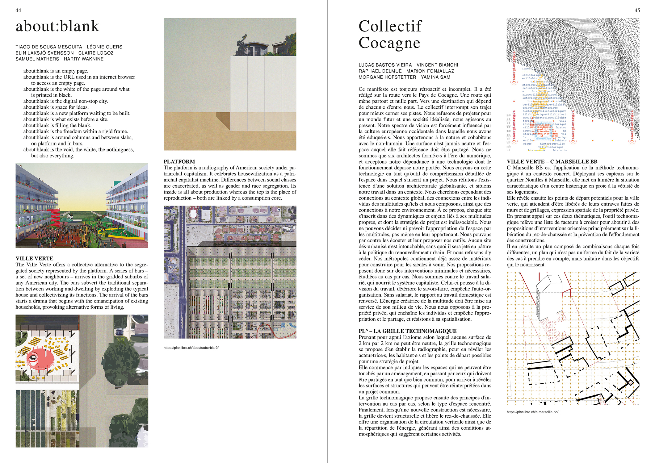 Textes de Marco Assennato, Jean-Louis Cohen, Massimo De Angelis, Natalie Donat-Cattin, Roberto Gargiani, Silvia Groaz, Boris Hamzeian, Marson Korbi, André Kempe & Oliver Thill, Éric Lapierre, Francesco Marullo, Point Supreme, Ten Studio, Christophe Van Gerrewey, Adrien Verschuere.