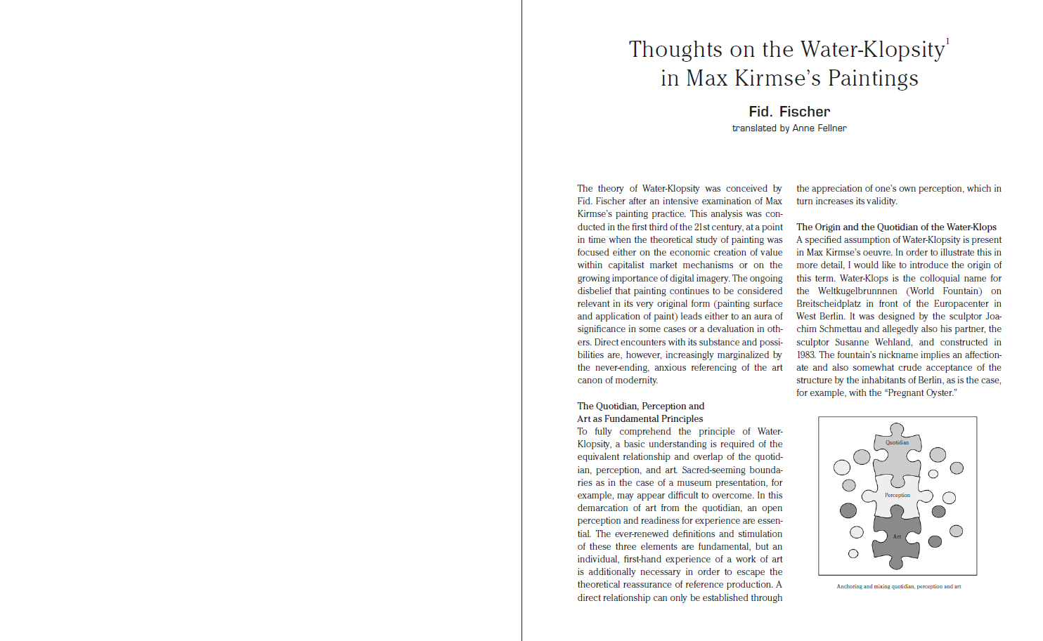 Catalogue / livre d'artiste avec 21 reproductions en couleur des peintures de l'artiste allemand Maximilian Kirmse, ainsi que plusieurs dessins. Le livre comprend un poème en prose de Jan Koslowski et un essai de Fid. Fischer qui situe l'œuvre de Kirmse dans la peinture contemporaine.