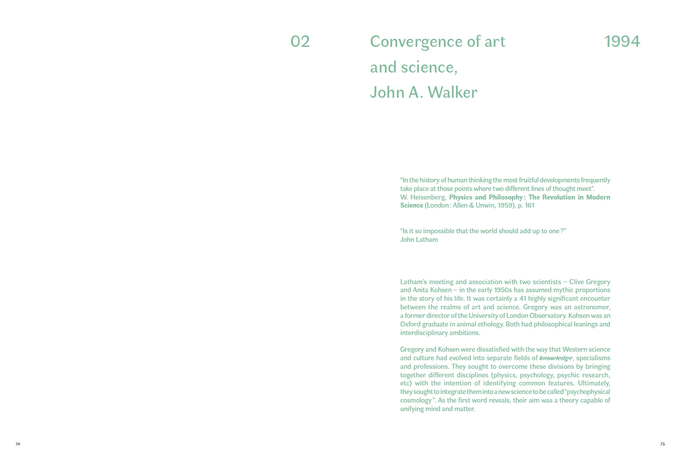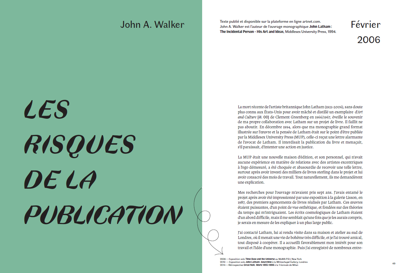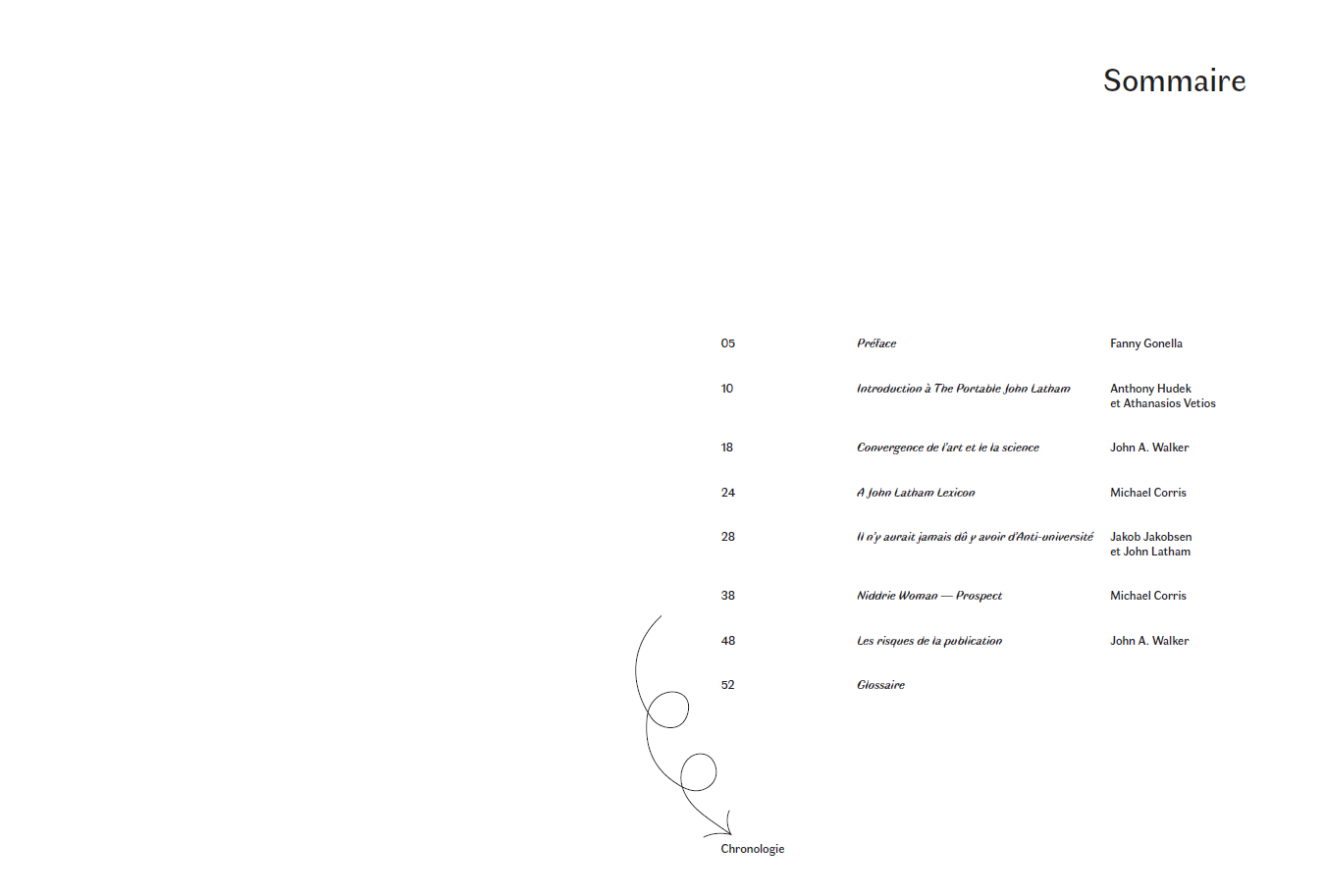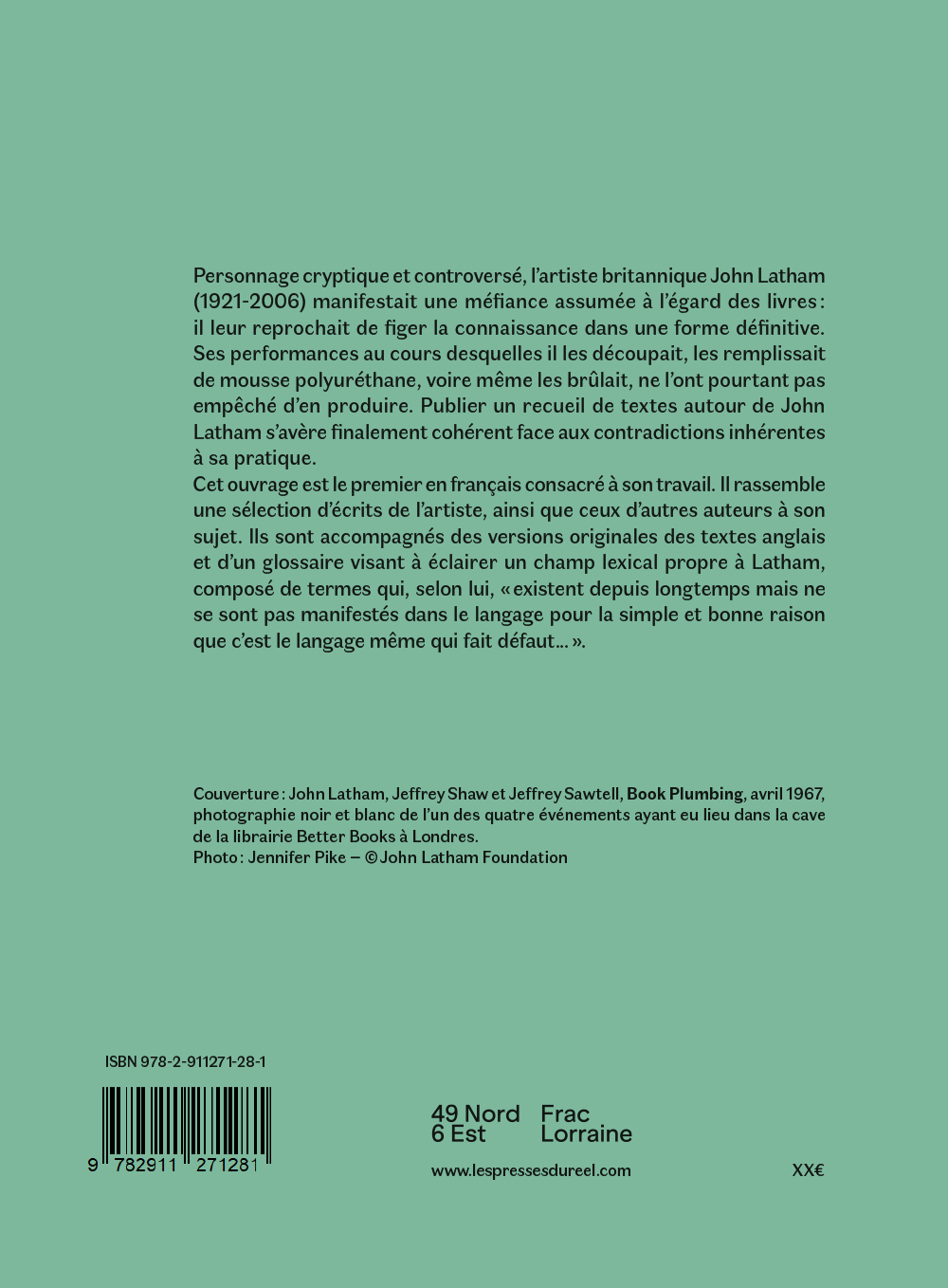 Personnage cryptique et controversé, l'artiste britannique John Latham manifestait une méfiance assumée à l'égard des livres : il leur reprochait de figer la connaissance dans une forme définitive. Ses performances au cours desquelles il les découpait, les remplissait de mousse polyuréthane, voire même les brûlait, ne l'ont pourtant pas empêché d'en produire. Publier un recueil de textes autour de John Latham s'avère finalement cohérent face aux contradictions inhérentes à sa pratique.