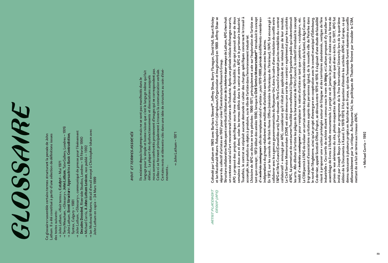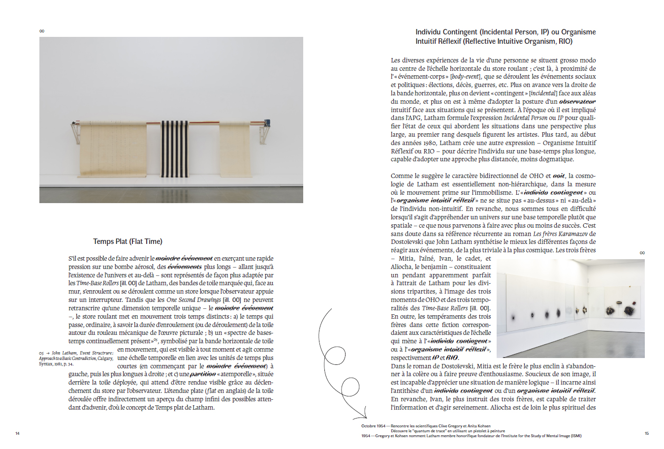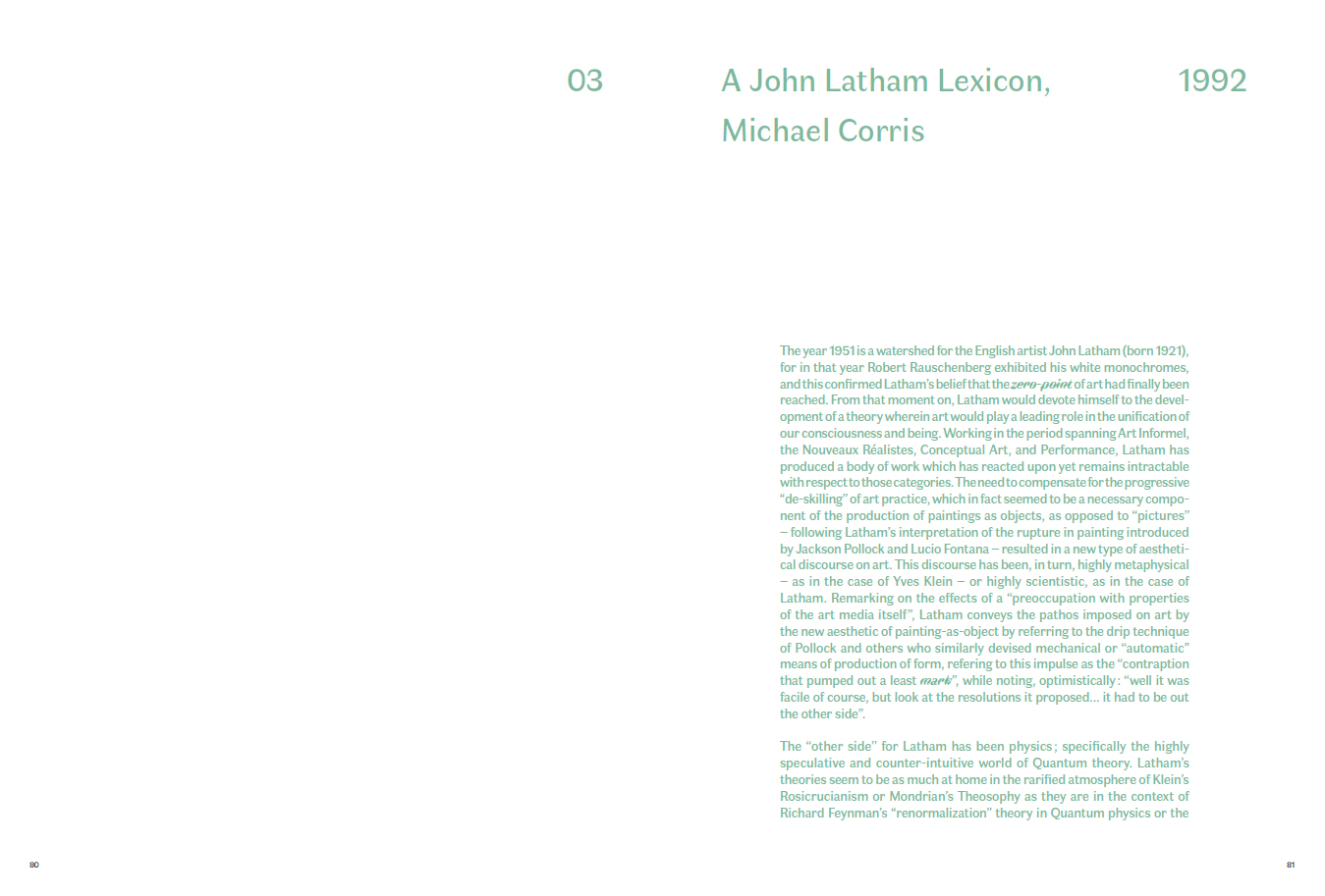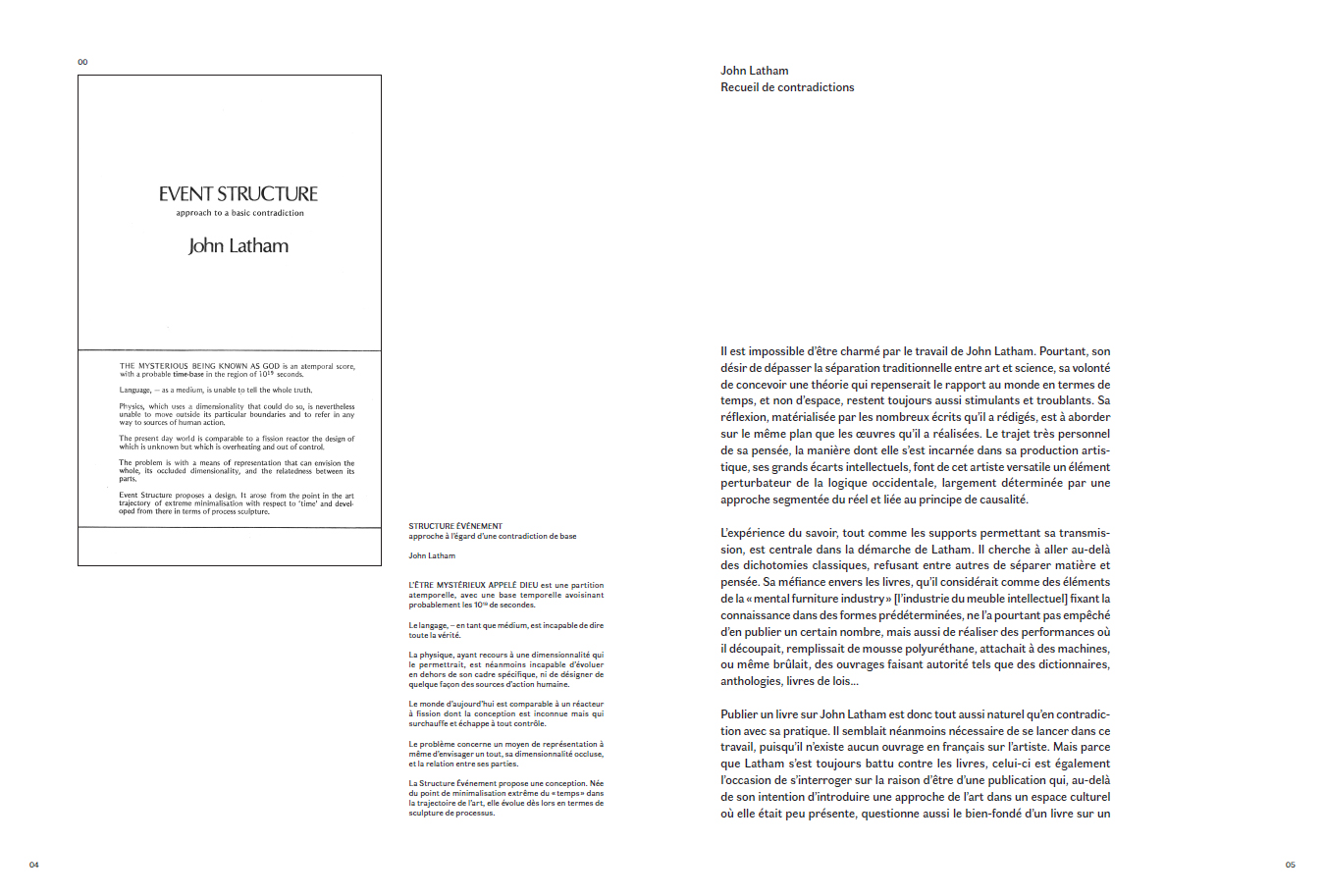 Cet ouvrage est le premier en français consacré à son travail. Il rassemble une sélection d'écrits de l'artiste, ainsi que ceux d'autres auteurs à son sujet. Ils sont accompagnés des versions originales des textes anglais et d'un glossaire visant à éclairer un champ lexical propre à Latham, composé de termes qui, selon lui, « existent depuis longtemps mais ne se sont pas manifestés dans le langage pour la simple et bonne raison que c'est le langage même qui fait défaut… ».
