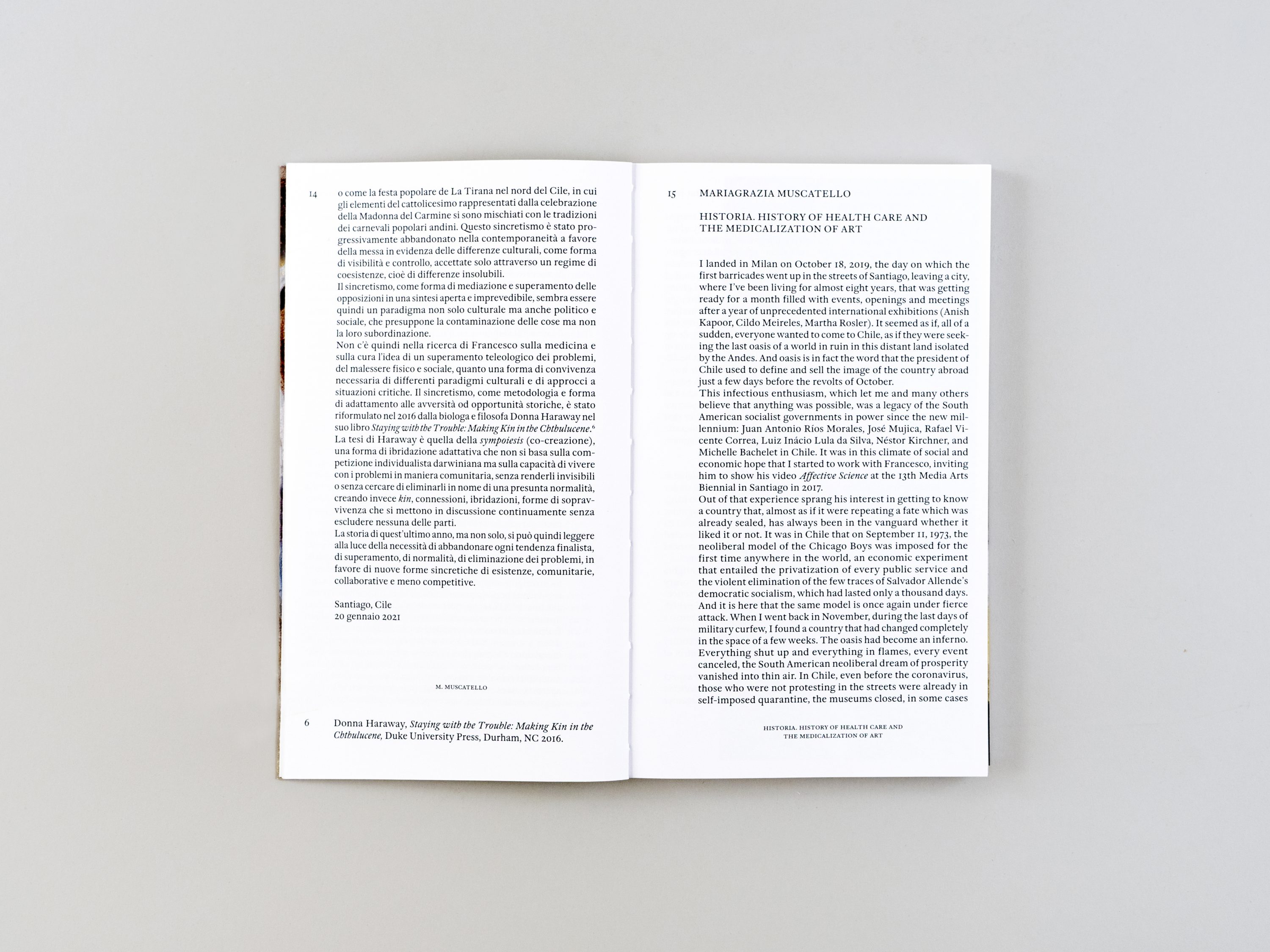 Cette publication est consacrée à l'œuvre vidéo et à la série photographique Historia (2021). Enquête sur l'histoire de la médecine chilienne, le projet souligne le passage du savoir ancestral à la science, du soin collectif au salut individuel. Avec des essais inédits sur la biopolitique, la « médicalisation » de l'art, la médecine sociale et le droit à la santé, ainsi que deux contributions littéraires sur les sujets et de nombreuses illustrations, le livre interroge les relations entre l'hospitalisation et le contrôle social, la science et l'idée plus large de soin.