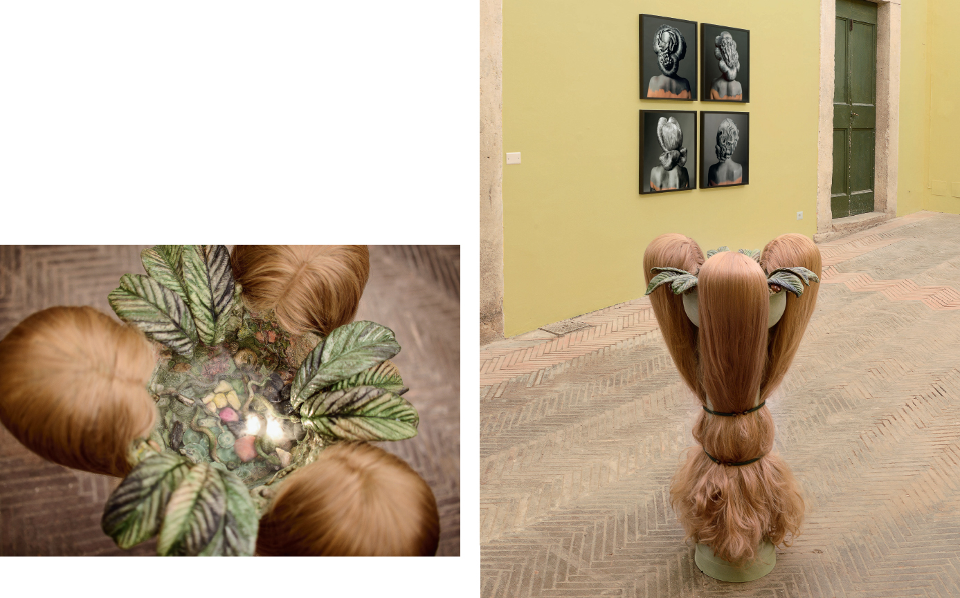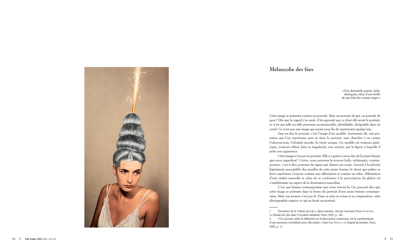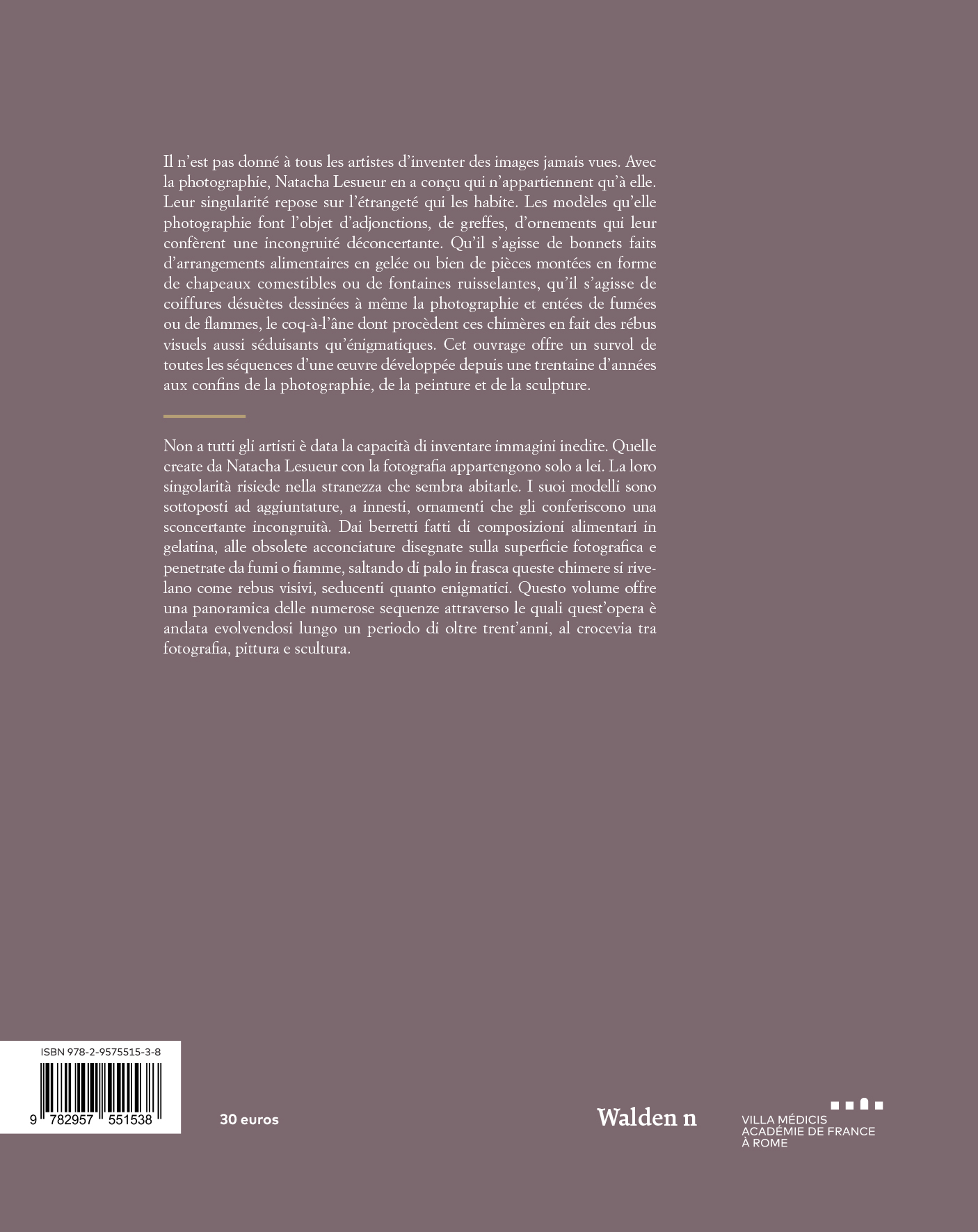 Il n'est pas donné à tous les artistes d'inventer des images jamais vues. Avec la photographie, Natacha Lesueur en a conçu qui n'appartiennent qu'à elle. Leur singularité repose sur l'étrangeté qui les habite. Les modèles qu'elle photographie font l'objet d'adjonctions, de greffes, d'ornements qui leur confèrent une incongruité déconcertante. Qu'il s'agisse de bonnets faits d'arrangements alimentaires en gelée ou bien de pièces montées en forme de chapeaux comestibles ou de fontaines ruisselantes, qu'il s'agisse de coiffures désuètes dessinées à même la photographie et entées de fumées ou de flammes, le coq-à-l'âne dont procèdent ces chimères en fait des rébus visuels aussi séduisants qu'énigmatiques.