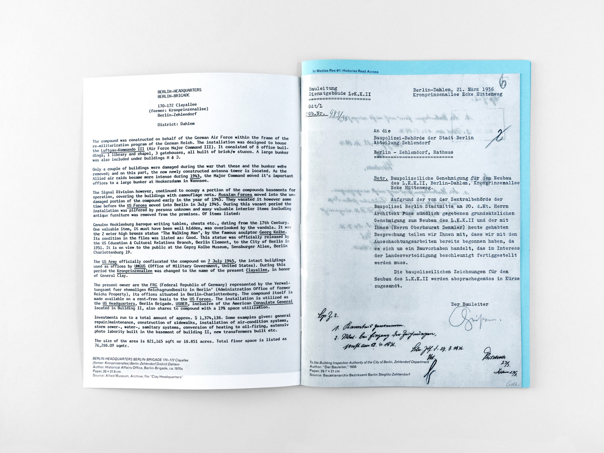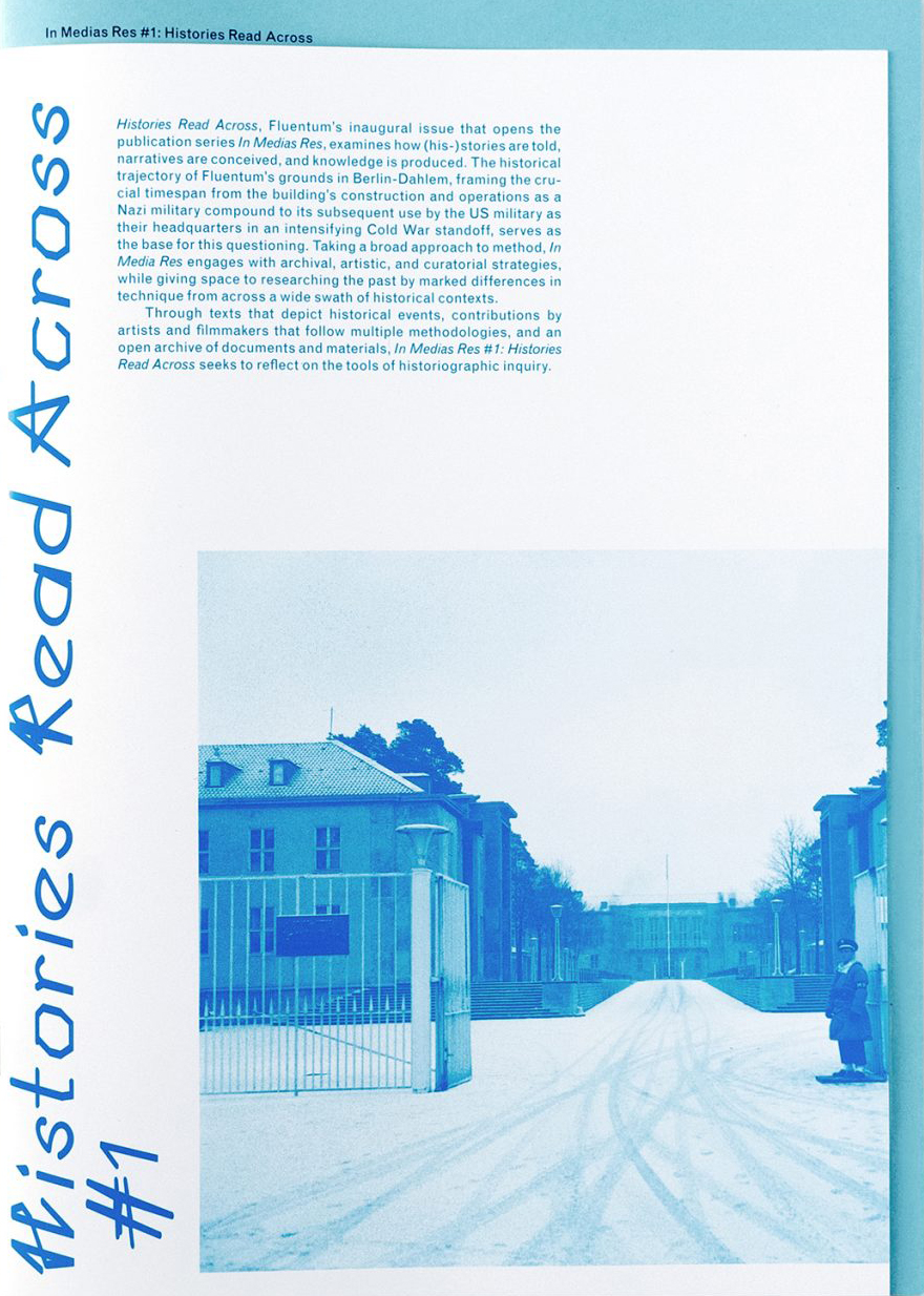 Inaugurant une série de publications éditées par Fluentum, le premier numéro Histories Read Across examine la manière dont les histoires sont racontées, les récits sont conçus et la connaissance est produite. La trajectoire historique du lieu même de Fluentum à Berlin-Dahlem, de la construction et de l'exploitation des bâtiments en tant que complexe militaire nazi à leur utilisation ultérieure par l'armée américaine en tant que quartier général dans le cadre de l'intensification de la guerre froide, sert de base à ce questionnement. En adoptant une approche méthodologique ouverte, In Media Res s'engage dans des stratégies archivistiques, artistiques et curatoriales, tout en laissant la place à la recherche du passé en soulignant les différences de techniques à travers un large éventail de contextes historiques.