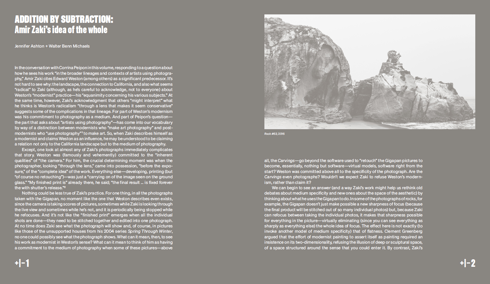 Un entretien avec la commissaire d'exposition et critique d'art Corrina Peipon met en lumière l'histoire de Zaki et ses préoccupations concernant la photographie et la technologie. L'essai des critiques littéraires Walter Benn Michaels et Jennifer Ashton examine les stratégies de manipulation de l'espace de Zaki à travers une « uniformité » obtenue en créant un objet parfaitement focalisé techniquement, défiant la logique visuelle. Se référant à l'histoire de la photographie de paysage et de la photographie moderne en Californie (Edward Weston, Ansel Adams), Michaels et Ashton montrent que la manière dont Zaki intègre la technologie à cette tradition aboutit à une « addition par soustraction » de la troisième dimension.