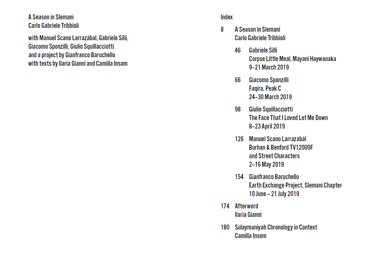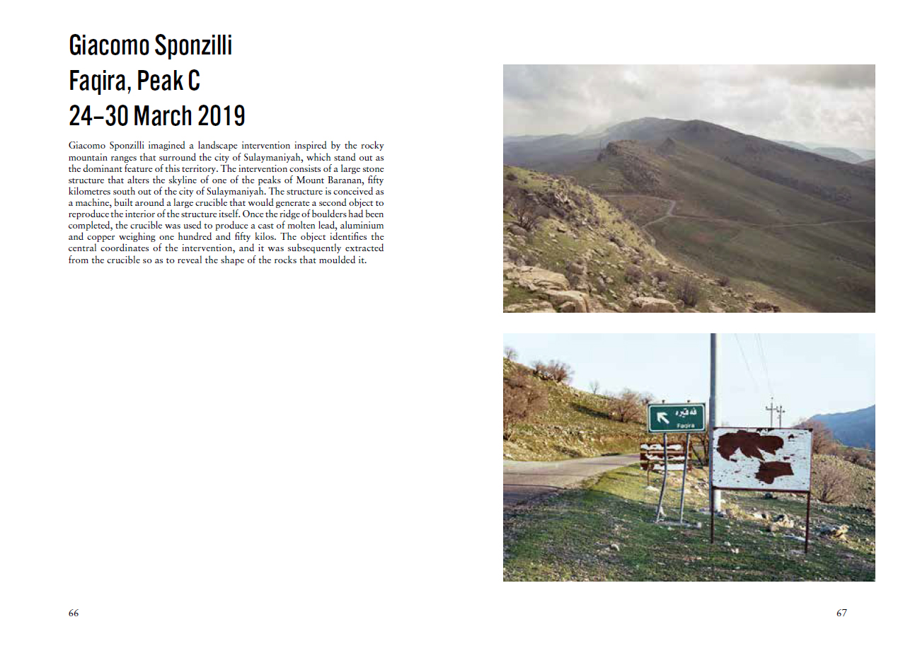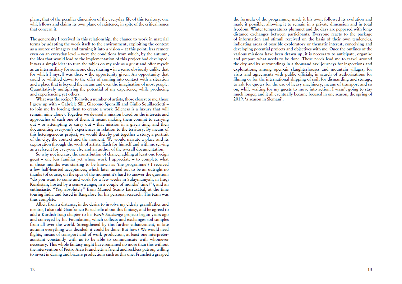 Entre mars et juin 2019, Carlo Gabriele Tribbioli a invité un certain nombre d'artistes à le rejoindre et à développer chacun un projet artistique dans la ville de Sulaymaniyah (Slemani, en kurde), dans la région du Kurdistan irakien. Ces invitations ont donné lieu à une série de résidences d'artistes et de projets de collaboration à distance, développant la question du rapport au territoire : un territoire qui a accueilli et hébergé les artistes et leurs projets tout au long de cette expérience, au quotidien, une expérience menée à terme malgré les aspects critiques qui affectent la région et la difficulté objective d'y accéder.