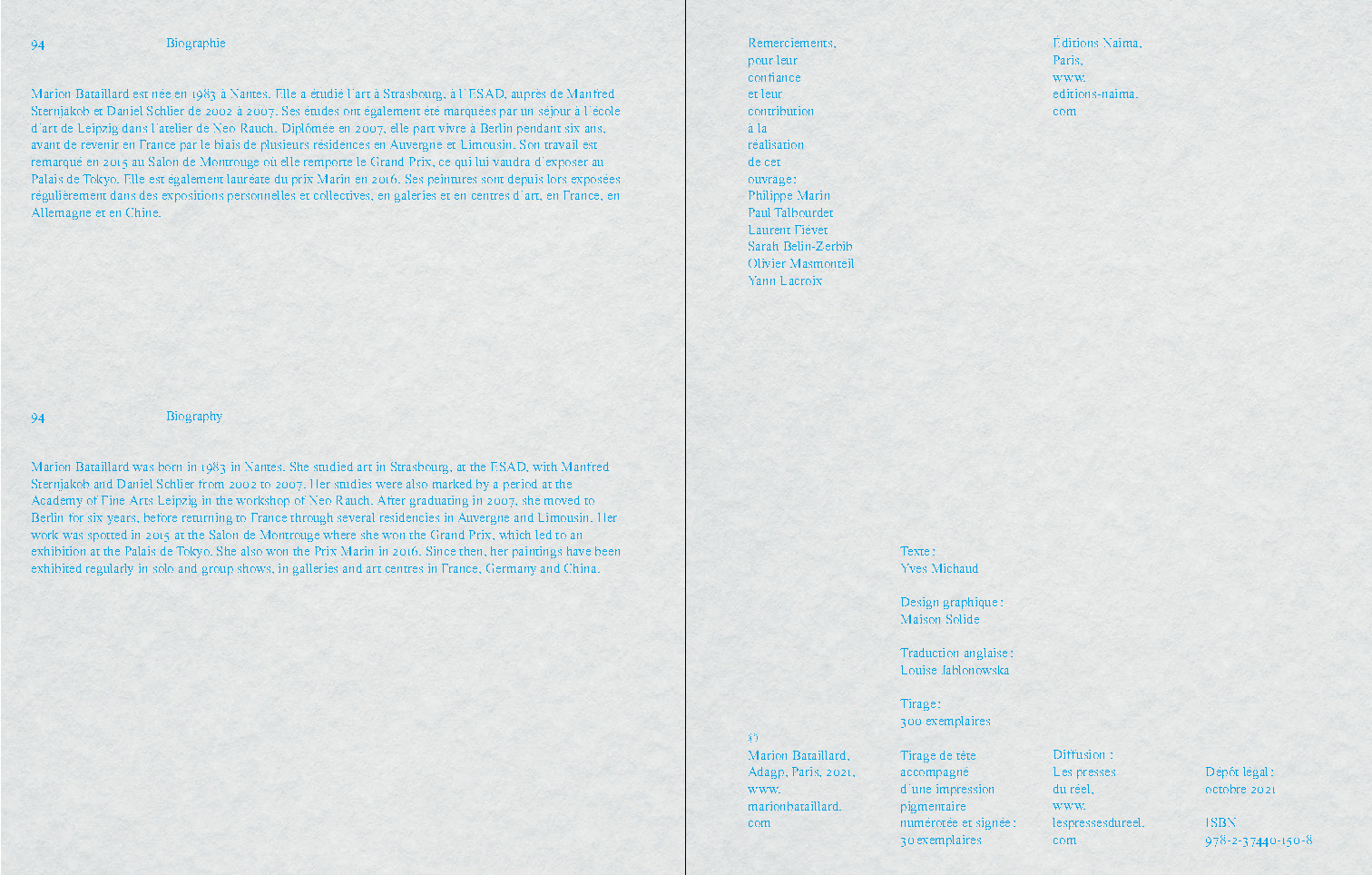 Née en 1983 à Nantes, Marion Bataillard vit et travaille à Paris. Diplômée de l'École Supérieure des Arts Décoratifs de Strasbourg (où elle suit les cours de Manfred Sternjakob et Daniel Schlier) en 2007, elle est ensuite formée par Neo Rauch à l'École Supérieure des Beaux-Arts de Leipzig (HGB), s'exile à Berlin pendant sept ans puis s'installe à Paris en 2015. Elle remporte le Grand Prix du 60e Salon de Montrouge, expose au Palais de Tokyo et est lauréate du prix Marin en 2016. Chaque année voit ensuite Marion Bataillard expérimenter de nouvelles manières de vivre sa peinture, en résidence ou en exposition personnelle ou collective. Paris, Vienne, Berlin ou Pékin ont ainsi accueilli ses créations sensibles et incarnées. Les corps y sont nus, « sacrificiels ». Le désir y est cru, au même titre que la lumière ; et tous deux exhaussent, avec douceur mais sans complaisance, le goût du réel. Consciente de la lisière sur laquelle l'âme humaine se meut, c'est en conscience que l'artiste ébranle notre univers mental.