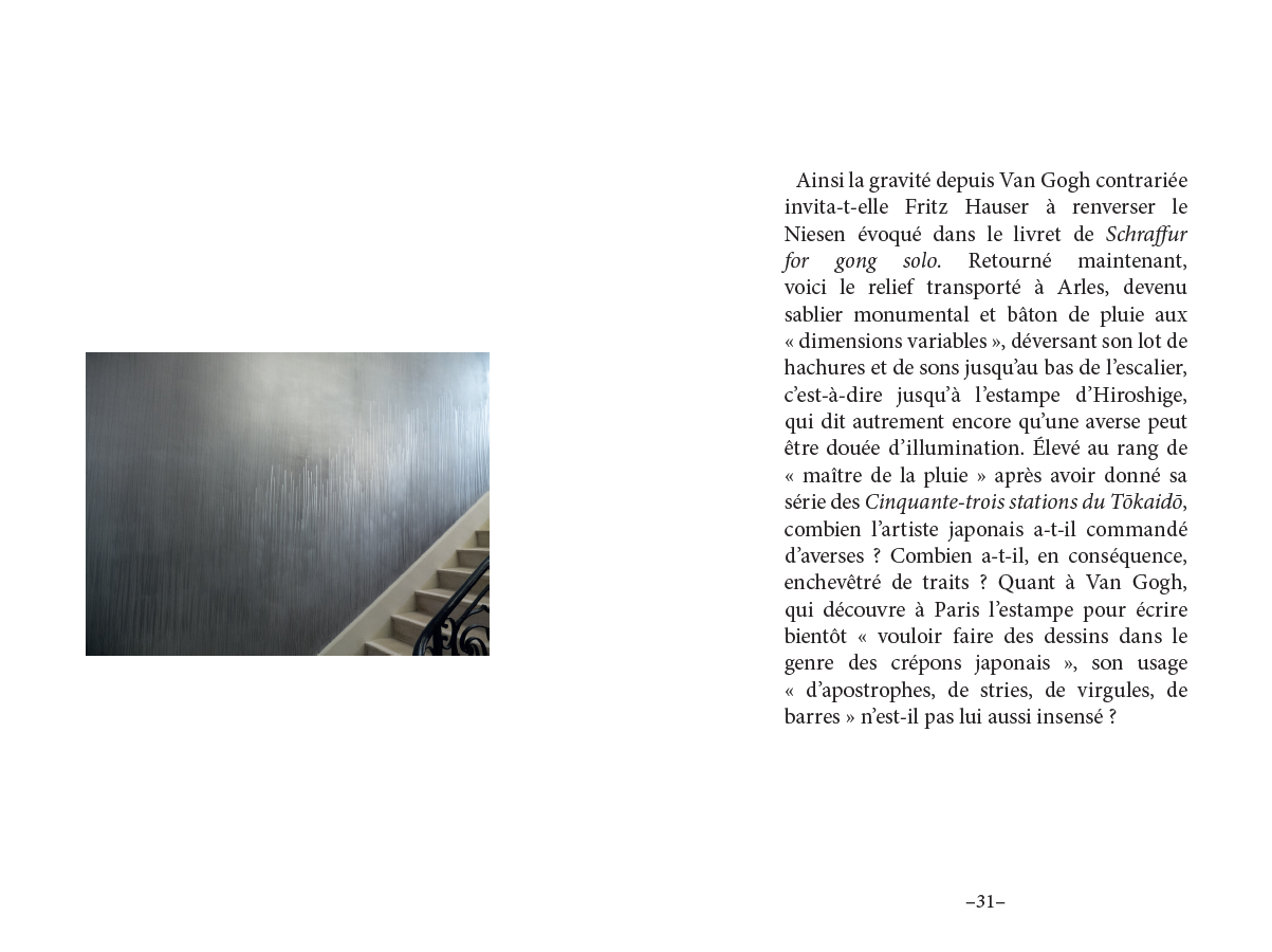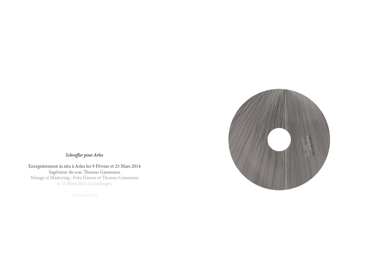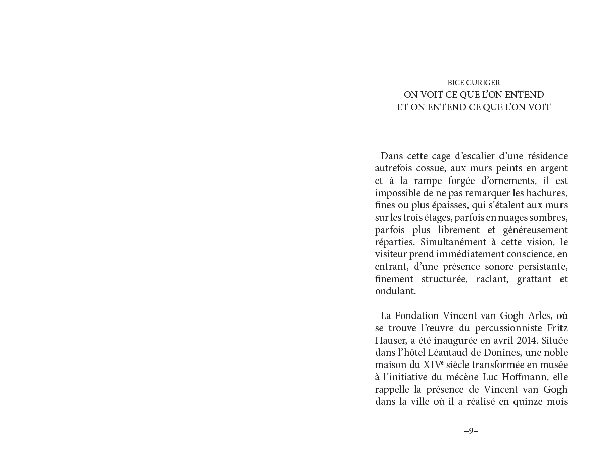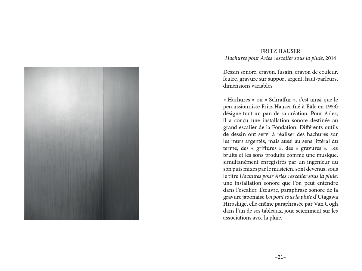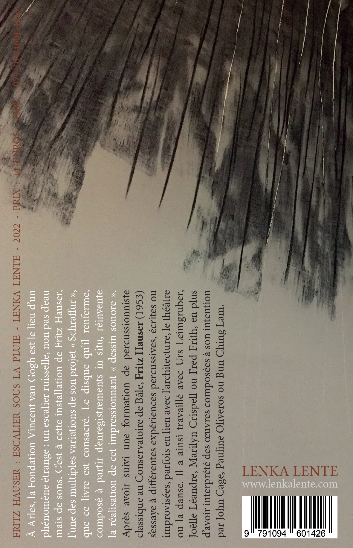 À Arles, la Fondation Vincent van Gogh est le lieu d'un phénomène étrange : un escalier ruisselle, non pas d'eau mais de sons. C'est à cette œuvre de Fritz Hauser, installation qui est l'une des multiples variations de son projet « Schraffur », que ce livre est consacré. Sur le disque qui l'accompagne, Schraffur pour Arles, composé à partir d'enregistrements in situ, réinvente la réalisation de cet impressionnant « dessin sonore ».
