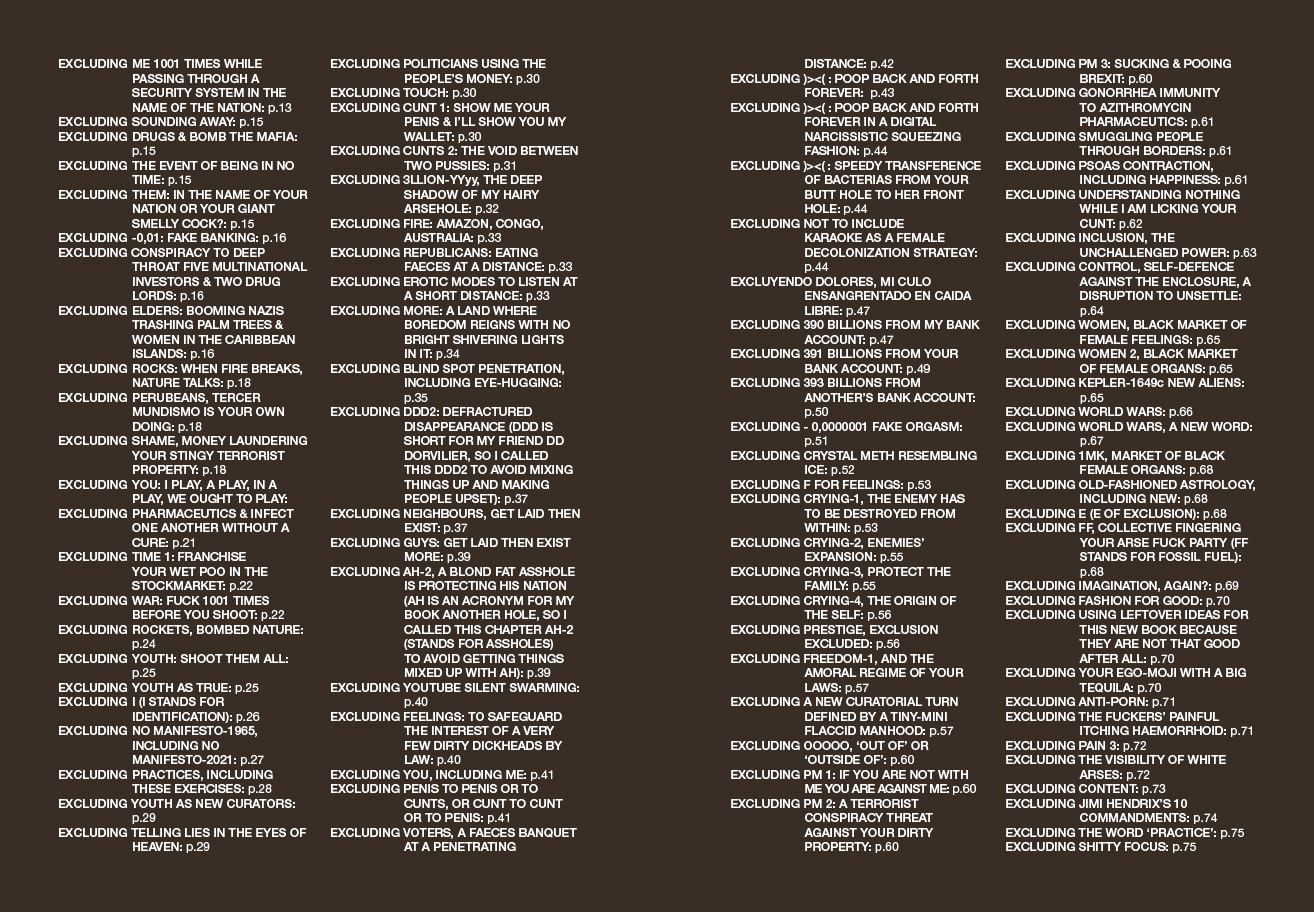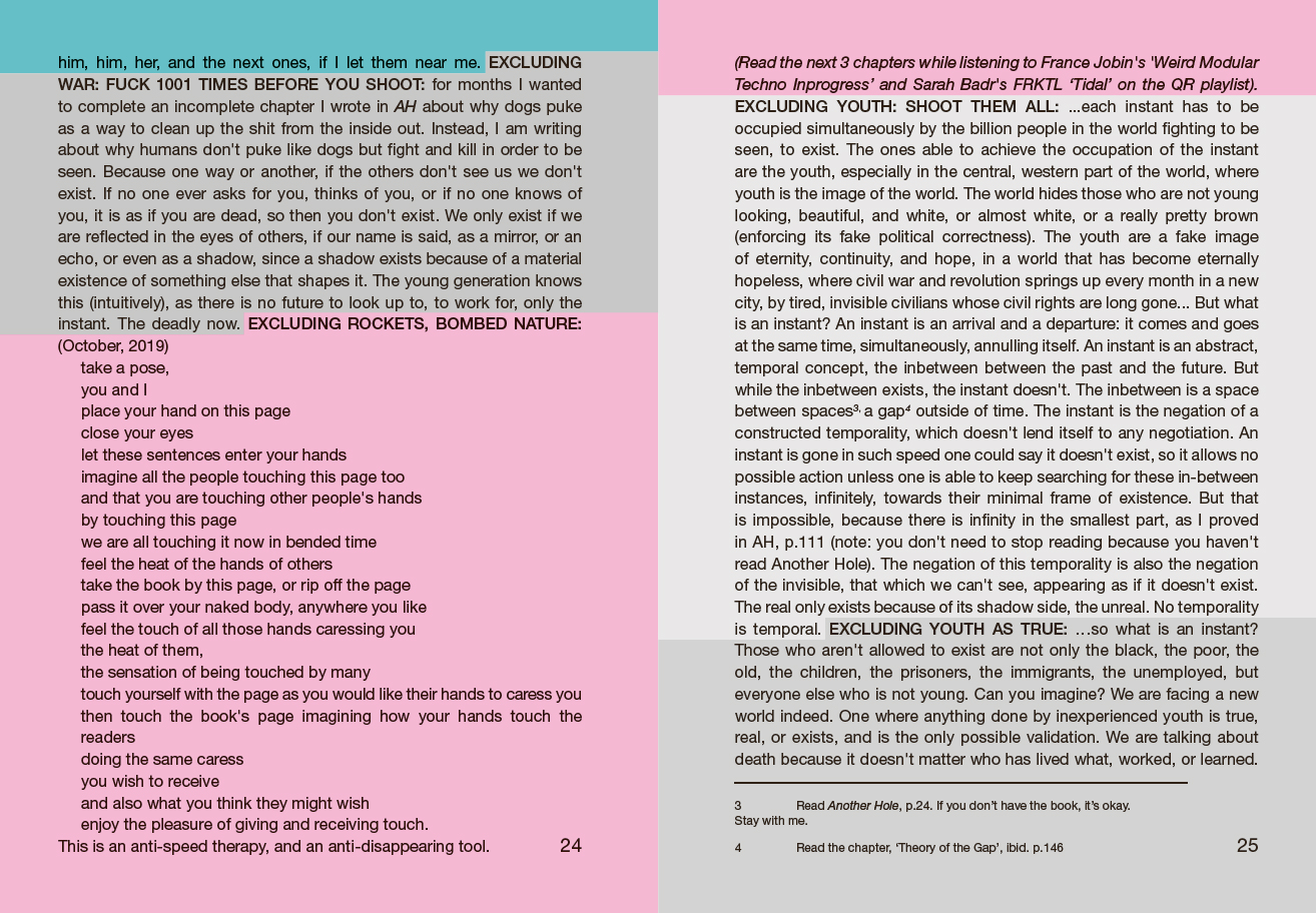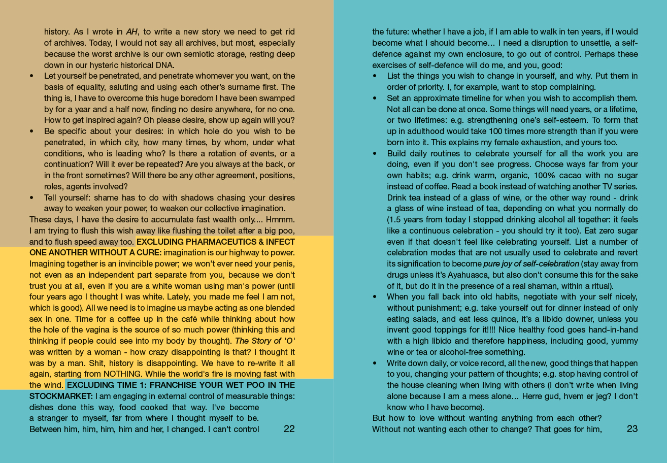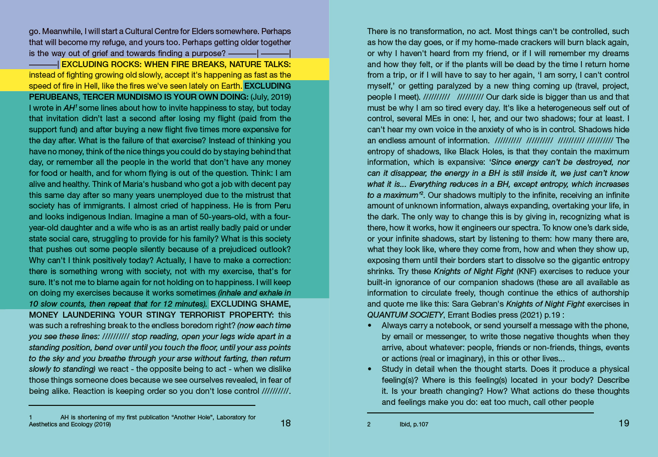 performance et intègrent vidéo, la photographie, le son et le texte, médiatisés par le corps dansant. Ses publications revendiquent l'auto-institution de son savoir propre, indépendamment de toute validation institutionnelle, suivant la conviction que les citoyens doivent rechercher d'autres systèmes de soutien civil, en particulier à une époque où les institutions et l'État sont incapables de répondre aux besoins de ses citoyens. Ses écrits, spéculatifs et déstabilisants, étudient, comme toutes ses œuvres artistiques, le fonctionnement du pouvoir. Son intérêt pour le mouvement l'a conduite à l'étude de la physique quantique, à partir de laquelle elle a développé une théorie pour une société quantique, la danse quantique, l'intimité sociale et la théorie de l'écart.