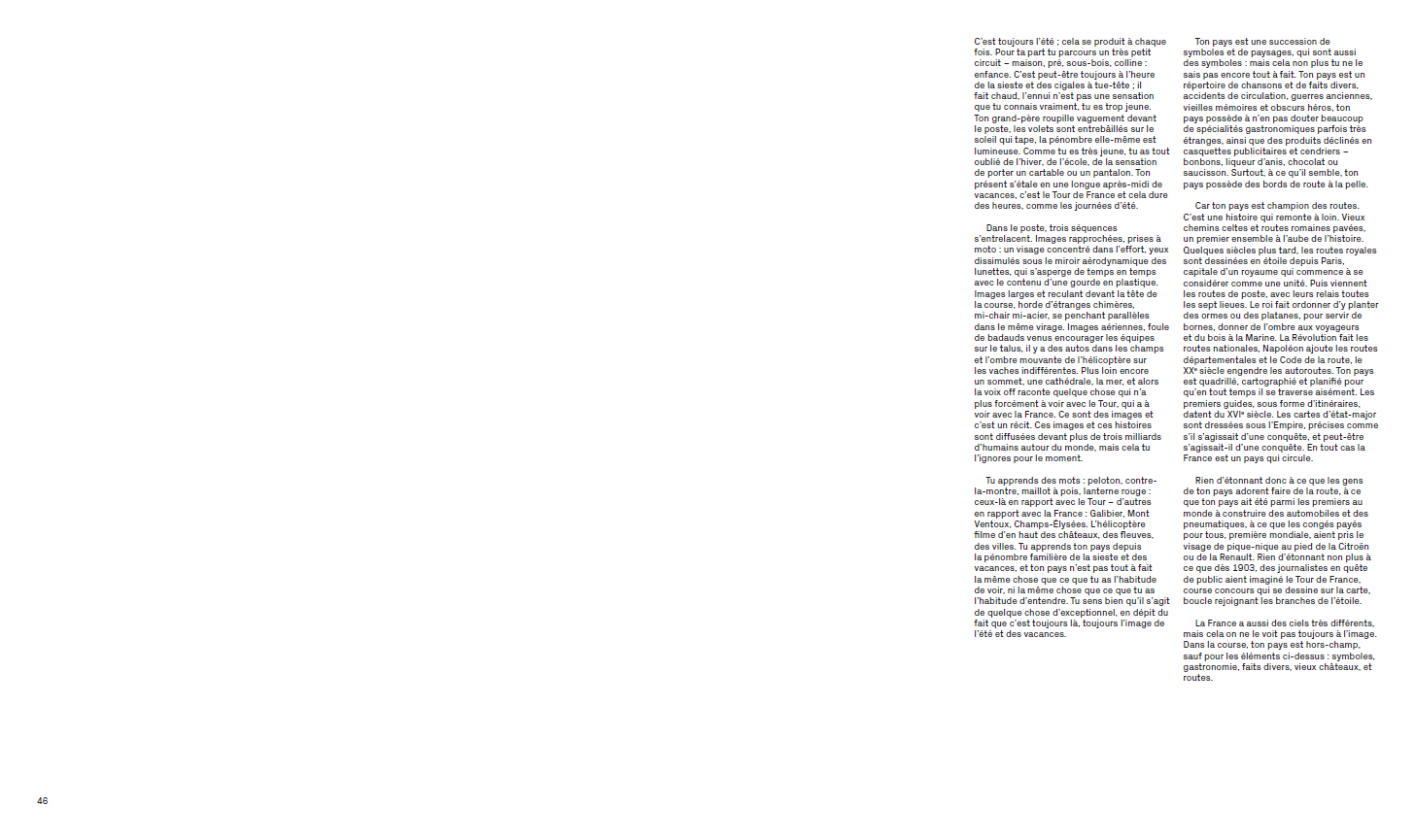 Depuis plus d'un siècle, Le Tour de France n'offre pas seulement une image de l'Hexagone au monde entier ; il en écrit la légende, avec ses grands hommes, ses gloires sportives et ses exploits industriels, son patrimoine immortel. La compétition donne aux tronçons de bitume anodins et aux villages anonymes des accents épiques. Mais que se passe-t-il, quand il ne se passe rien ? À rebours de l'héroïsme sportif, du pittoresque et de la société du spectacle, Louis Canadas et l'écrivaine Fanny Taillandier racontent la banalité de ces voies de passage, captent le langage mystérieux des hommes lorsqu'ils tissent des relations avec le territoire, auscultent le mythe de la compétition pour nous désenvoûter.