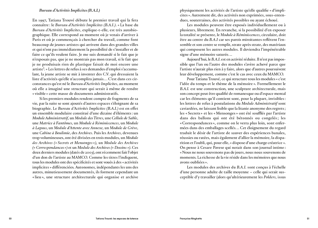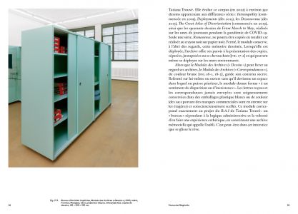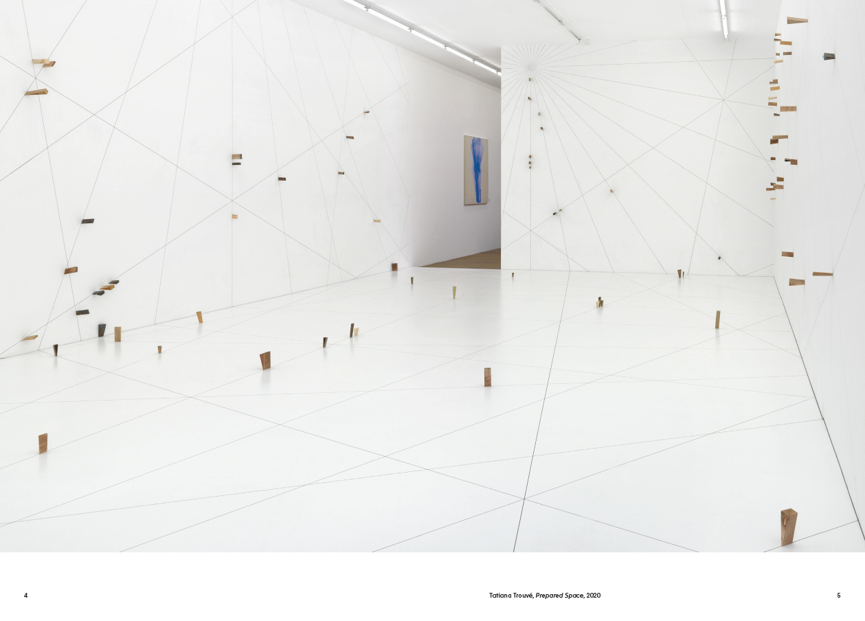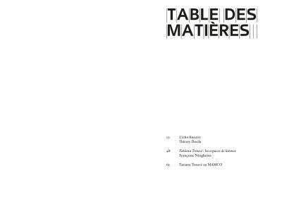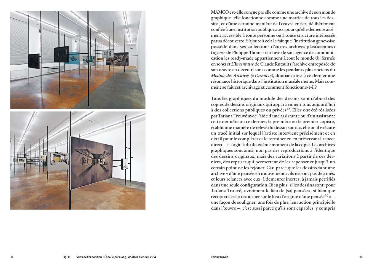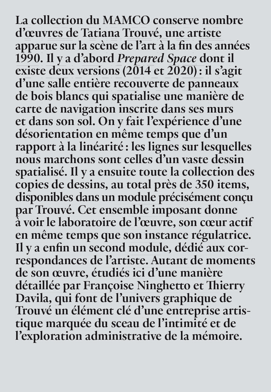 La collection du MAMCO conserve nombre d'œuvres de Tatiana Trouvé, une artiste apparue sur la scène de l'art à la fin des années 1990. Il y a d'abord Prepared Space dont il existe deux versions (2014 et 2020) : il s'agit d'une salle entière recouverte de panneaux de bois blancs qui spatialise une manière de carte de navigation inscrite dans ses murs et dans son sol. On y fait l'expérience d'une désorientation en même temps que d'un rapport à la linéarité : les lignes sur lesquelles nous marchons sont celles d'un vaste dessin spatialisé. Il y a ensuite toute la collection des copies de dessins, au total près de 350 items, disponibles dans un module précisément conçu par Trouvé. Cet ensemble imposant donne à voir le laboratoire de l'œuvre, son cœur actif en même temps que son instance régulatrice. Il y a enfin un second module, dédié aux correspondances de l'artiste. Autant de moments de son œuvre, étudiés ici d'une manière détaillée par Françoise Ninghetto et Thierry Davila, qui font de l'univers graphique de Trouvé un élément clé d'une entreprise artistique marquée du sceau de l'intimité et de l'exploration administrative de la mémoire.
