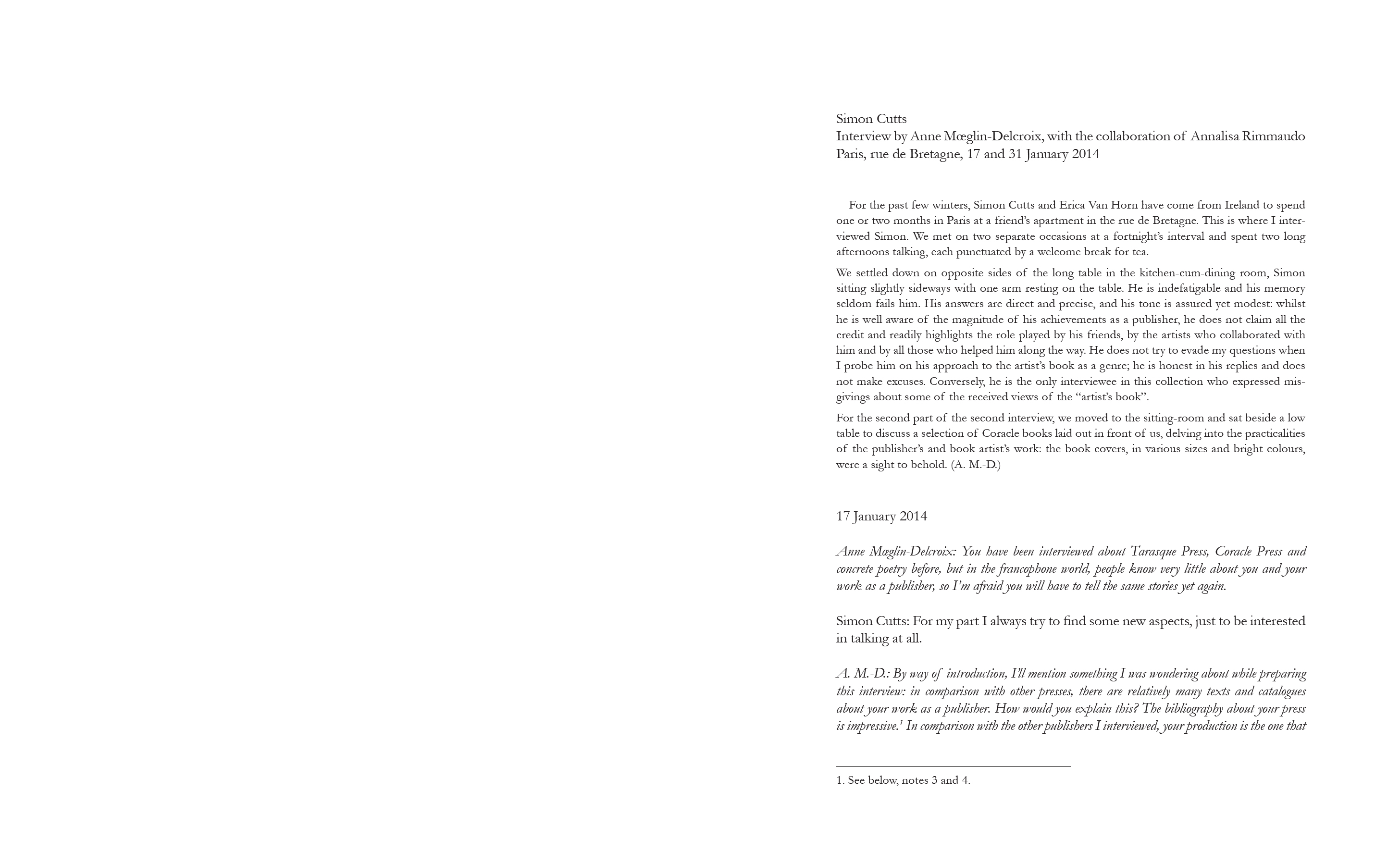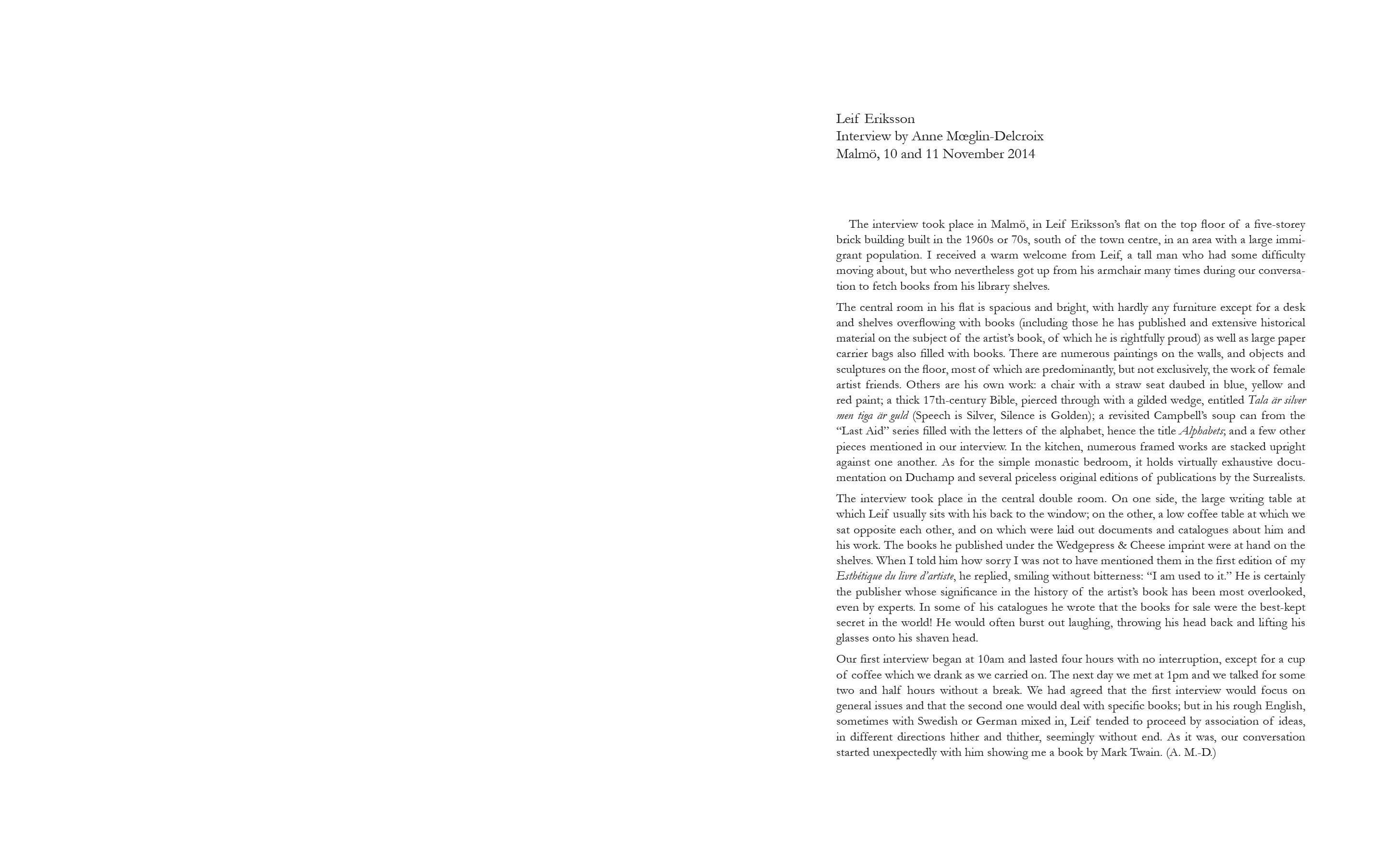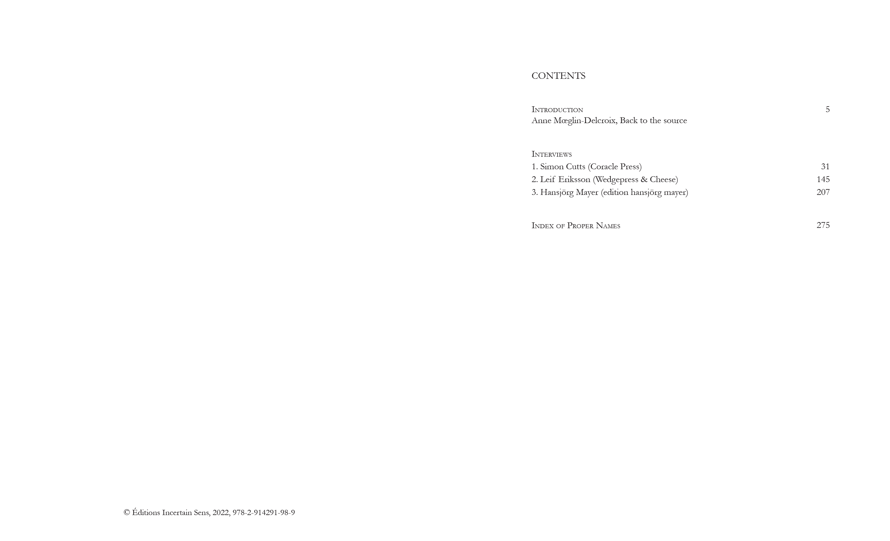 Entretiens avec un ensemble d'éditeurs pionniers du livre d'artiste : Simon Cutts, Hansjörg Mayer et Leif Eriksson.