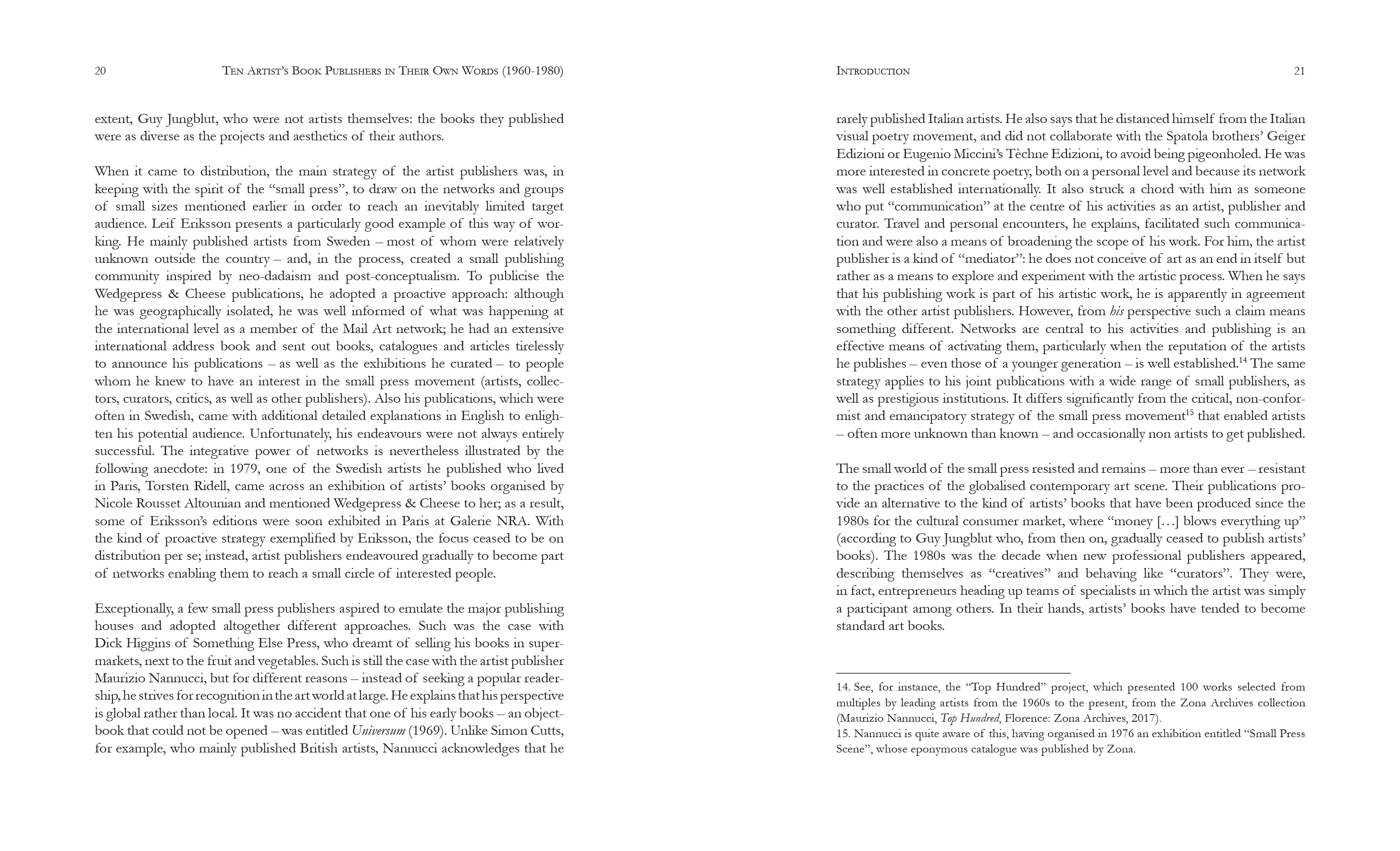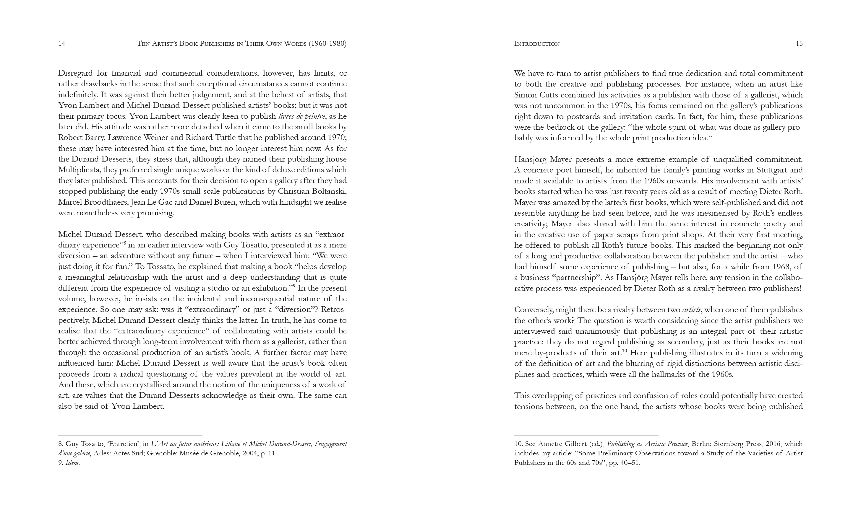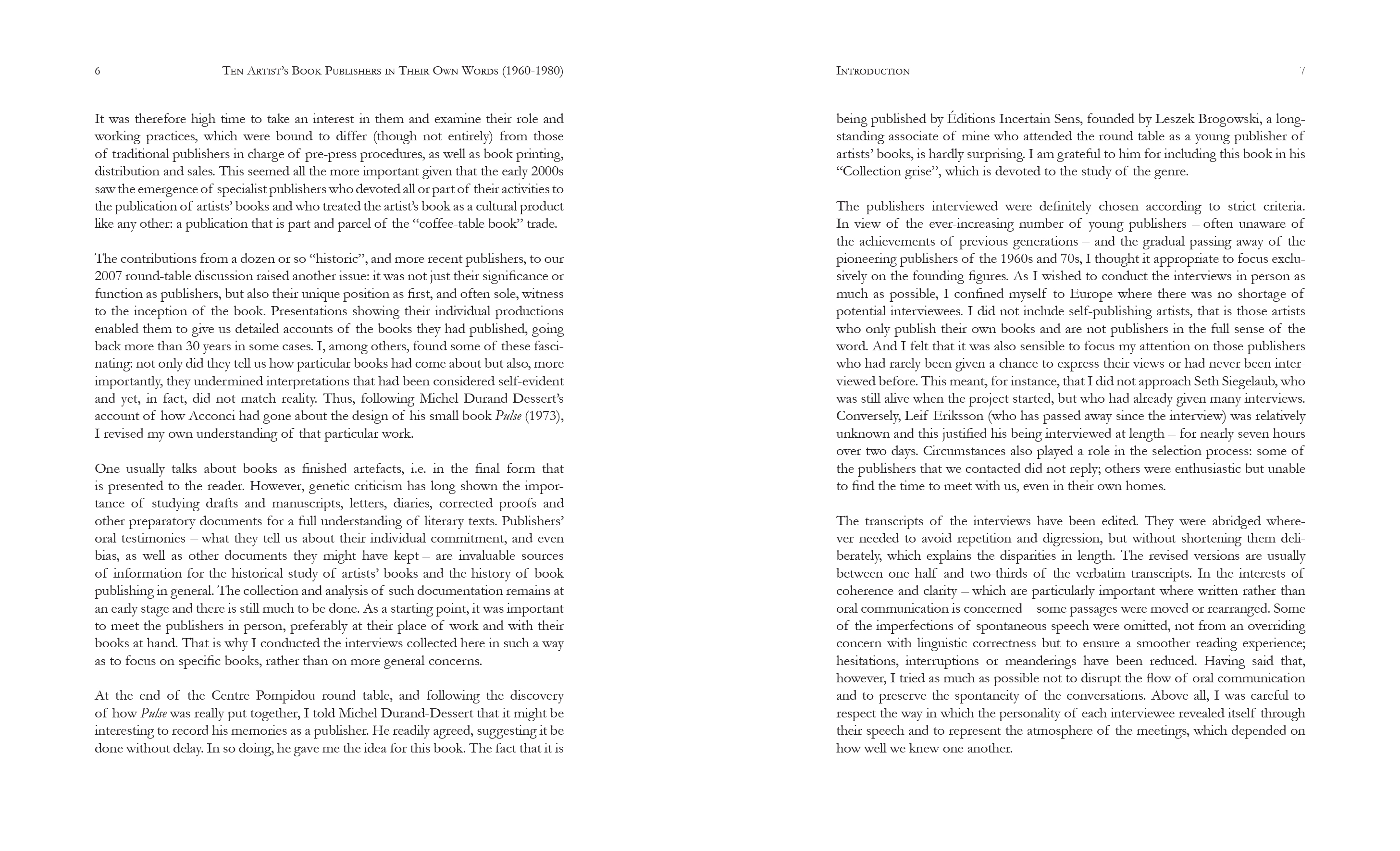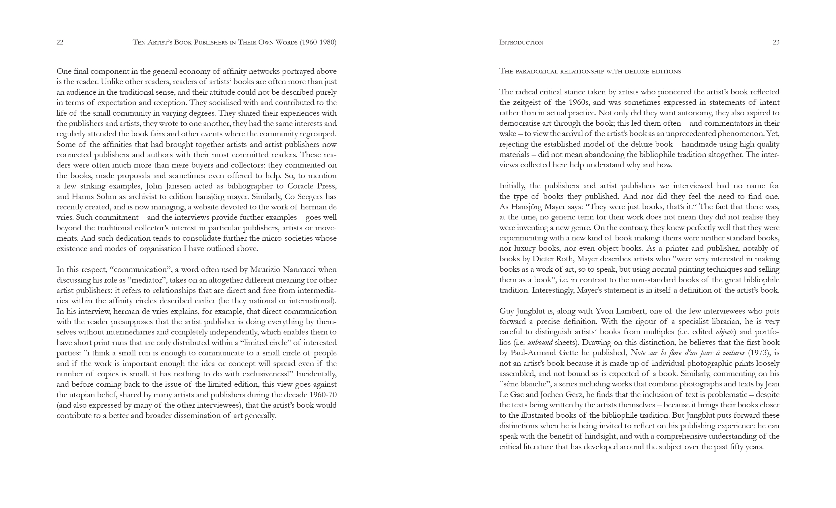 Cet ouvrage recueille les témoignages, en anglais, d'un ensemble d'éditeurs de livres d'artistes parmi les premiers. Durant les deux décennies fondatrices 1960 et 1970, ils ont été des pionniers dans le pays où ils exerçaient et où certains exercent encore : Hansjörg Mayer en Allemagne, Simon Cutts en Grande-Bretagne, Leif Eriksson en Suède.