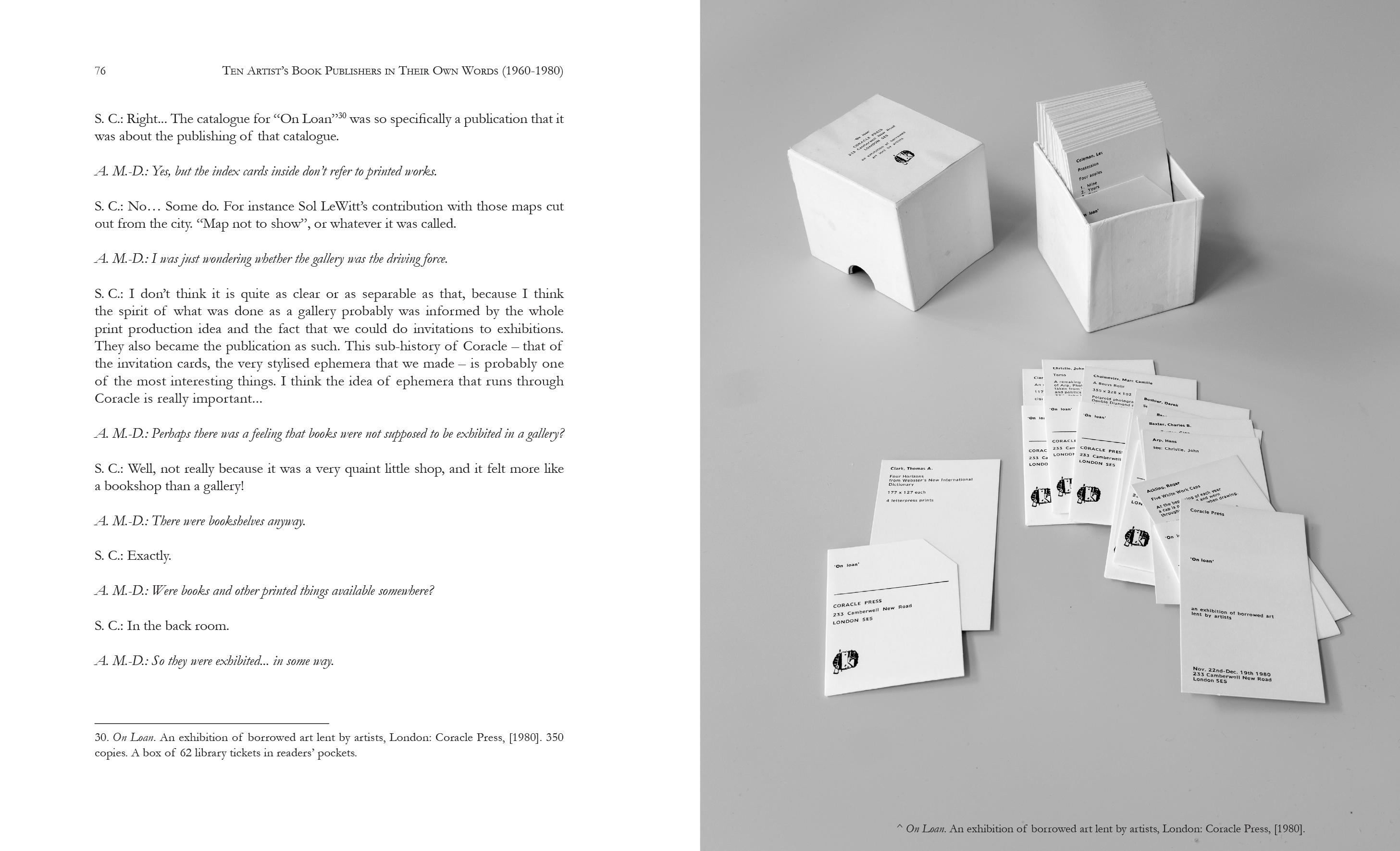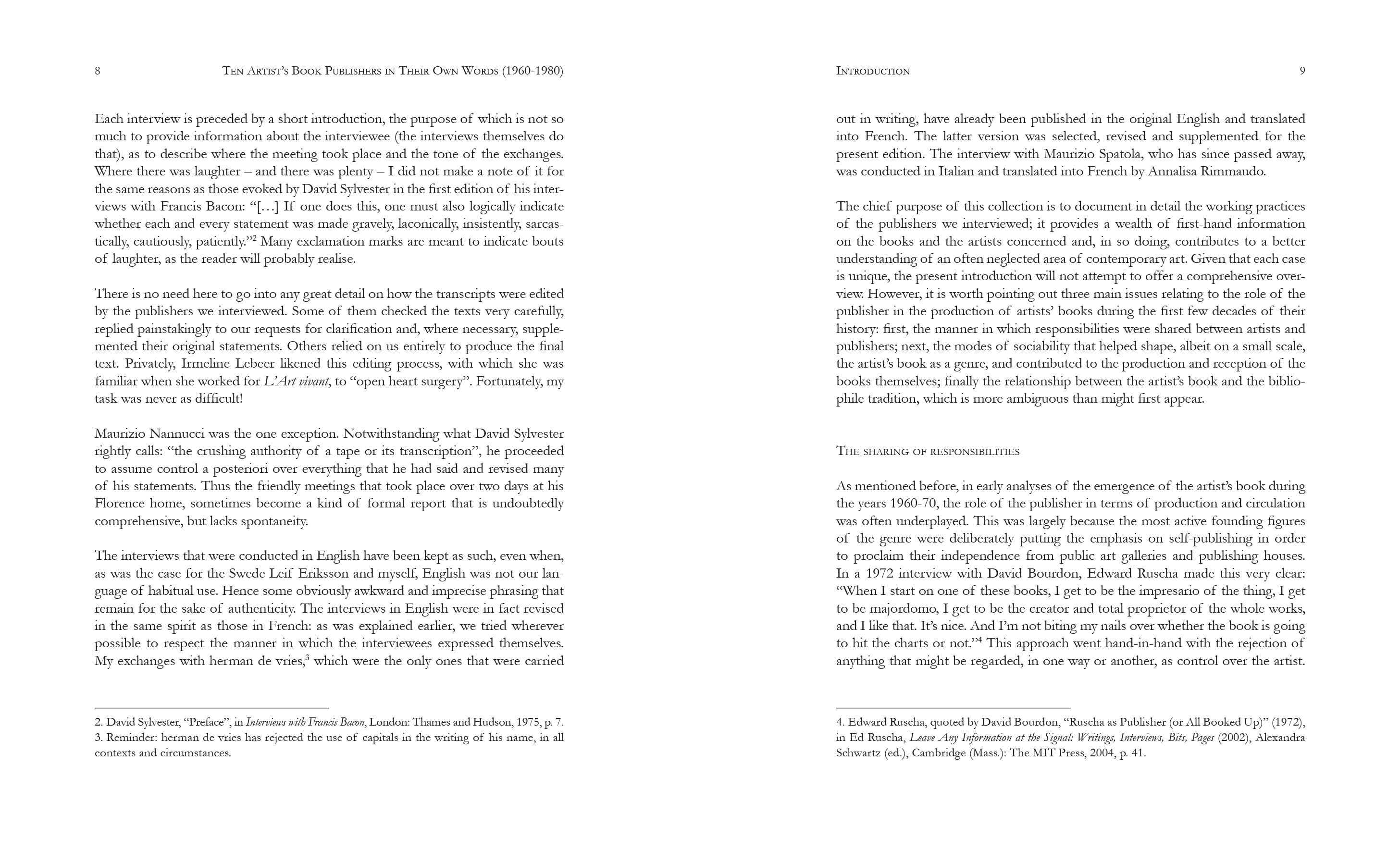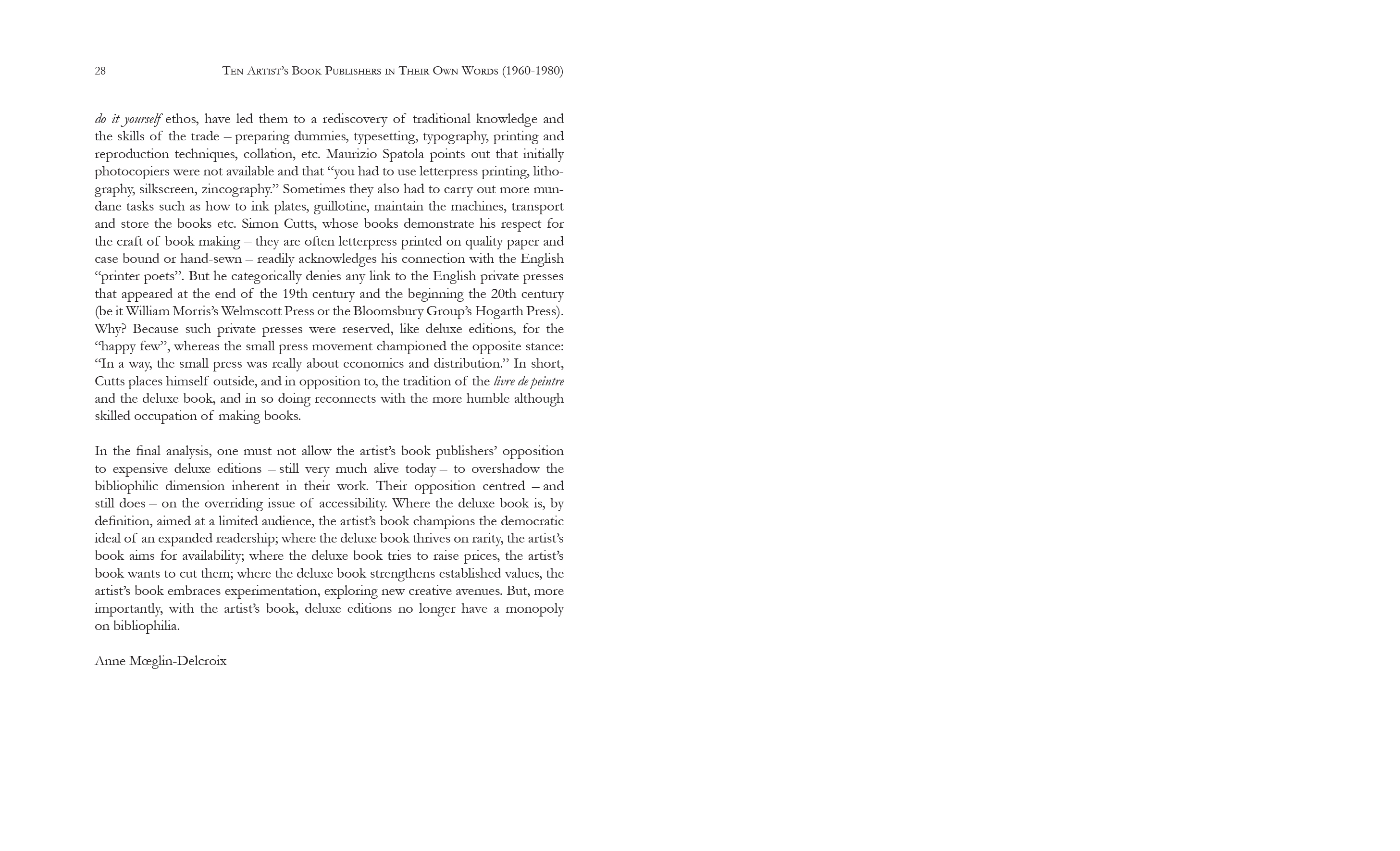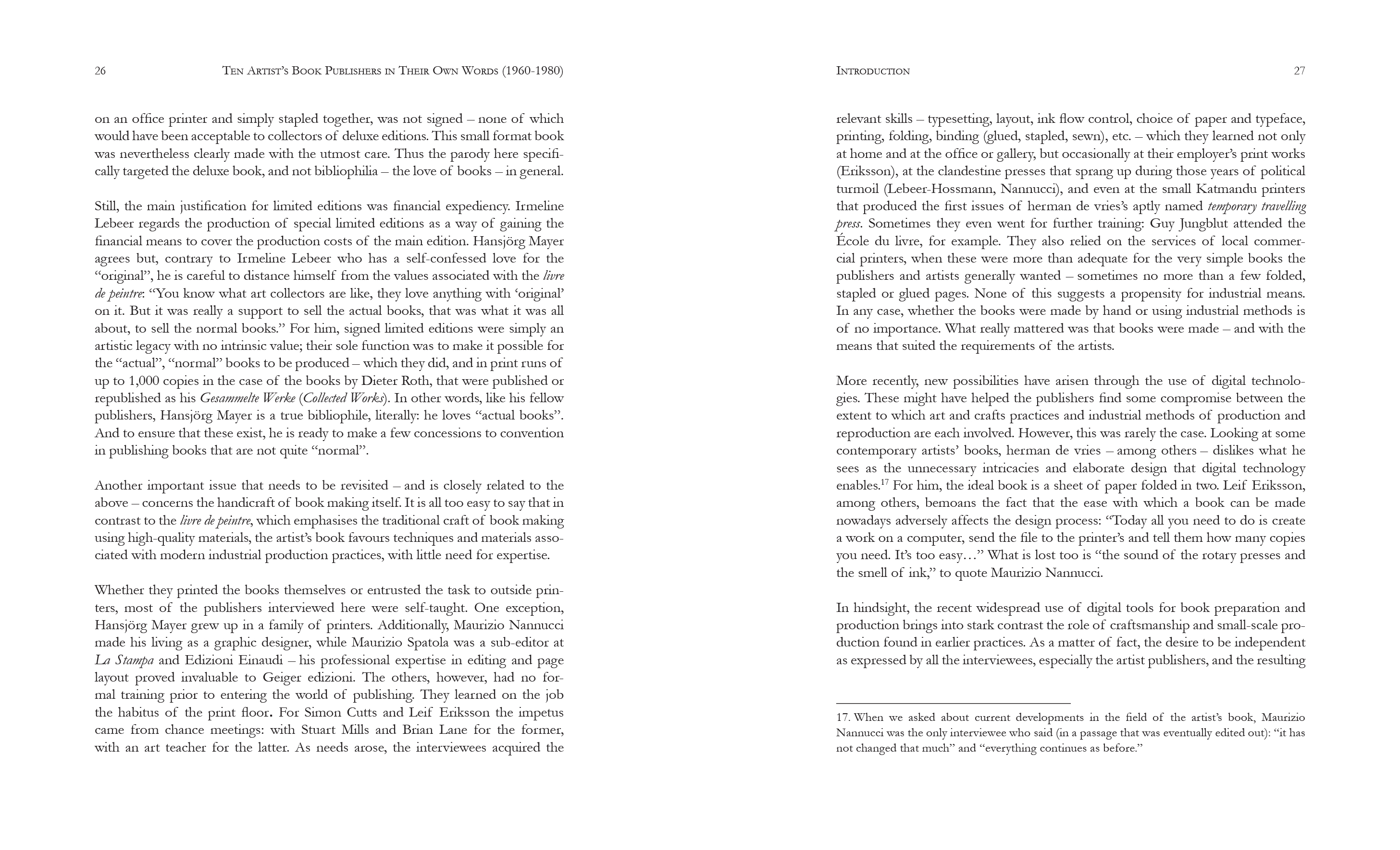 Cet ouvrage recueille les témoignages, en anglais, d'un ensemble d'éditeurs de livres d'artistes parmi les premiers. Durant les deux décennies fondatrices 1960 et 1970, ils ont été des pionniers dans le pays où ils exerçaient et où certains exercent encore : Hansjörg Mayer en Allemagne, Simon Cutts en Grande-Bretagne, Leif Eriksson en Suède.