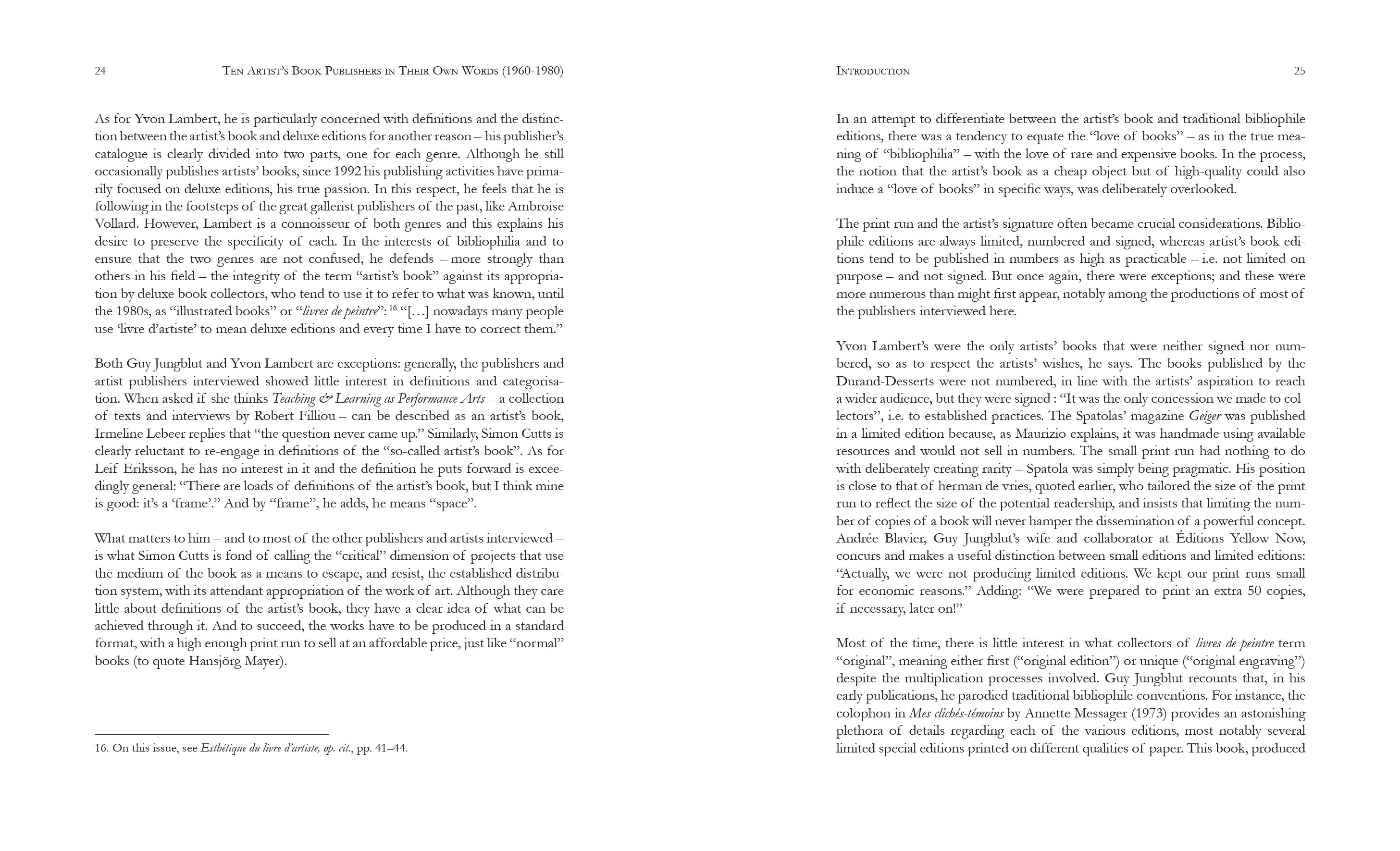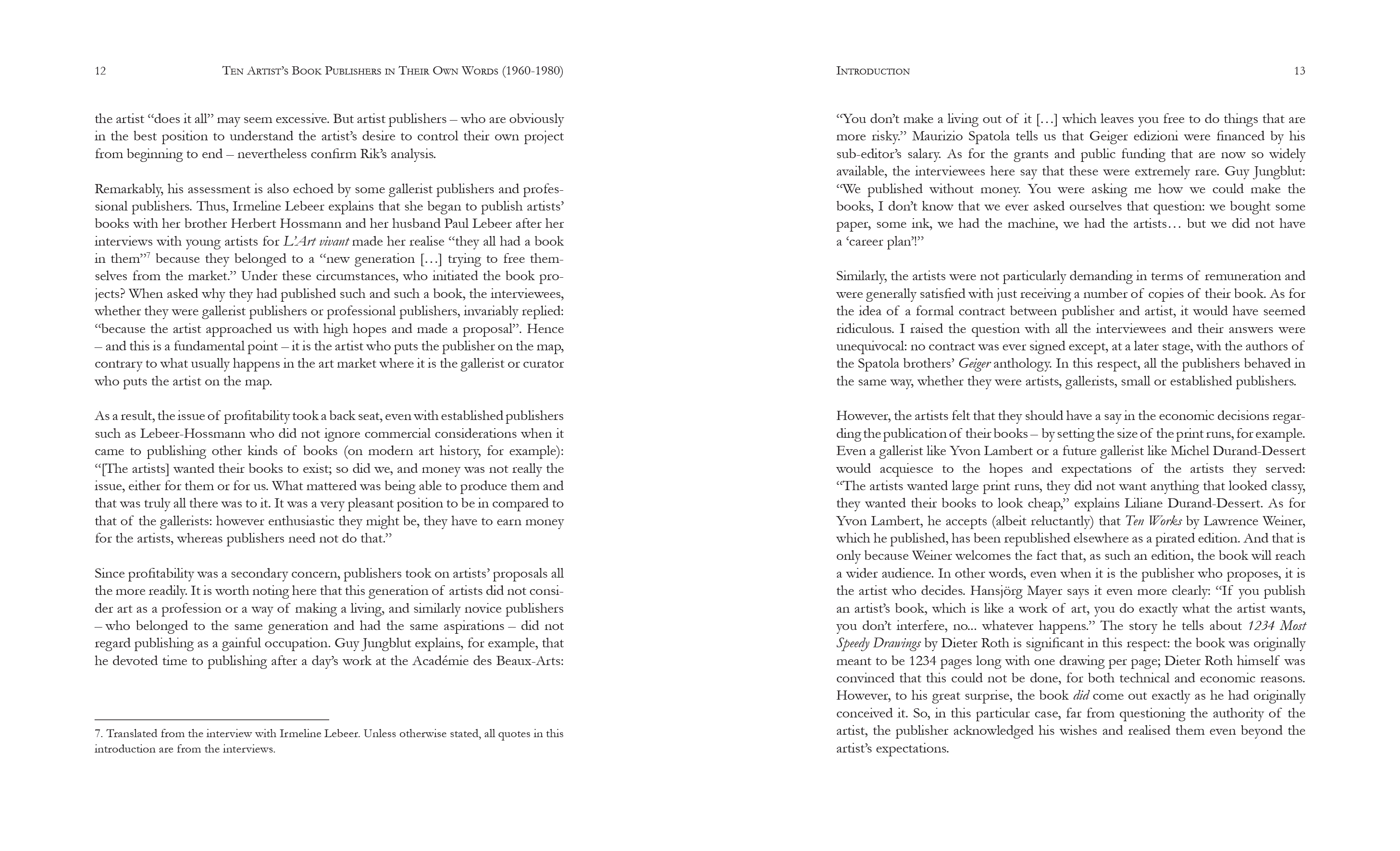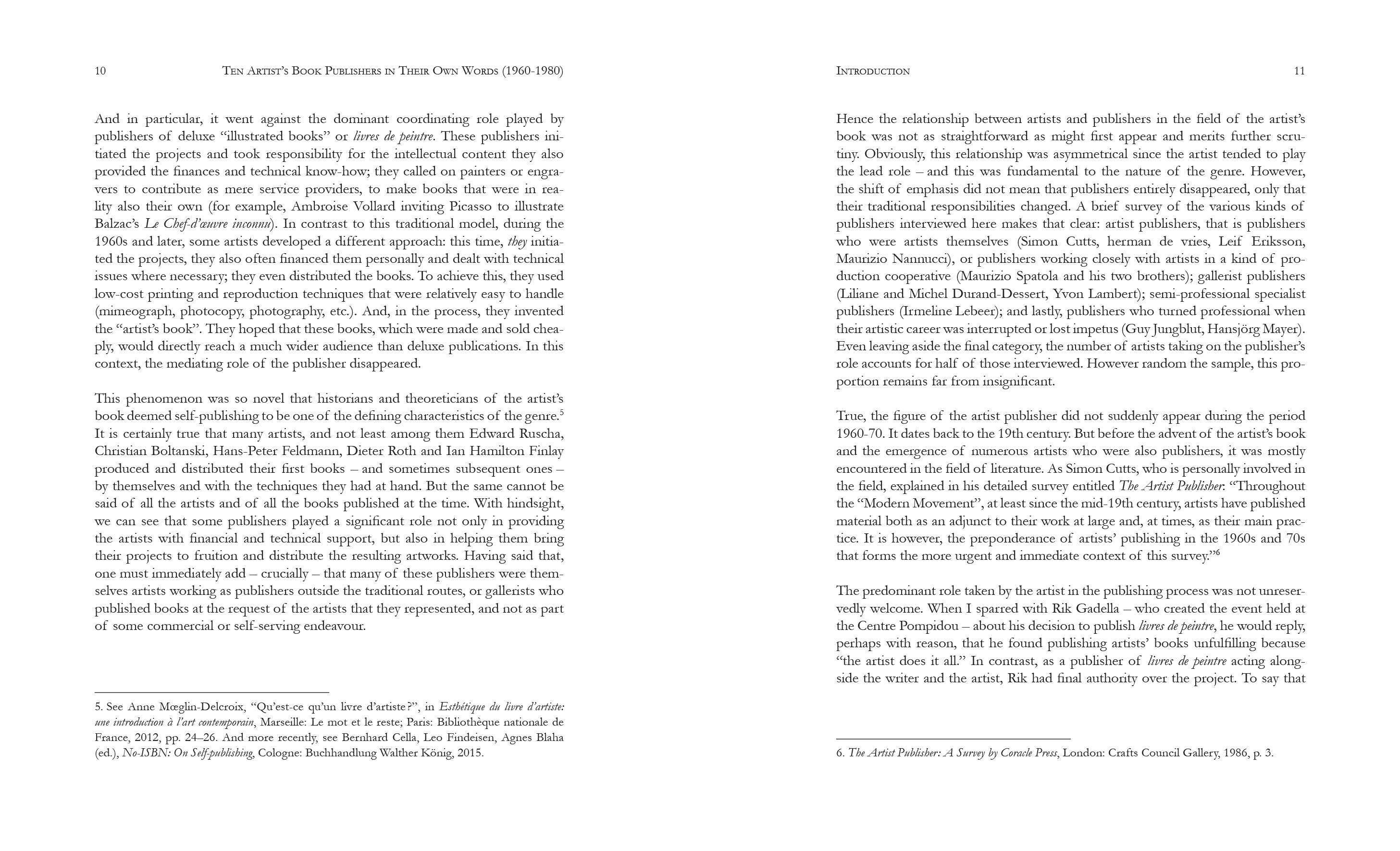 « La question de la relation entre l'artiste et l'éditeur dans le champ du livre d'artiste est moins simple qu'il n'y paraît. Il ressort avec évidence que le couple est asymétrique : l'artiste y tient le premier rôle et là est bien la spécificité de cette relation. Cependant, l'effacement de l'éditeur au profit de l'artiste ne signifie pas sa disparition complète, mais il marque la mutation de sa mission traditionnelle. »
