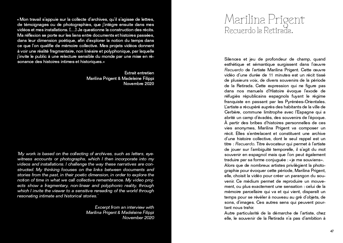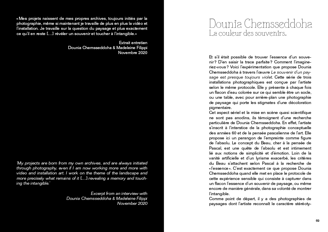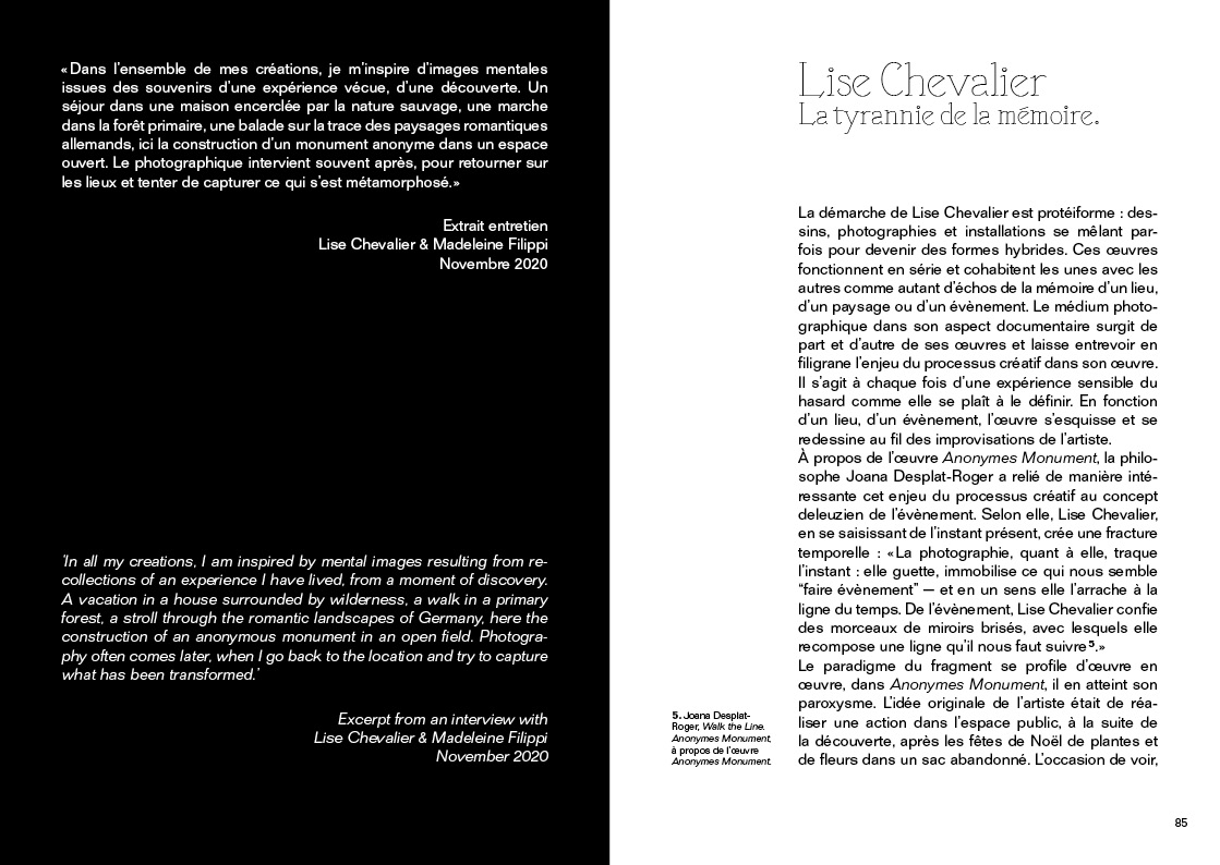 L'ouvrage se déploie à la manière d'une exposition. Chaque texte est à la fois indépendant et attaché à cette réflexion commune. Il n'y a pas de sens de la lecture, vous êtes ici totalement libres de passer d'une démarche artistique à une autre. Les extraits d'entretiens et d'échanges avec les artistes fonctionnent comme autant de cartels de salles. Ils évoquent le temps de la résidence. Les pièces reproduites se font écho. Elles dessinent une représentation en rhizome de la mémoire.