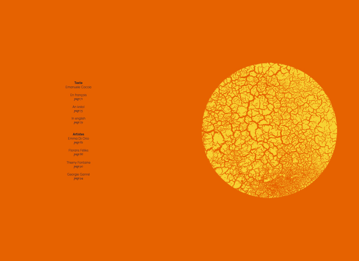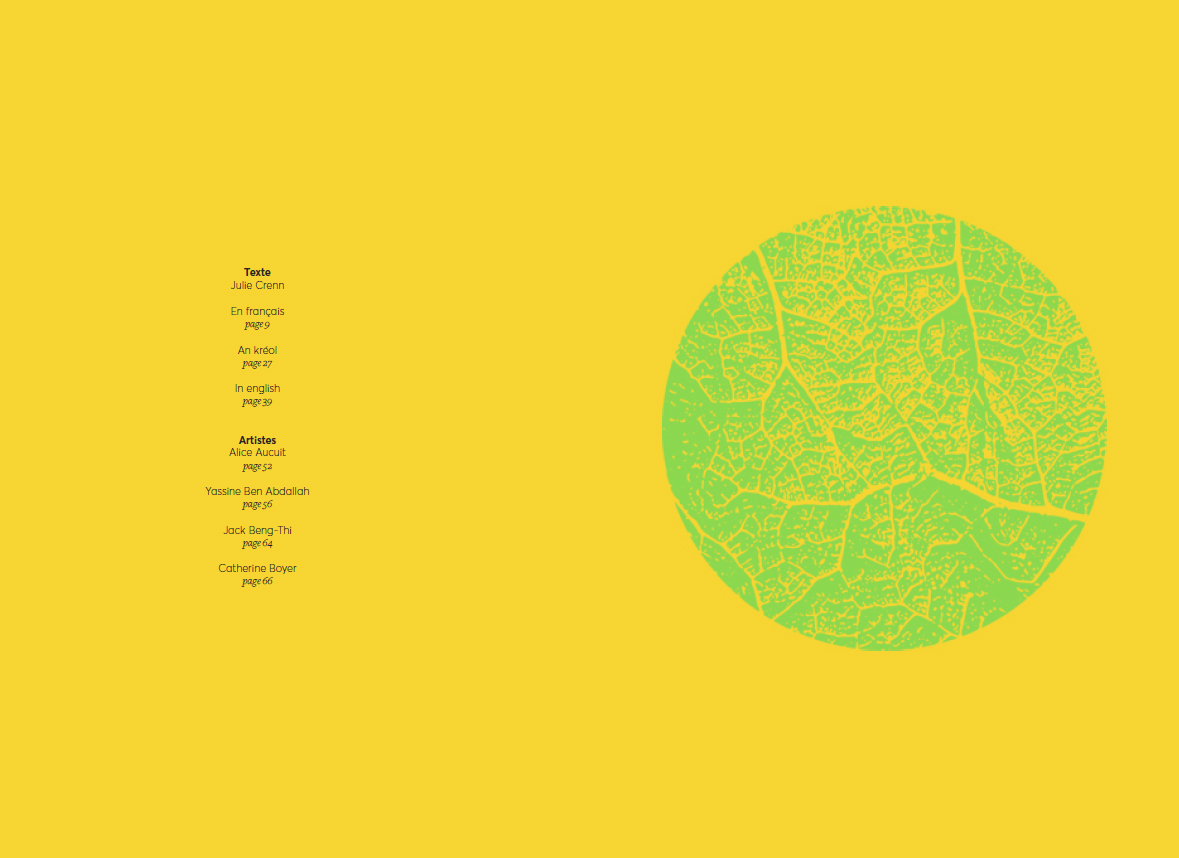 Œuvres de Chloé Robert, Emma Di Orio, Alice Aucuit, Georgie Ganné, Clotilde Provansal, Kid Kreol & Boogie, Kako & Kenkle, Tatiana Patchama, Sanjeeyann Paléatchy, Esther Hoareau, Jack Beng-Thi, Migline Paroumanou, Thierry Fontaine, Feliks Florans, Yassine Ben Abdallah.