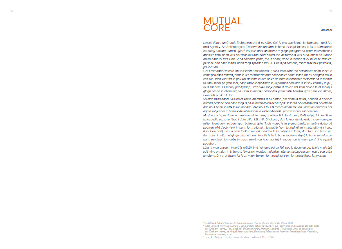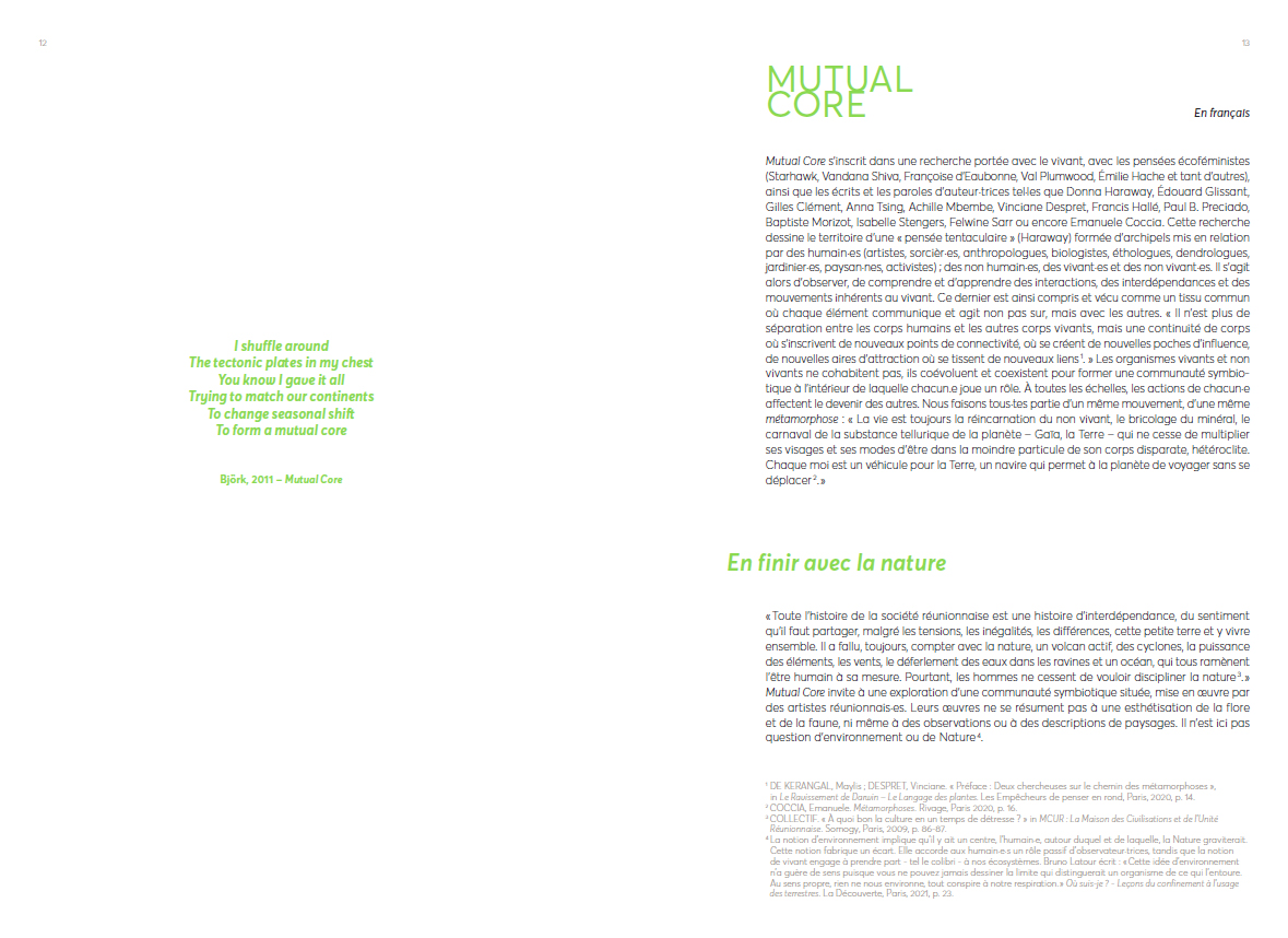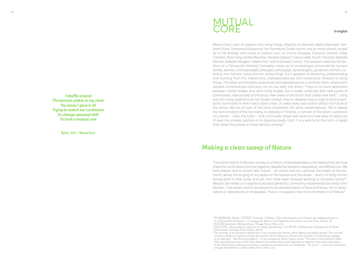 Mutual Core s'inscrit dans une recherche portée avec le vivant, avec les pensées écoféministes (Starhawk, Vandana Shiva, Françoise d'Eaubonne, Val Plumwood, Émilie Hache, etc.), ainsi que les écrits et les paroles d'auteur·trices tel·les que Donna Haraway, Édouard Glissant, Gilles Clément, Anna Tsing, Achille Mbembe, Vinciane Despret, Francis Hallé, Paul B. Preciado, Baptiste Morizot, Isabelle Stengers, Felwinne Sarr ou encore Emanuele Coccia. Cette recherche dessine le territoire d'une « pensée tentaculaire » (Haraway) formée d'archipels mis en relation par des humain·es (artistes, sorcièr·es, anthropologues, biologistes, éthologues, dendrologues, jardinier·es, paysan·nes, activistes) ; des non humain·es, des vivant·es et des non vivant·es.