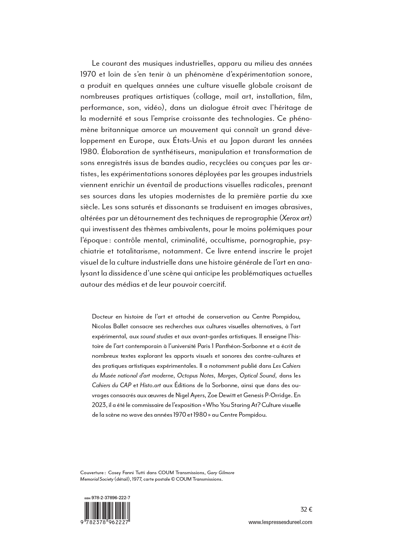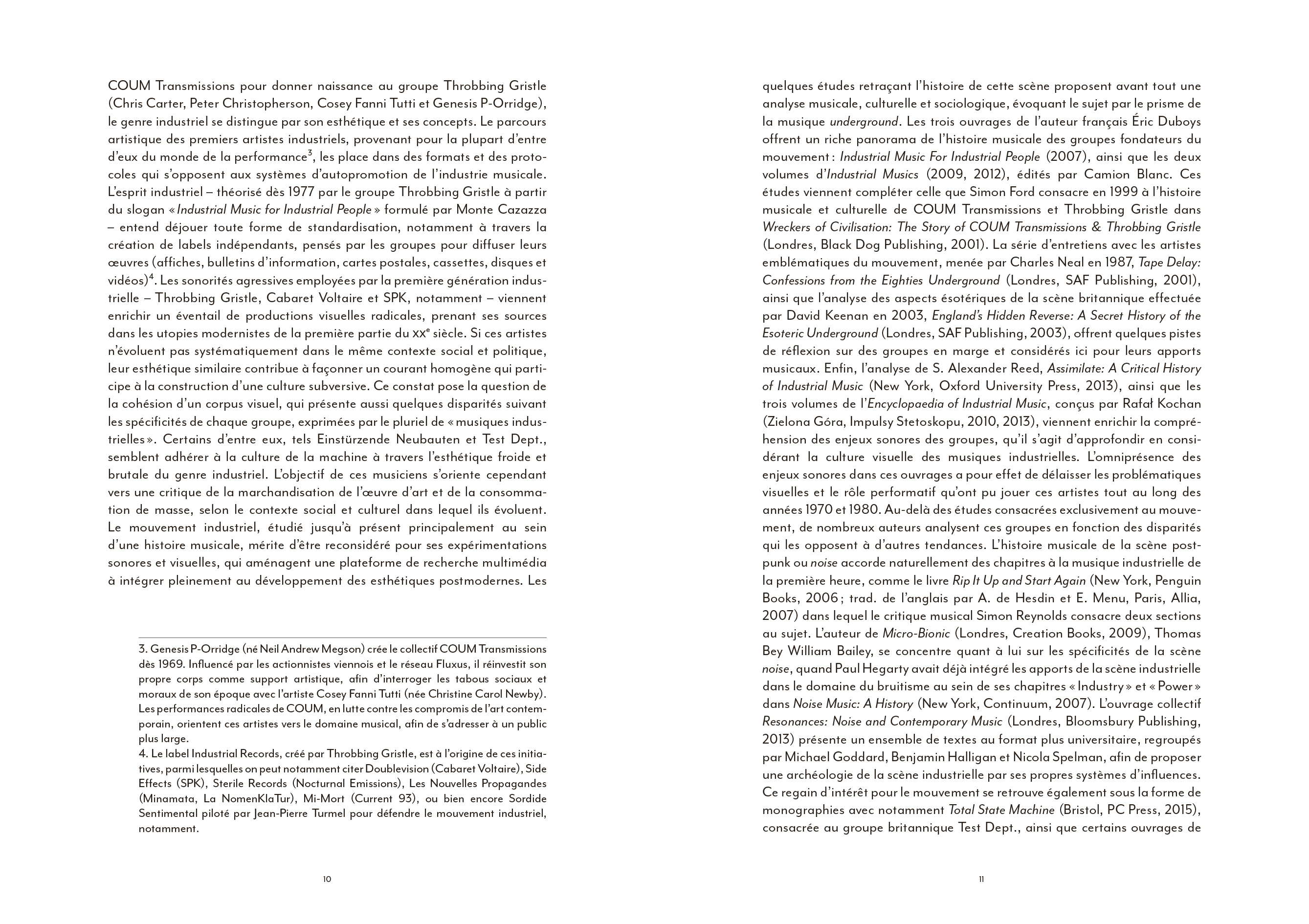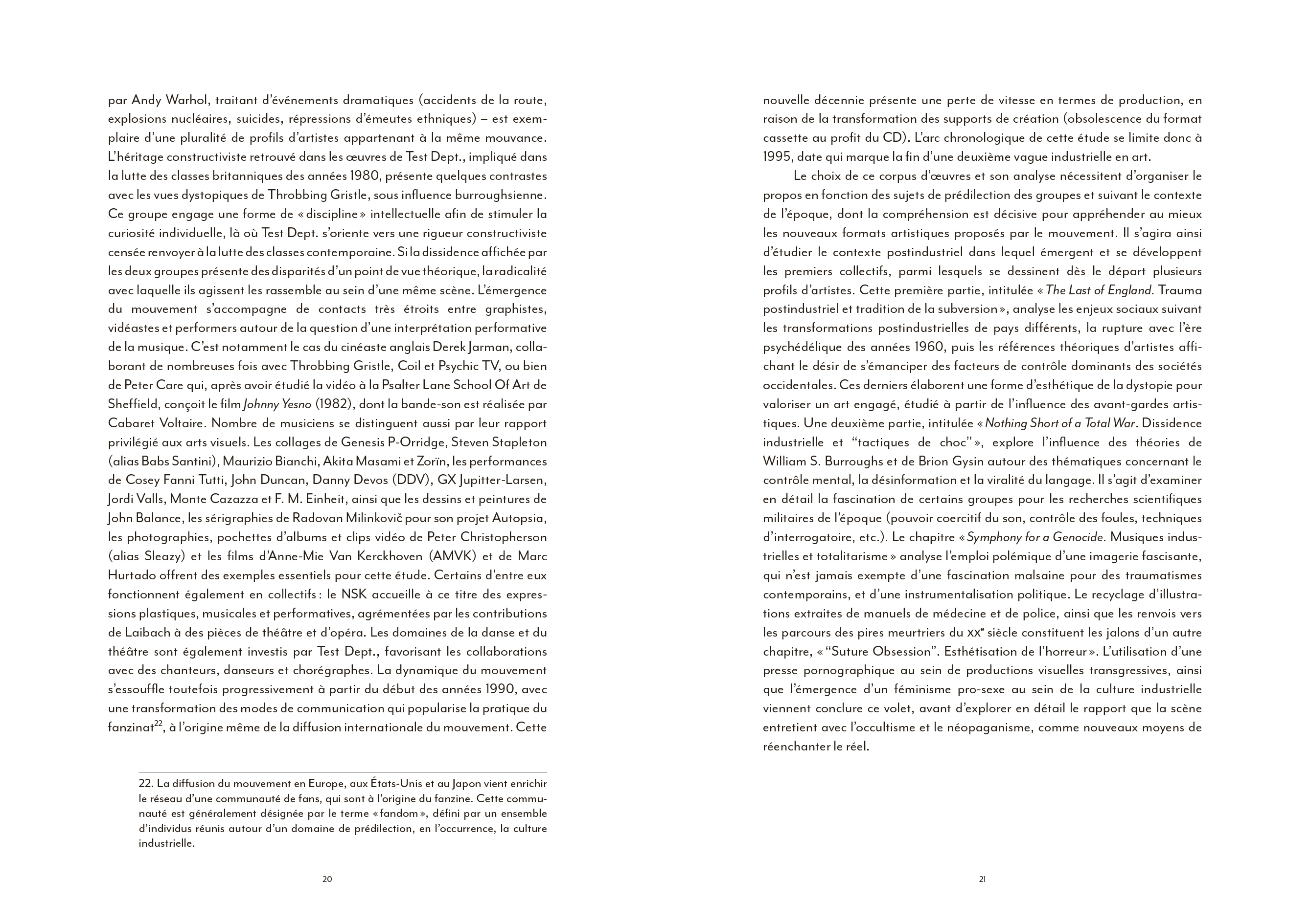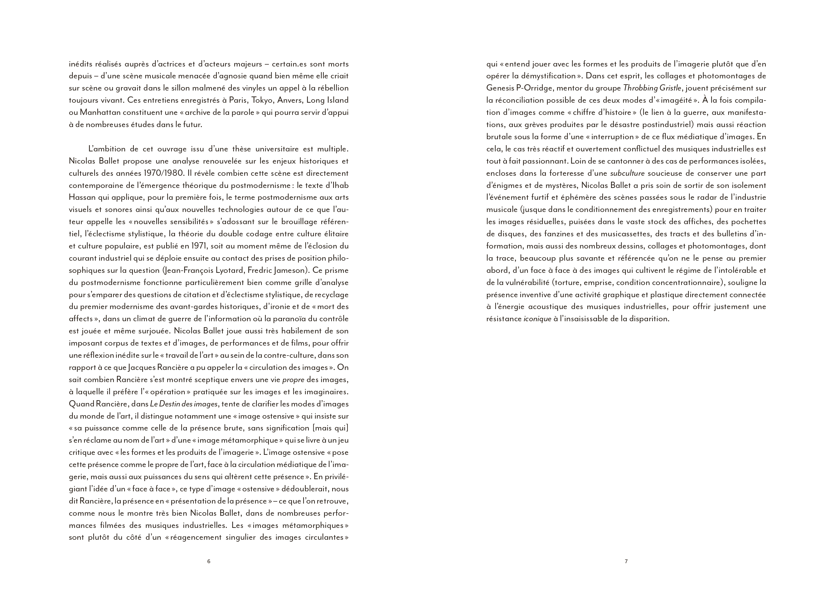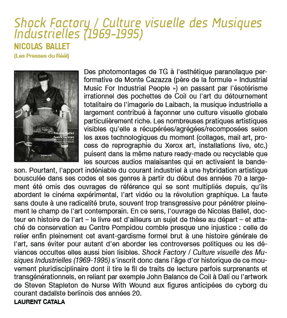 Coil ou l'art du détournement totalitaire de l'imagerie de Laibach, la musique industrielle a largement contribué à façonner une culture visuelle globale particulièrement riche. [...] Pourtant, l'apport indéniable du courant industriel à une hybridation artistique bousculée dans ses codes et ses genres à partir du début des années 70 a largement été omis des ouvrages de référence qui se sont multipliés depuis [...]. La faute sans doute à une radicalité brute, souvent trop transgressive pour pénétrer pleinement le champ de l'art contemporain. En ce sens, l'ouvrage de Nicolas Ballet comble presque une injustice : celle de relier enfin pleinement cet avant-gardisme formel brut à une histoire générale de l'art, sans éviter pour autant d'en aborder les controverses politiques ou les déviances occultes elles aussi bien lisibles.