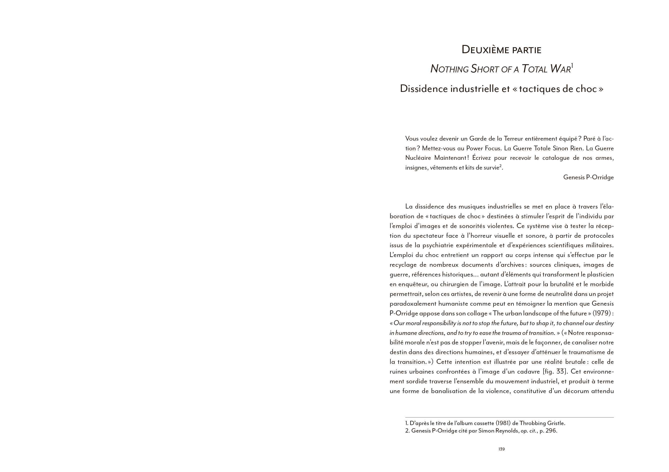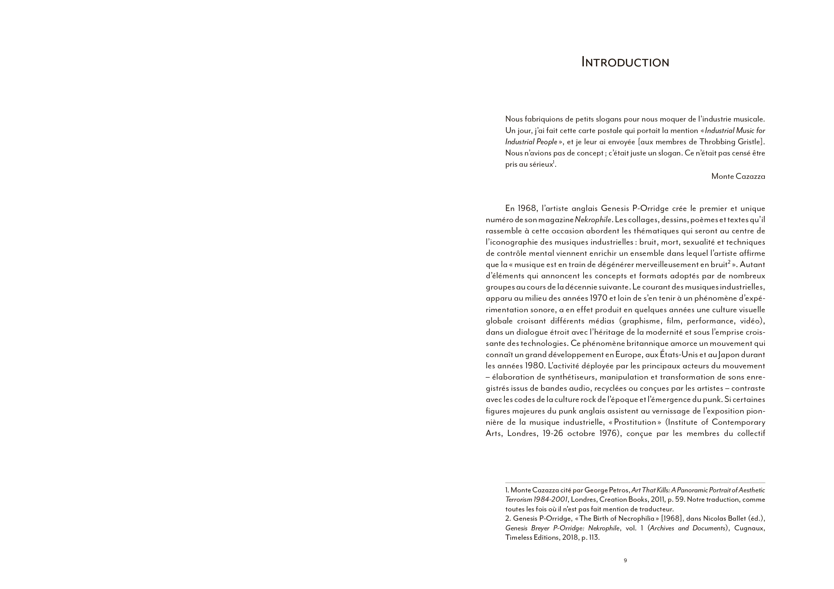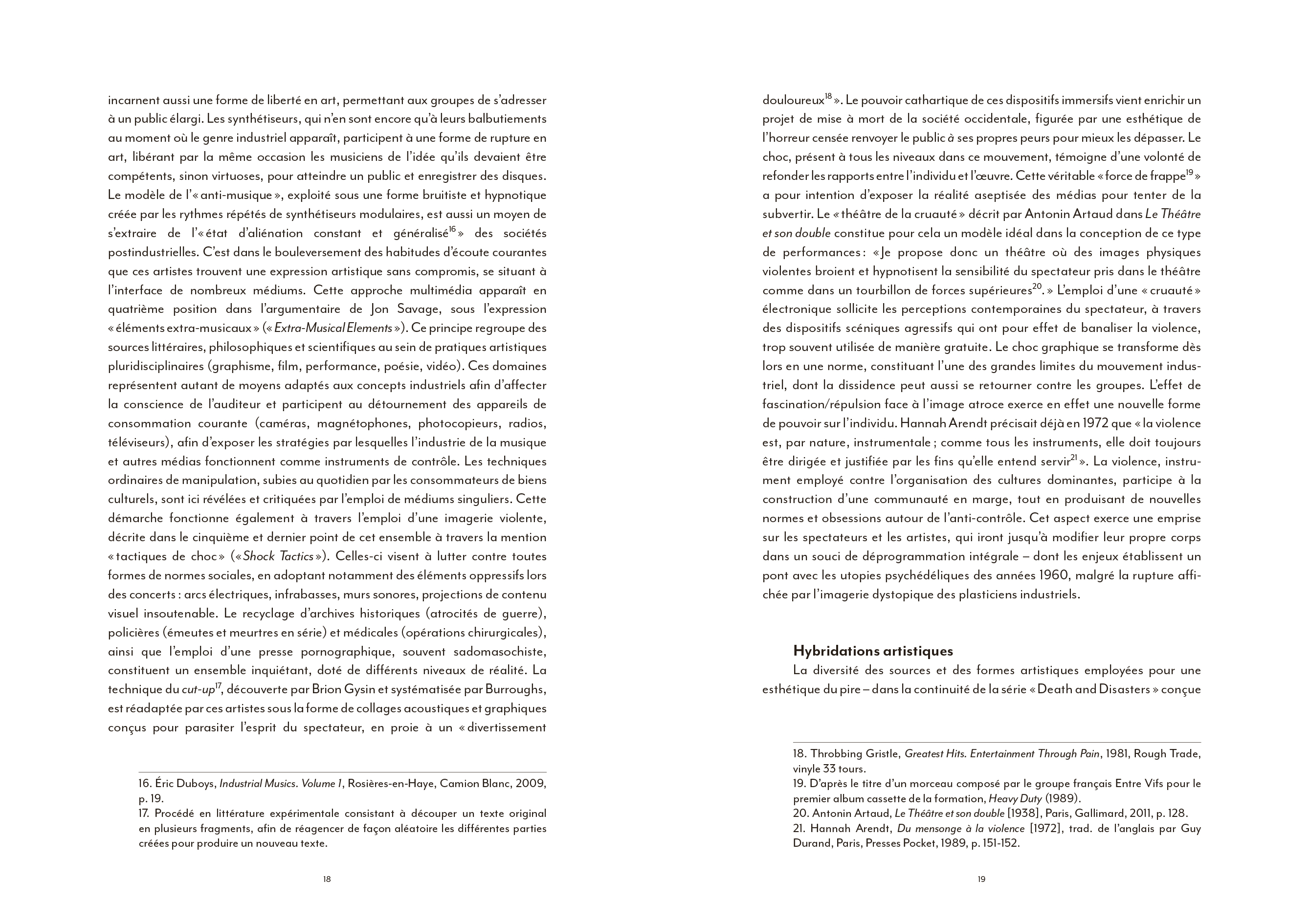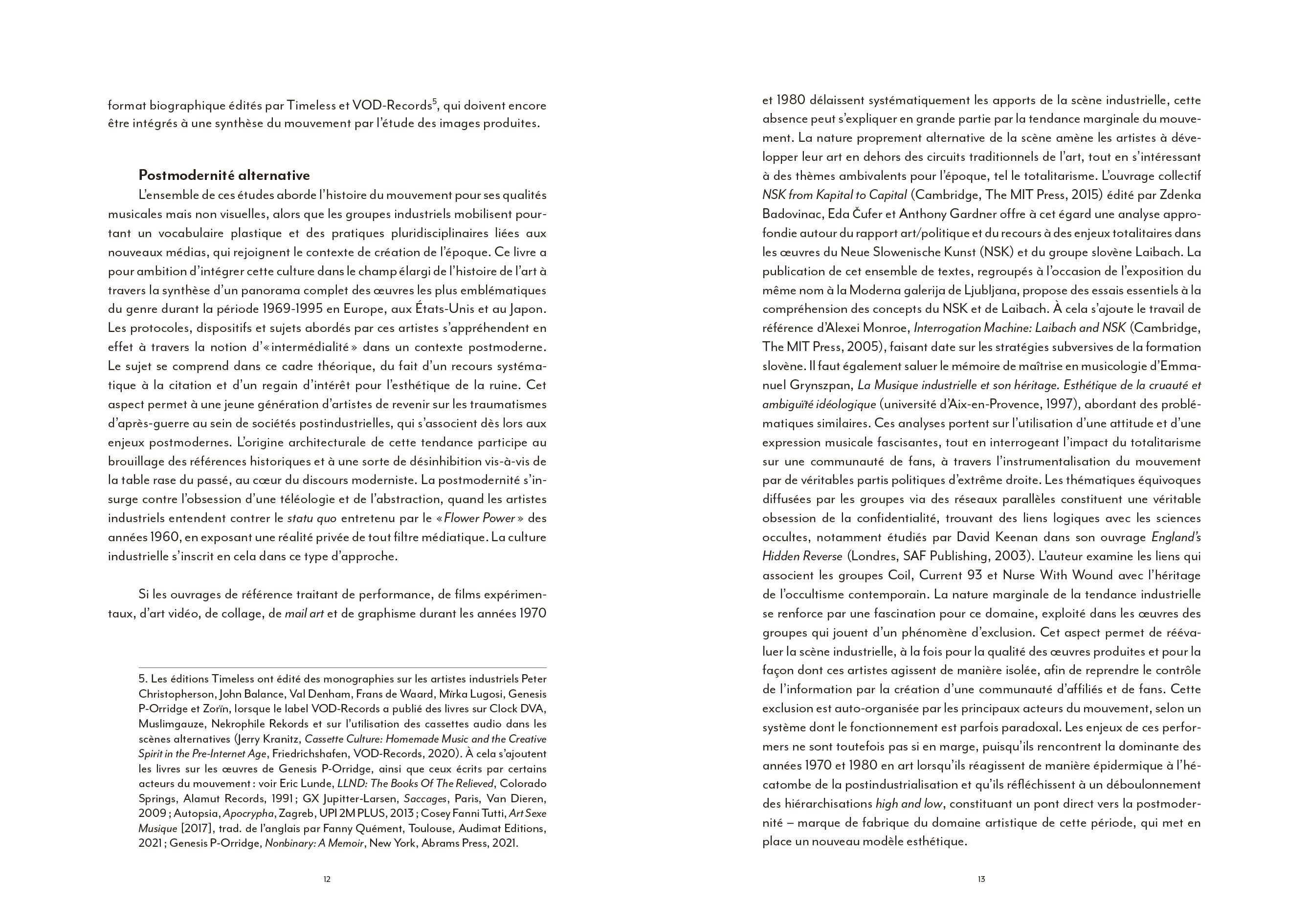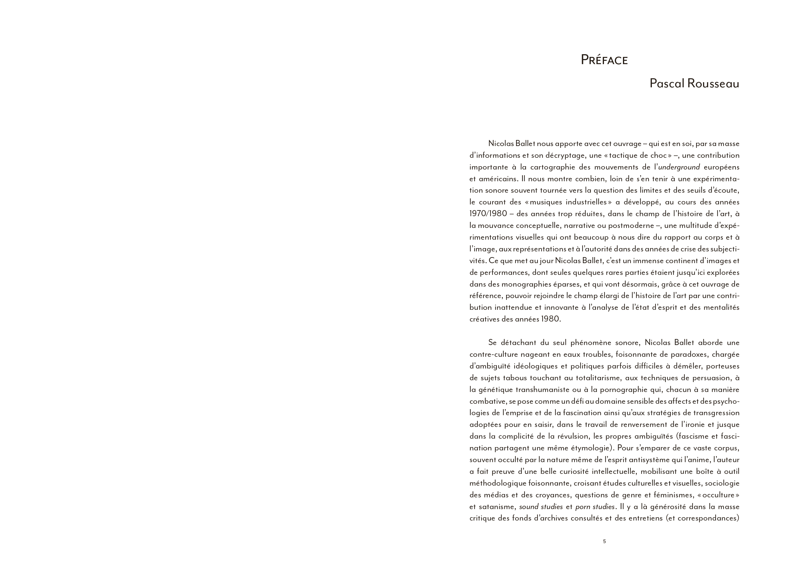 Coil ou l'art du détournement totalitaire de l'imagerie de Laibach, la musique industrielle a largement contribué à façonner une culture visuelle globale particulièrement riche. [...] Pourtant, l'apport indéniable du courant industriel à une hybridation artistique bousculée dans ses codes et ses genres à partir du début des années 70 a largement été omis des ouvrages de référence qui se sont multipliés depuis [...]. La faute sans doute à une radicalité brute, souvent trop transgressive pour pénétrer pleinement le champ de l'art contemporain. En ce sens, l'ouvrage de Nicolas Ballet comble presque une injustice : celle de relier enfin pleinement cet avant-gardisme formel brut à une histoire générale de l'art, sans éviter pour autant d'en aborder les controverses politiques ou les déviances occultes elles aussi bien lisibles.