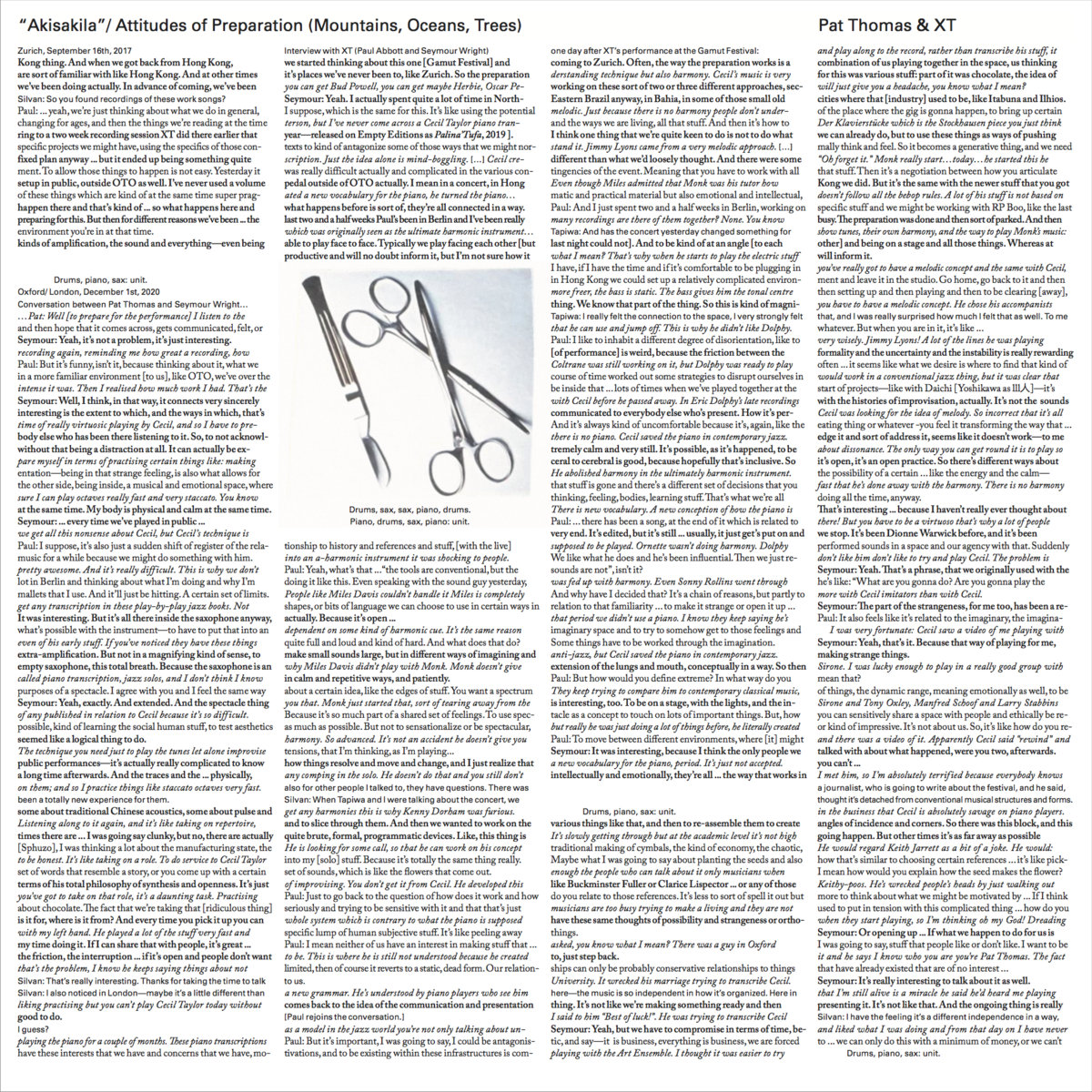 À travers les deux faces du disque (80 minutes), et les quatre panneaux de la pochette (13 331 mots), Paul Abbott, Seymour Wright et Pat Thomas réfléchissent ensemble sur (et s'inspirent de) Cecil Taylor.