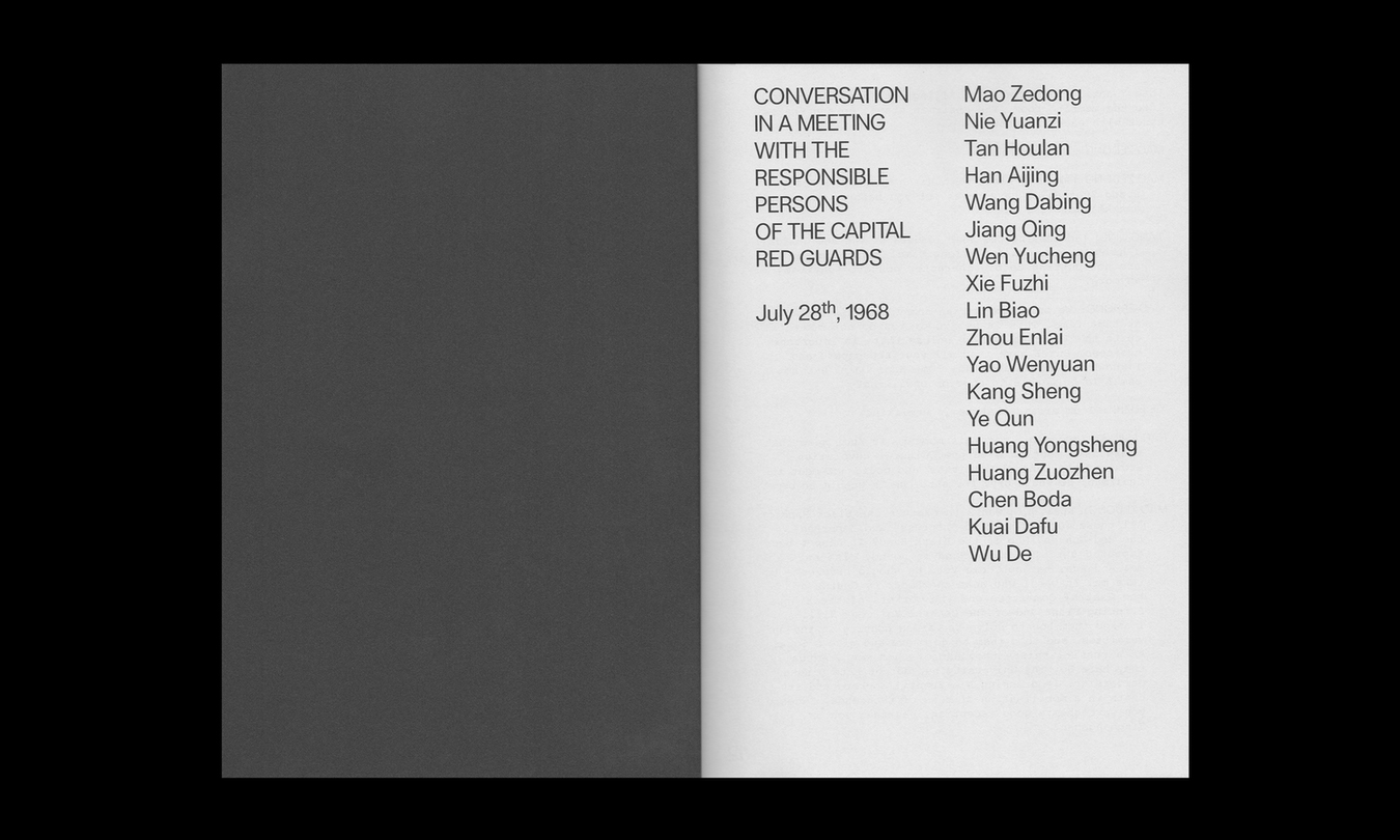La première traduction anglaise complète du document de la Révolution culturelle chinoise « Conversation in a Meeting with the Responsible Persons of the Capital Red Guards », conversation transcrite entre Mao Zedong et le Groupe central pour la révolution culturelle avec les cinq plus célèbres responsables des Gardes rouges, qui a eu lieu le 28 juin 1968 à l'université de Pékin.