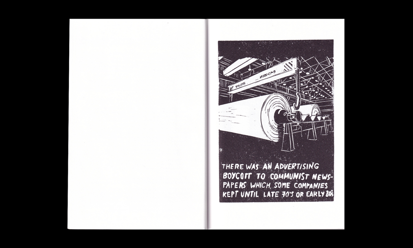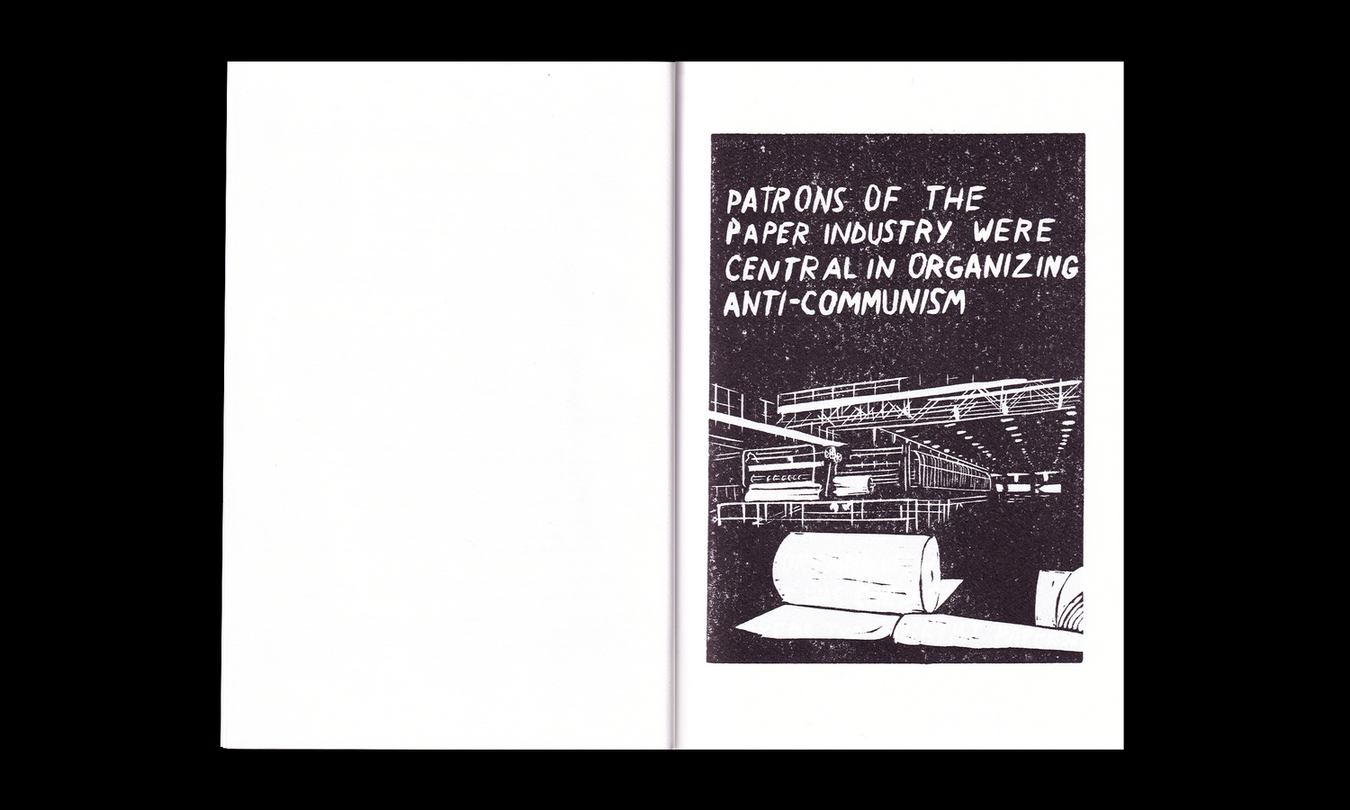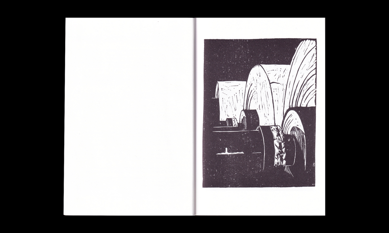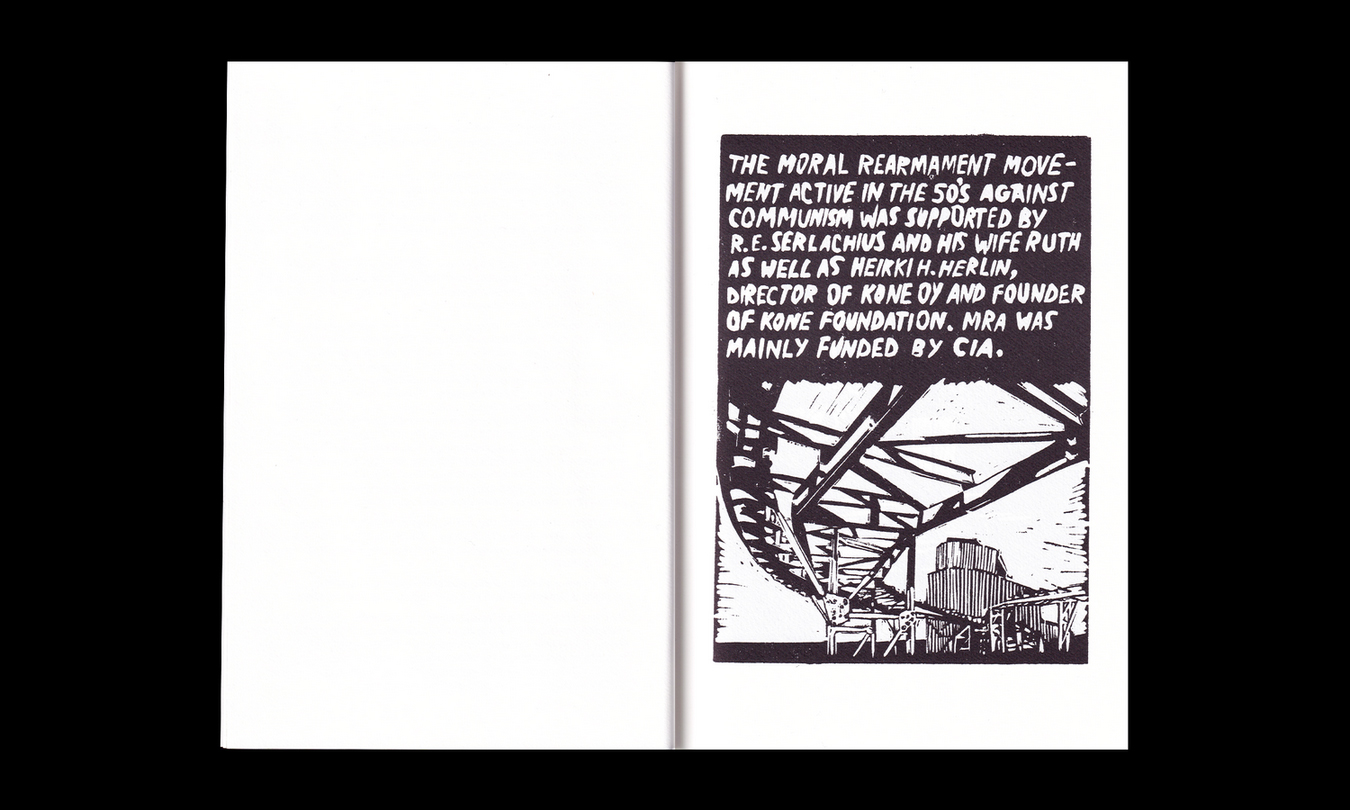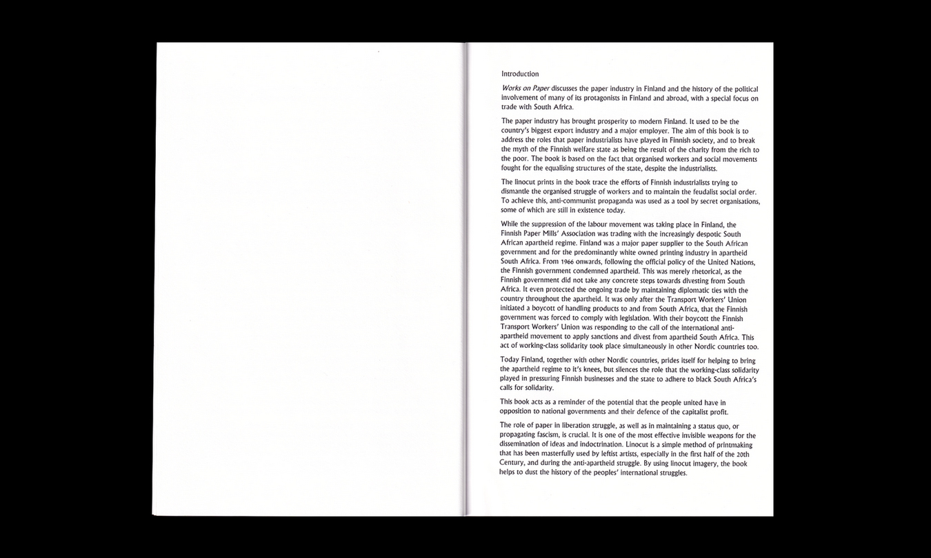 Livre d'artiste : un récit graphique engagé composé de quarante linogravures sur l'histoire politique de l'industrie du papier en Finlande.