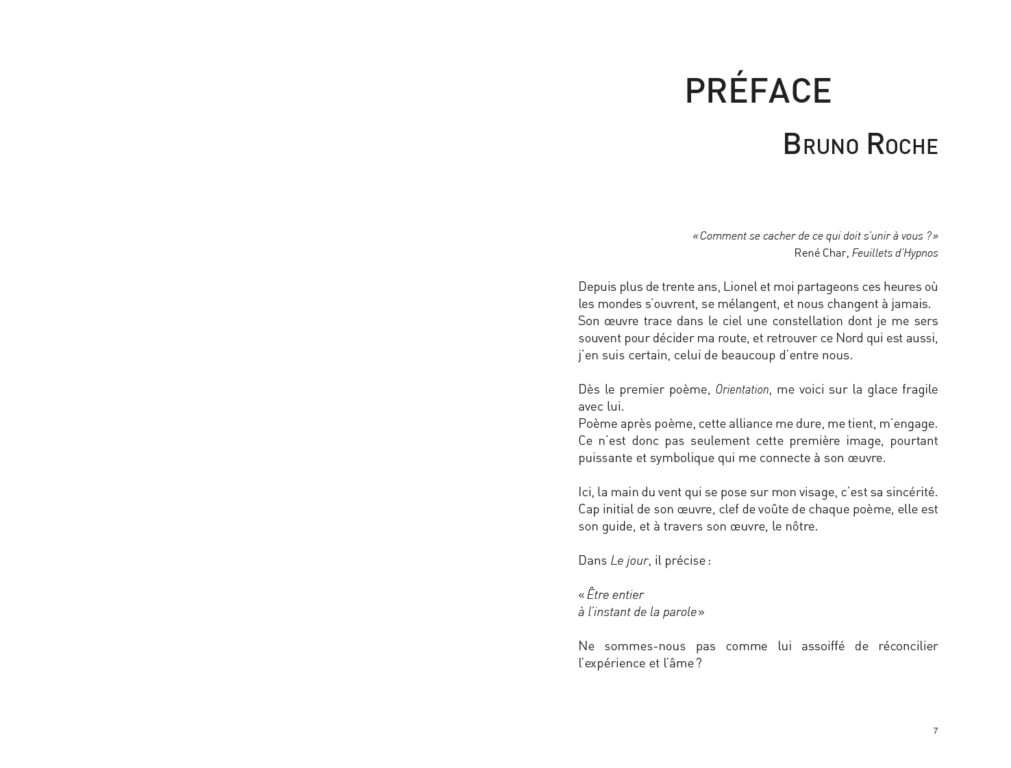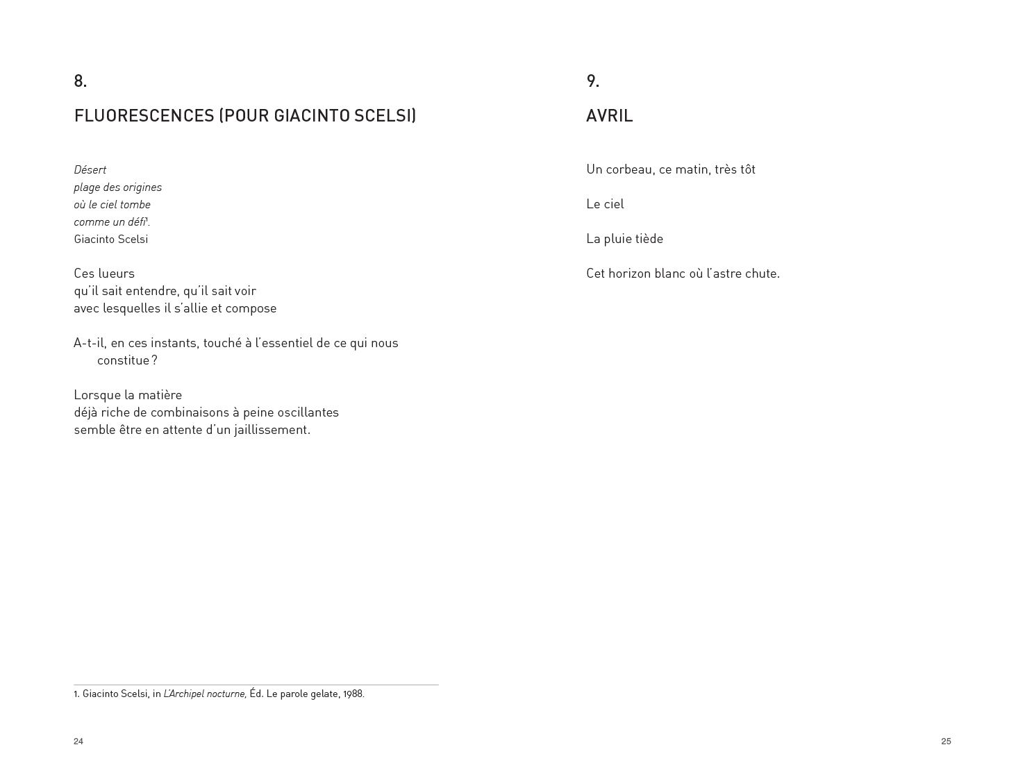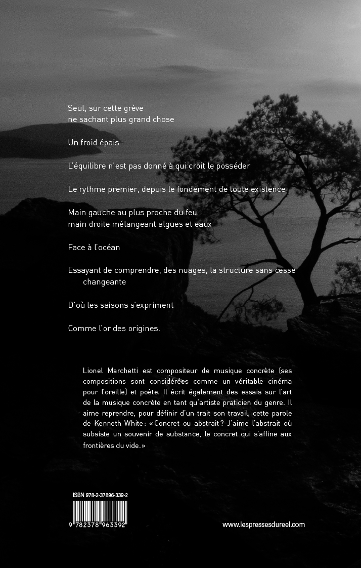 Depuis toujours, Lionel Marchetti, compositeur de musique concrète (dans un genre que l'on pourrait qualifier de cinéma pour l'oreille) écrit de la poésie. Poésie parfois liée à son parcours de musicien, mais également considérée en toute autonomie : comme une ouverture, une respiration, avec cette volonté de créer un espace autre bien qu'intimement liée au chemin de l'expérience, au quotidien (parfois le plus simple) – le réel, certainement ; dans tous les cas l'instant compris comme un espace de vie riche et plein, attrapé à pleines mains.
