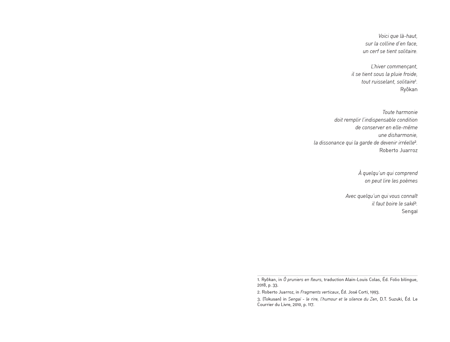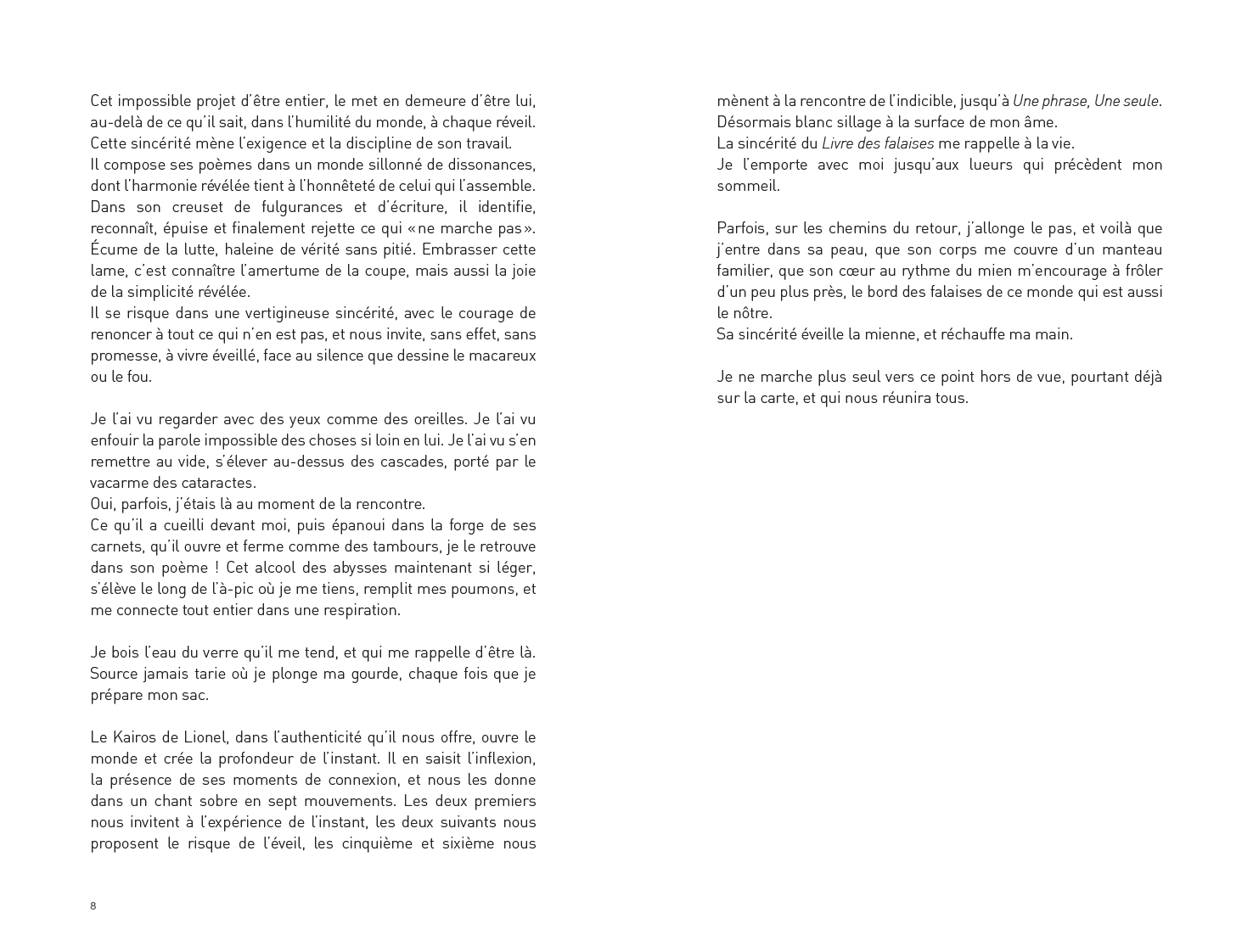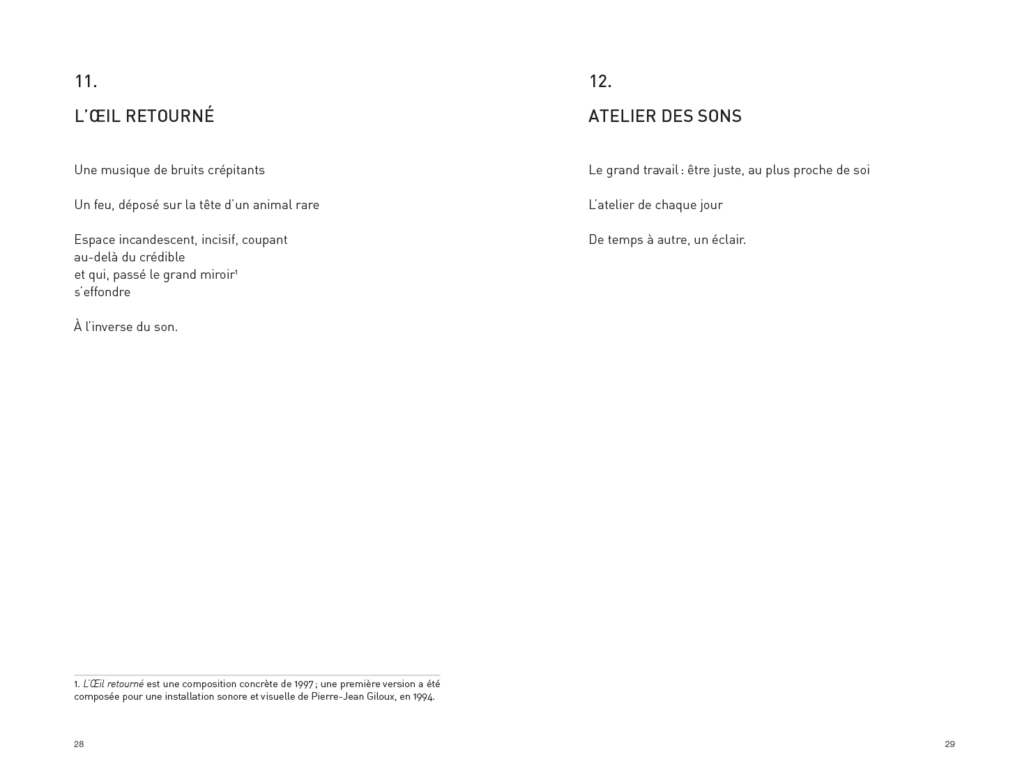 Depuis toujours, Lionel Marchetti, compositeur de musique concrète (dans un genre que l'on pourrait qualifier de cinéma pour l'oreille) écrit de la poésie. Poésie parfois liée à son parcours de musicien, mais également considérée en toute autonomie : comme une ouverture, une respiration, avec cette volonté de créer un espace autre bien qu'intimement liée au chemin de l'expérience, au quotidien (parfois le plus simple) – le réel, certainement ; dans tous les cas l'instant compris comme un espace de vie riche et plein, attrapé à pleines mains.