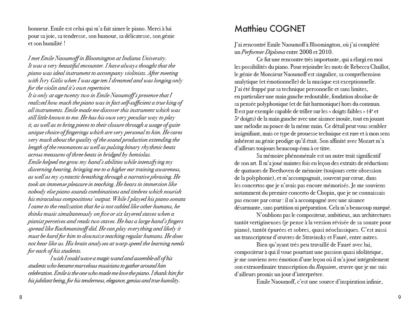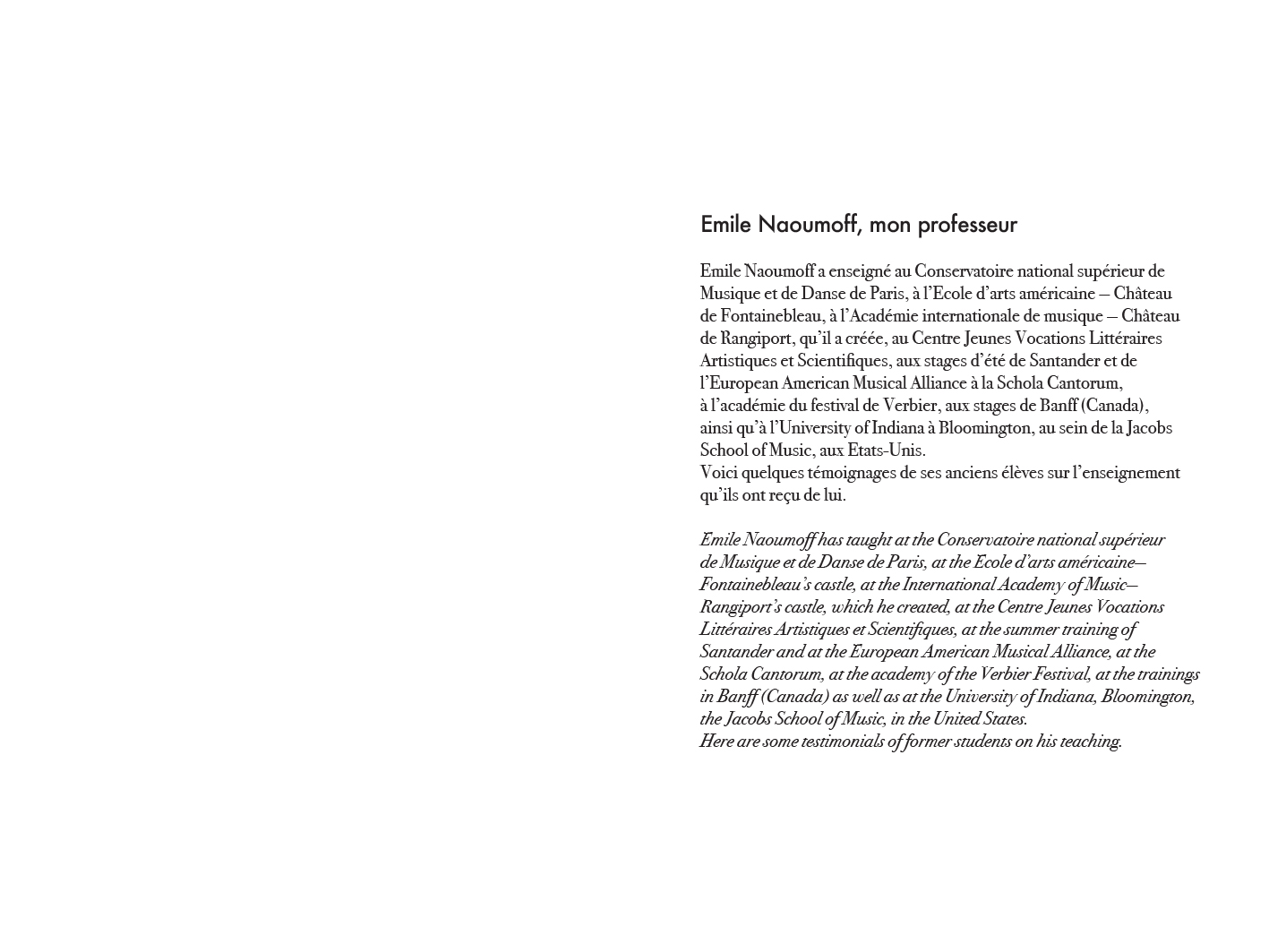 Un livret propose les témoignages de quelques-uns des anciens élèves d'Émile Naoumoff qui évoquent l'enseignement reçu par cet artiste et pédagogue d'exception.